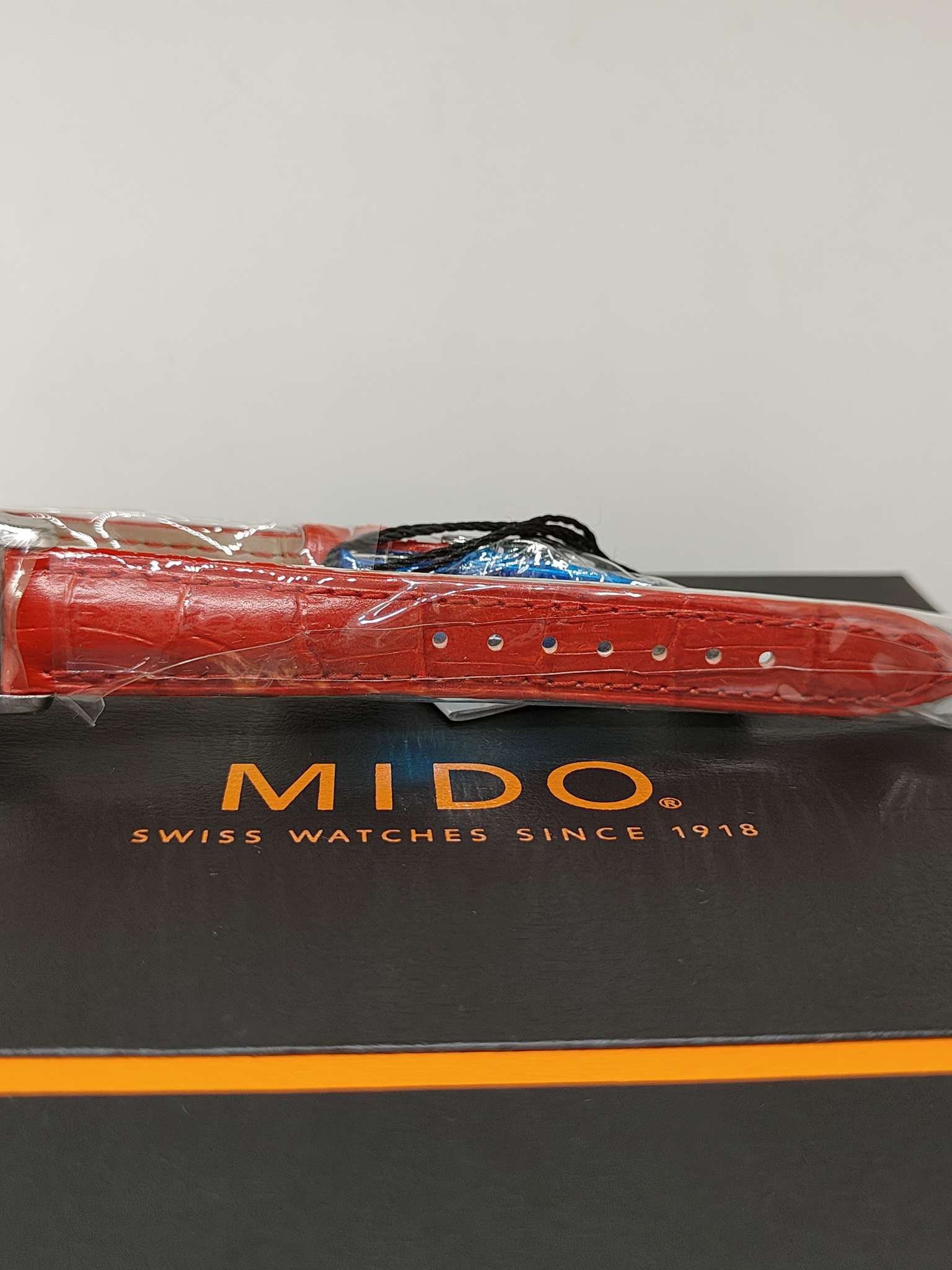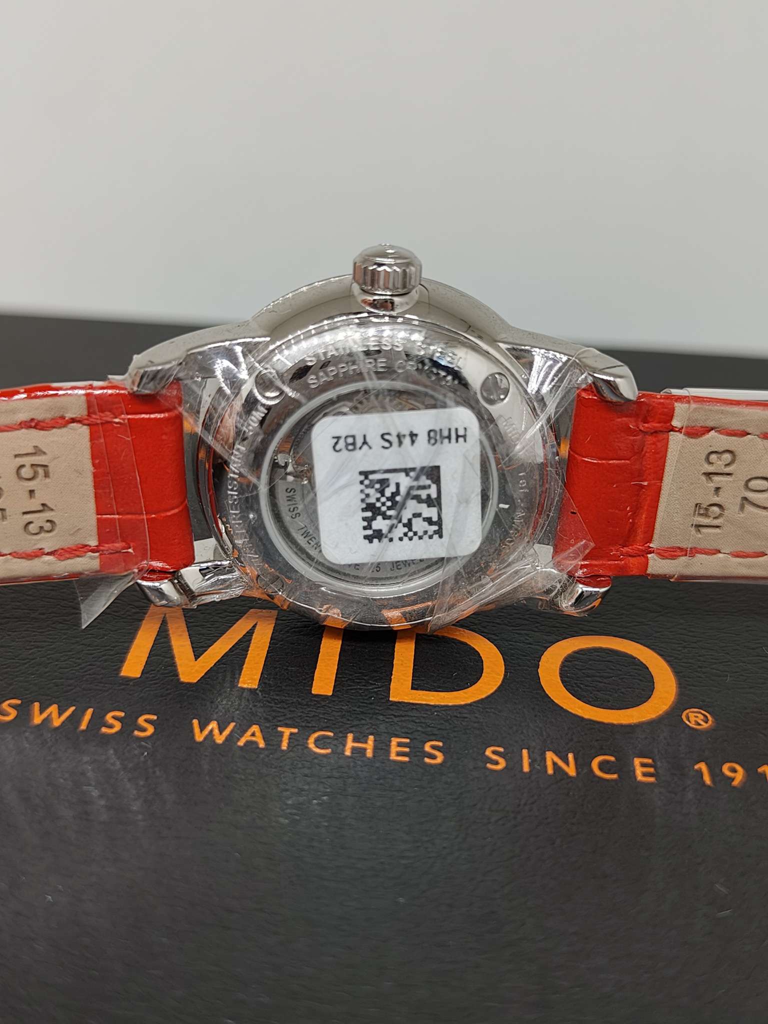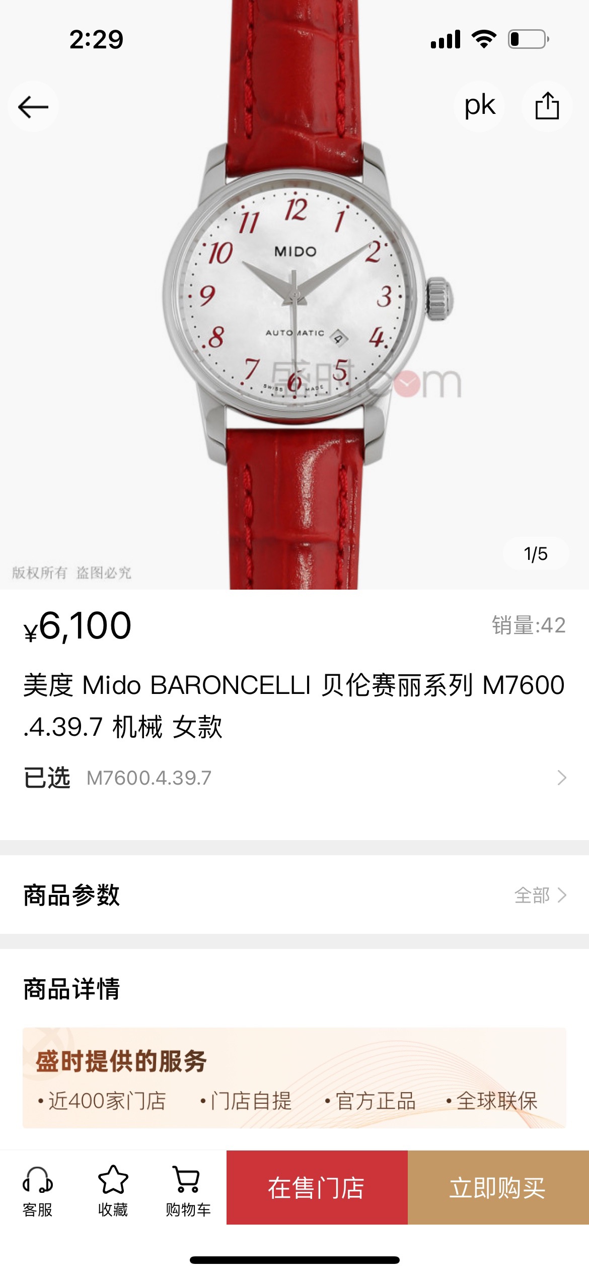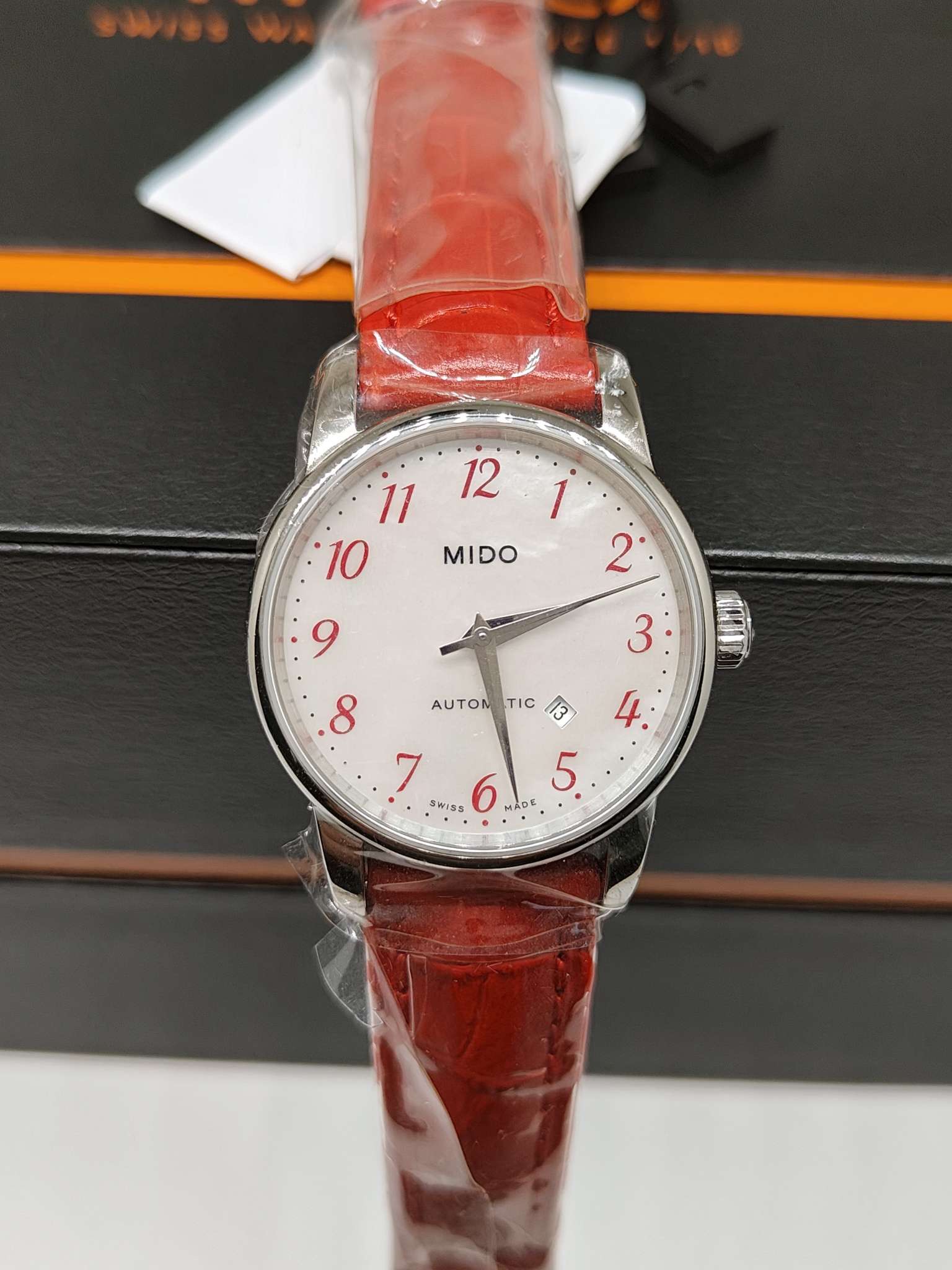美度/Mido Baroncelli II 贝伦赛丽II系列 M7600.4.39.7 自动机械机芯,银白表盘,红色表带,折叠表扣,背透表底,50米防水,日期显示,不锈钢 29毫米 专柜价6100 国行全新当天卡