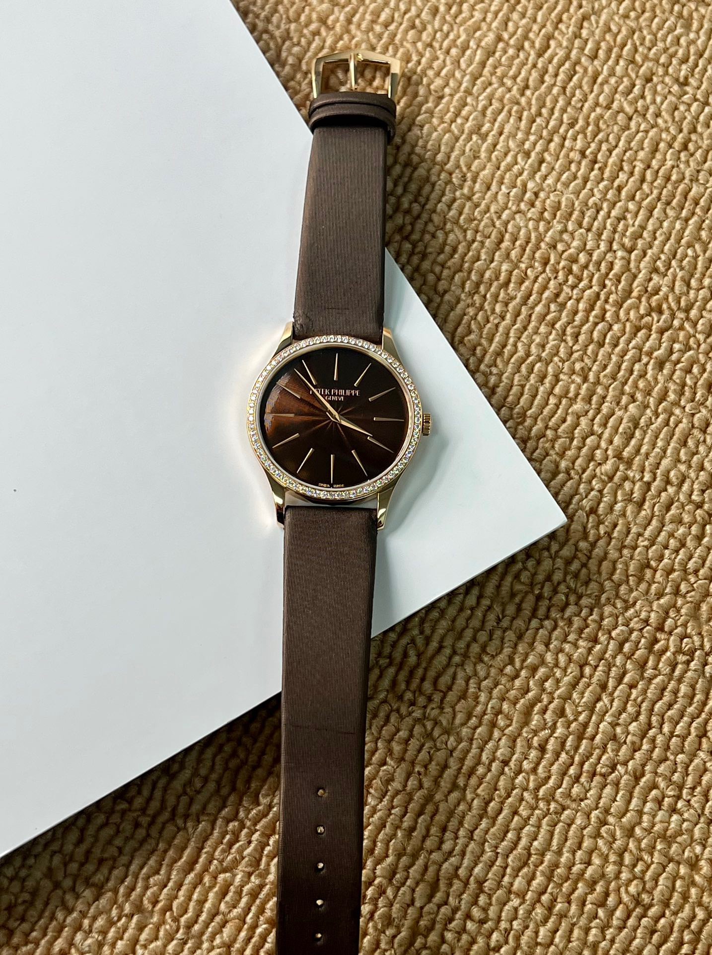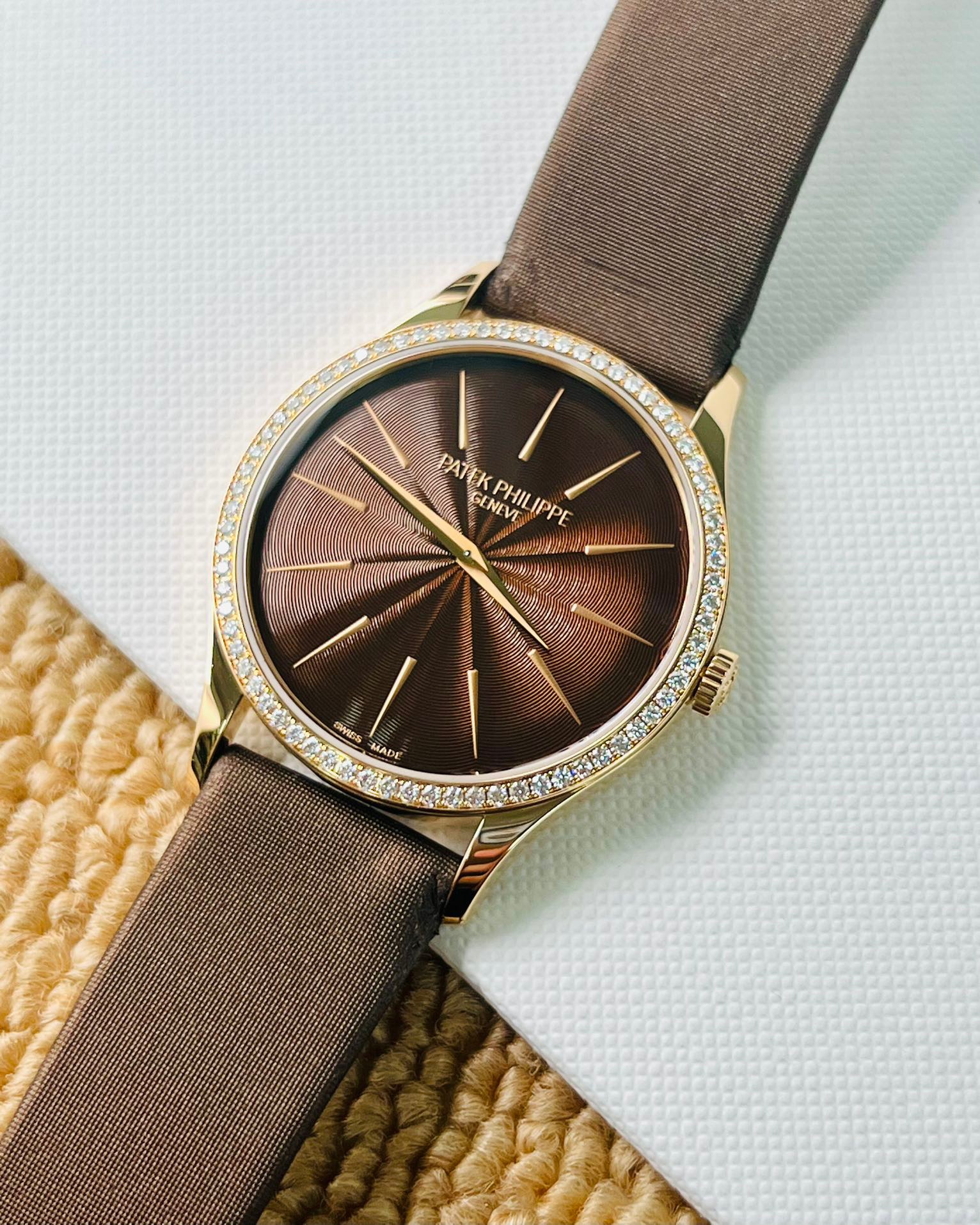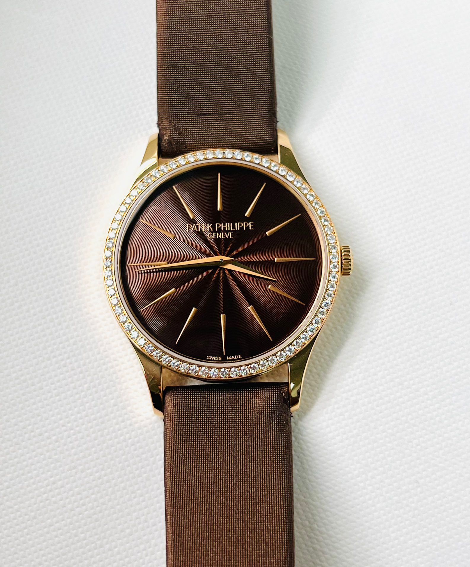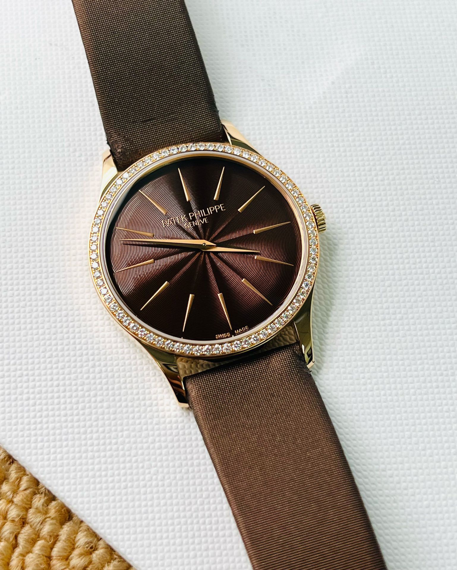 百达翡丽 古典女款4897R-001,玫瑰金原镶钻圈渐变放射咖啡盘 33mm表径 手动机械 双P印记 专柜原价211900元