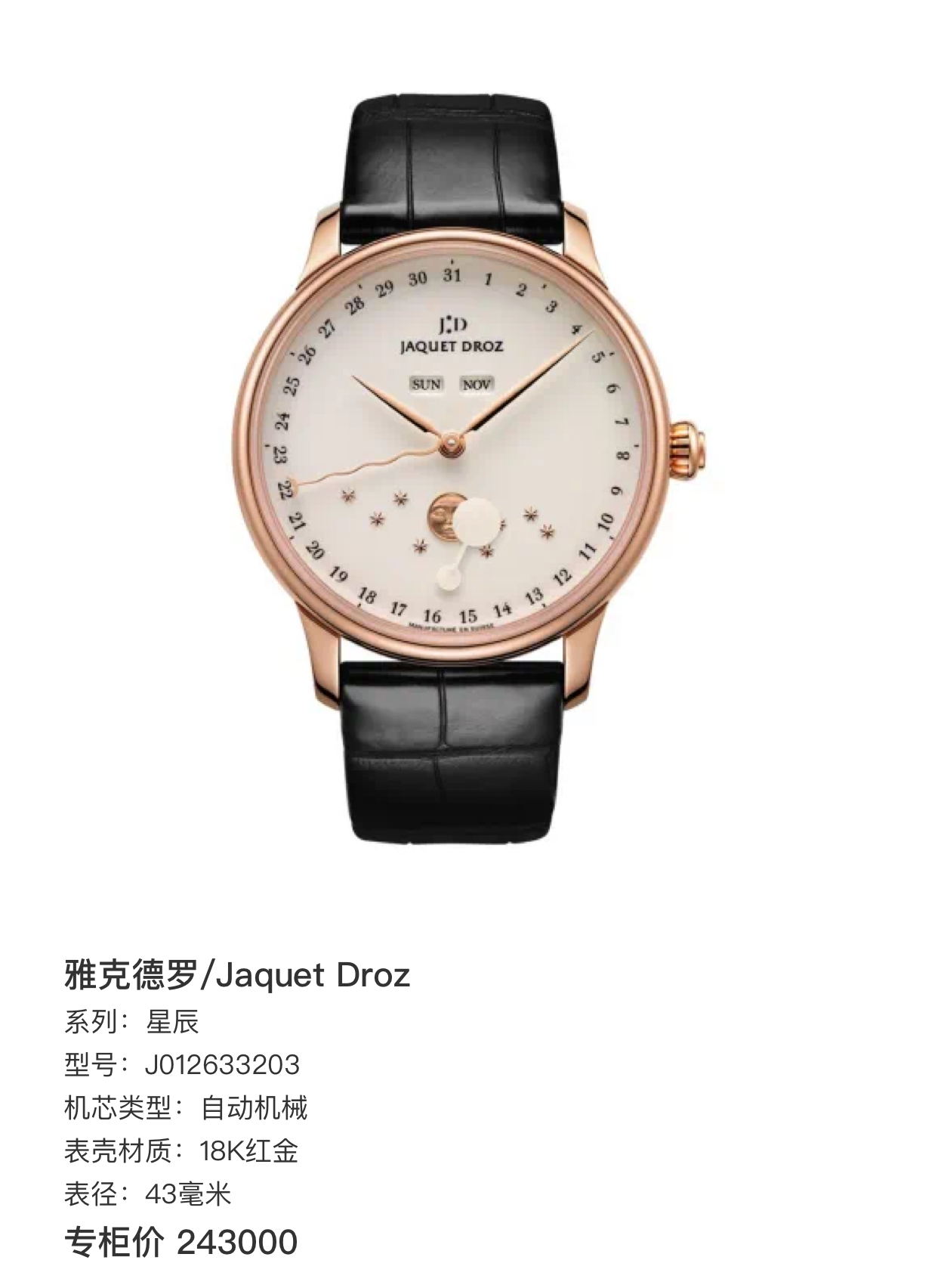 雅克德罗/Jaquet Droz 星辰 J012633203 自动机械 18K红金 43毫米 专柜价 243000。16年 无盒