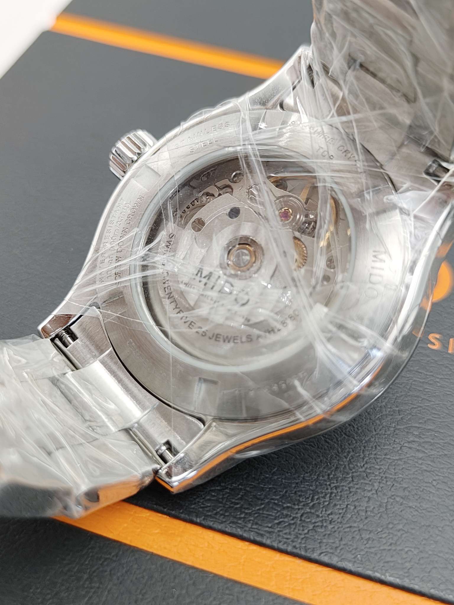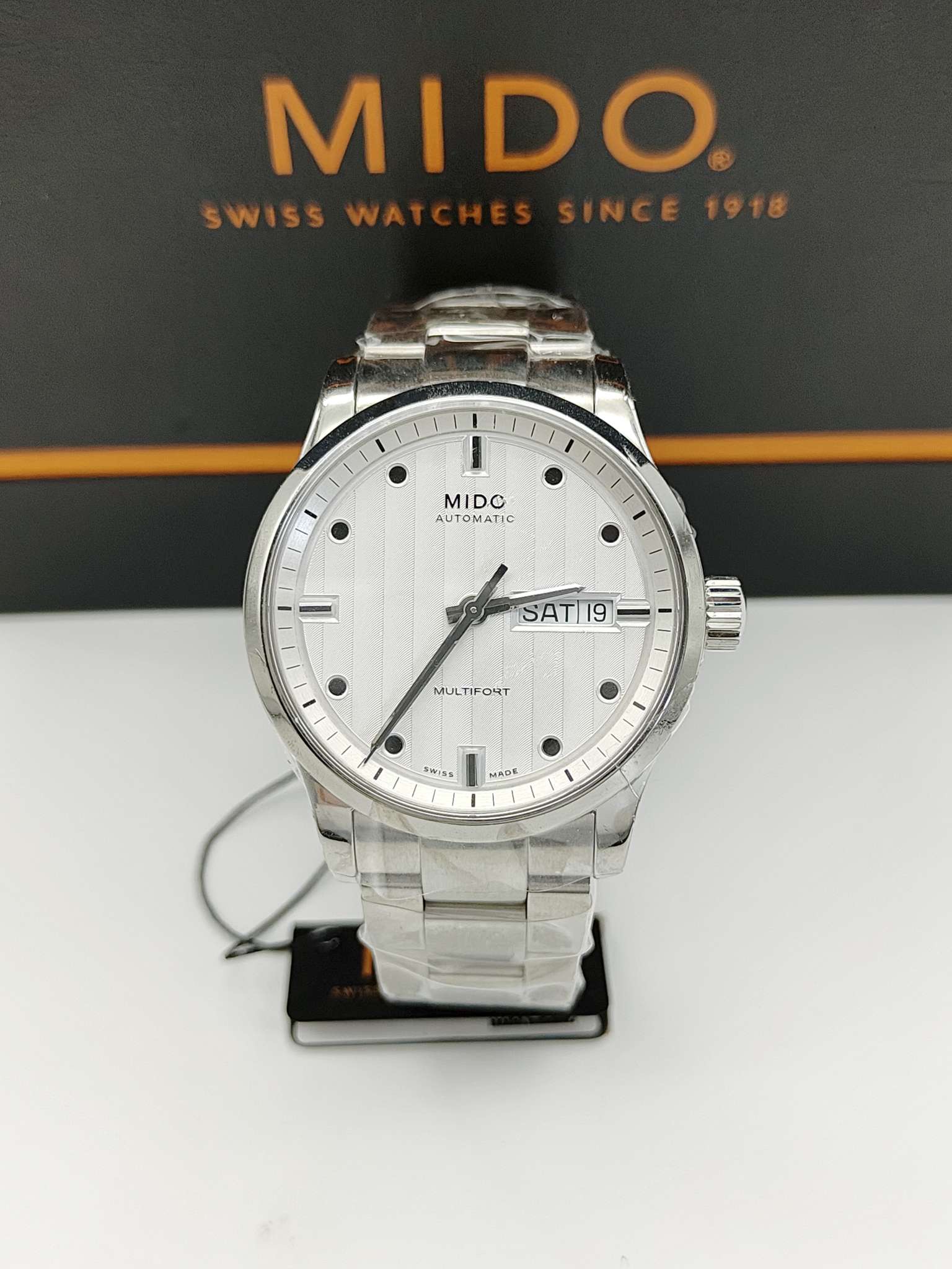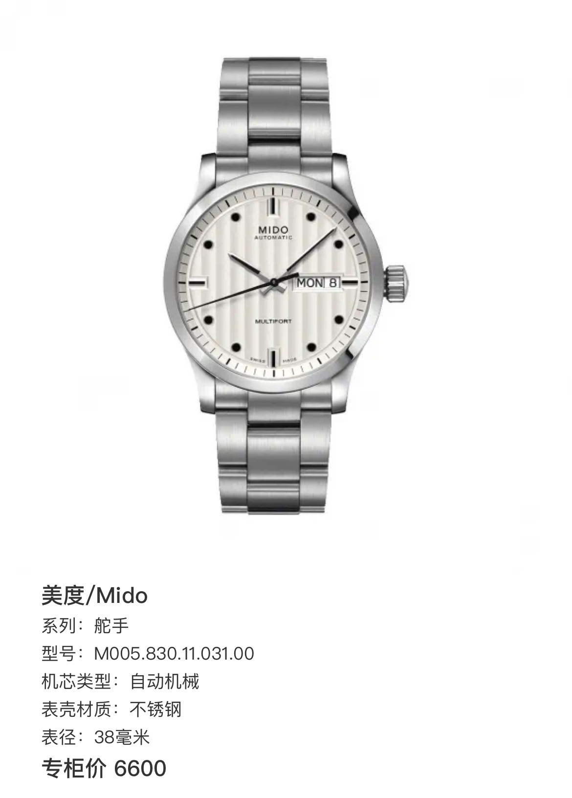 美度/Mido 舵手 M005.830.11.031.00 不锈钢 38毫米 专柜价 6600 自动机械机芯,银白表盘,银色表带,折叠表扣,背透表底,100米防水,日期显示,星期显示,不锈钢 38毫米 专柜价 6900