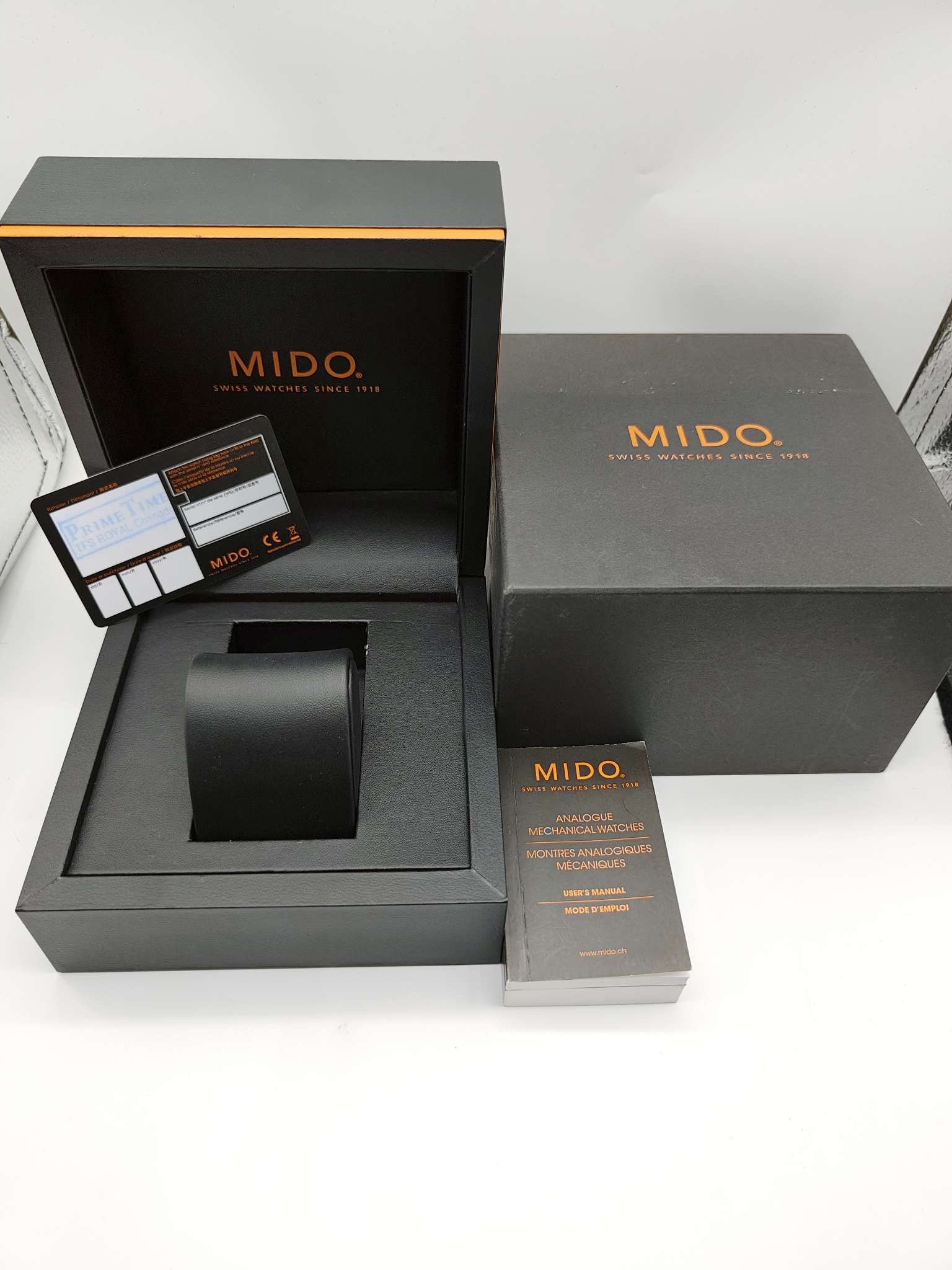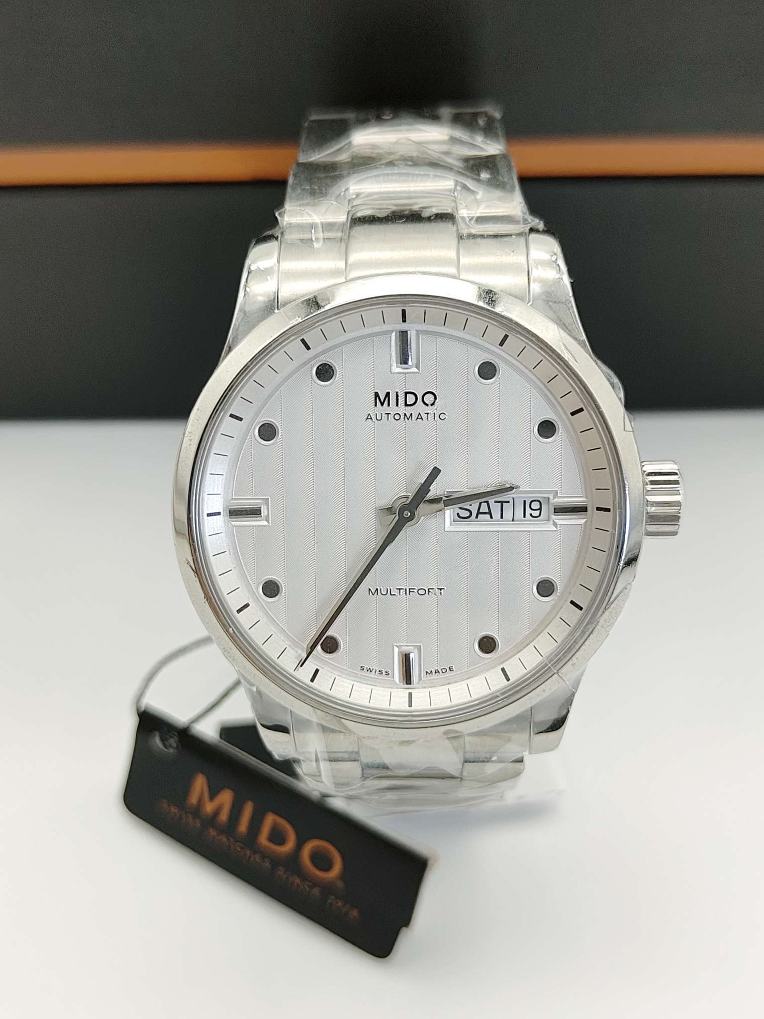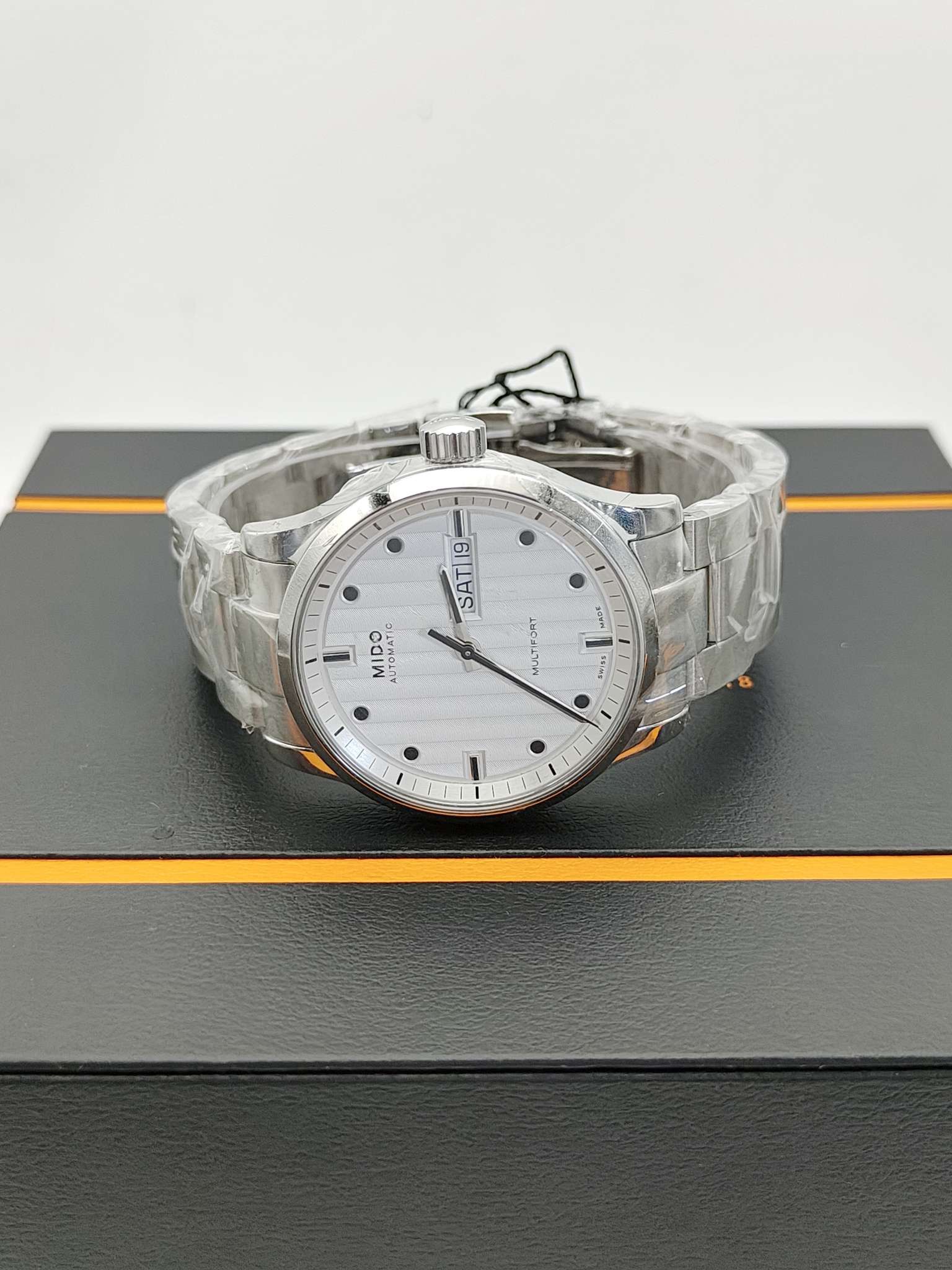 美度/Mido 舵手 M005.830.11.031.00 不锈钢 38毫米 专柜价 6600 自动机械机芯,银白表盘,银色表带,折叠表扣,背透表底,100米防水,日期显示,星期显示,不锈钢 38毫米 专柜价 6900