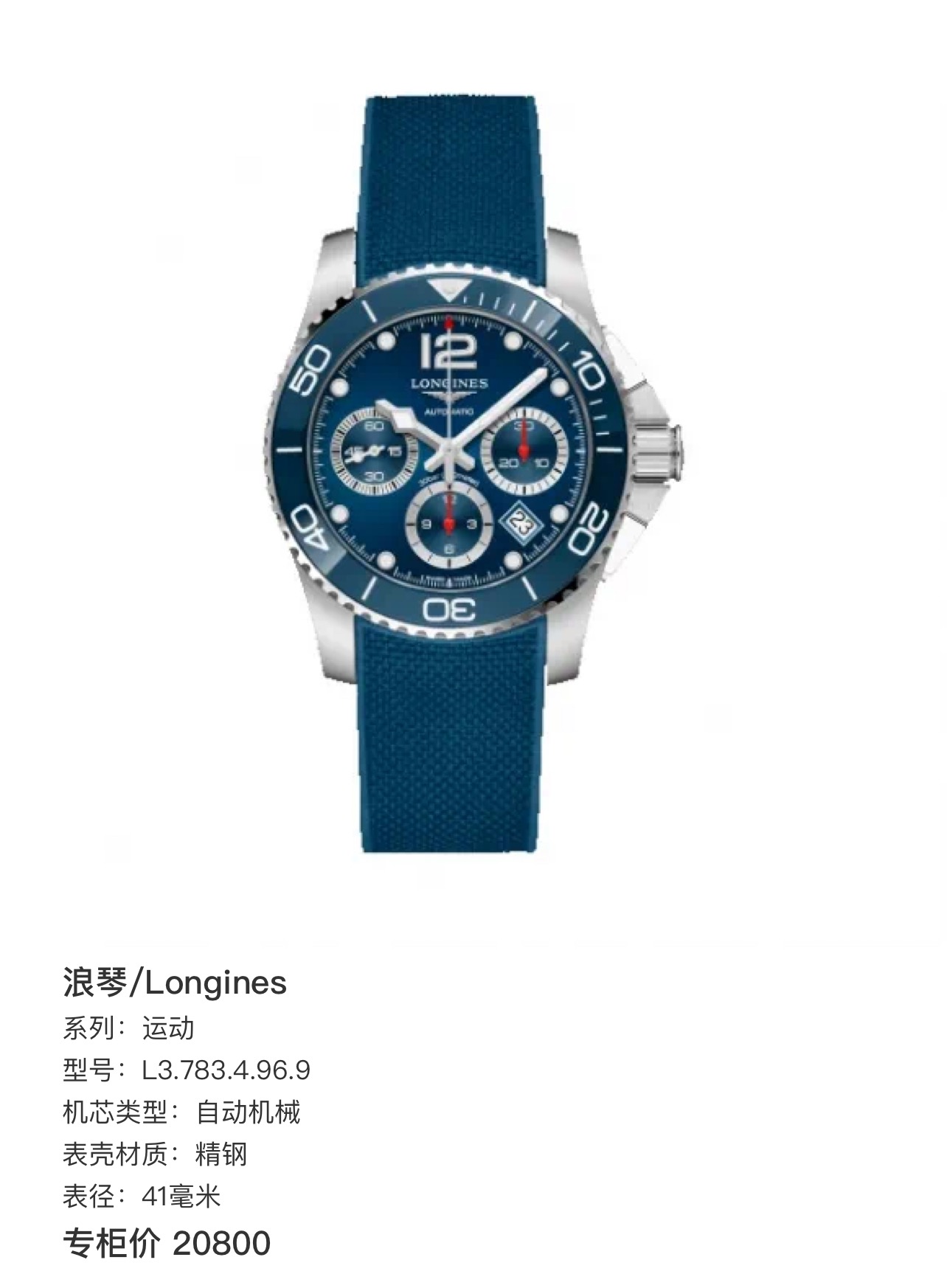 浪琴/Longines 运动 L3.783.4.96.9 自动机械 精钢 41毫米 专柜价 20800 22年全套 现货好价出!