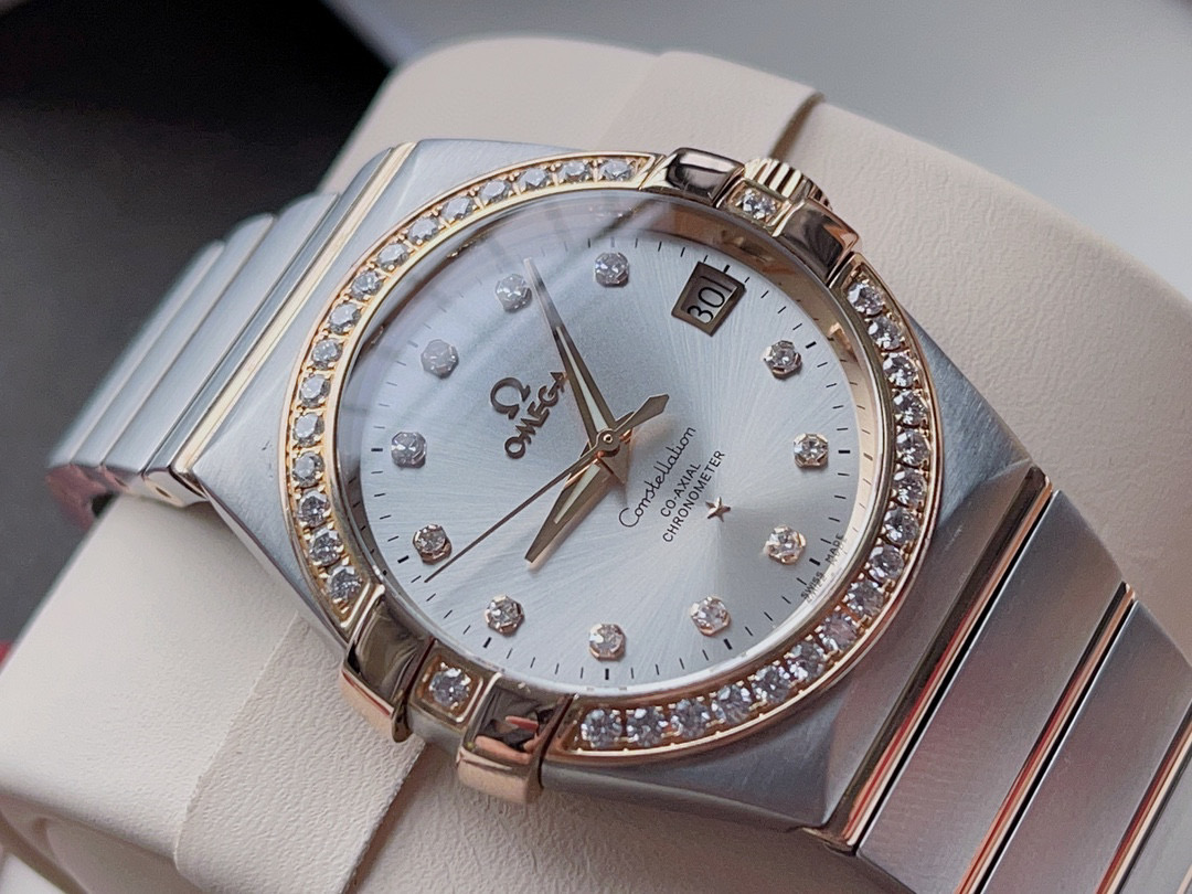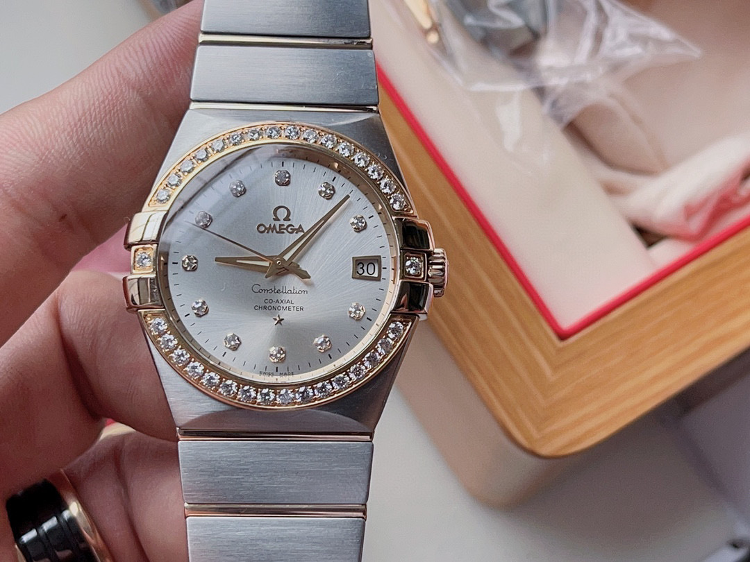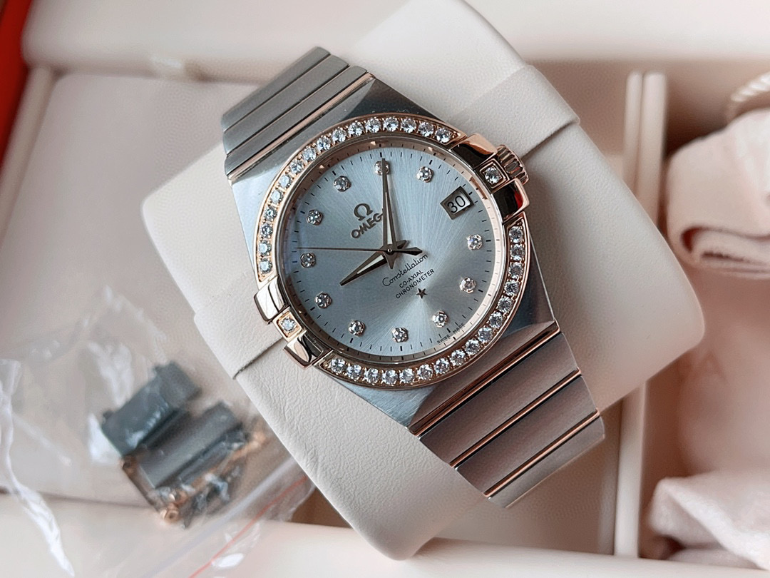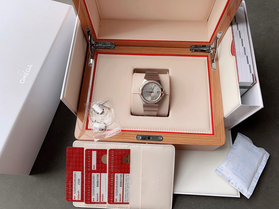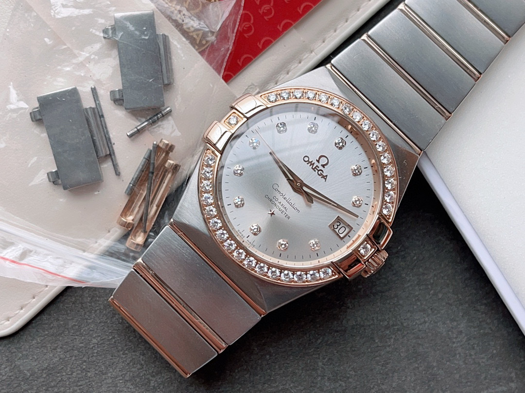 欧米茄星座系列 123.25.35.20.52.001 男士自动机械手表 表径35毫米 精钢材质/18kt玫瑰金内外原镶钻石钻刻 2020年购入 空白卡 新成色 附件齐全如图 专柜售105300 性价比高 现货好价分享