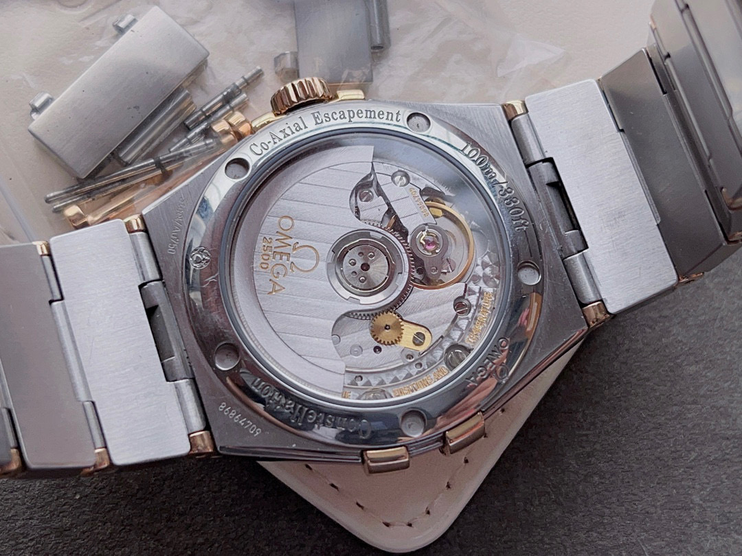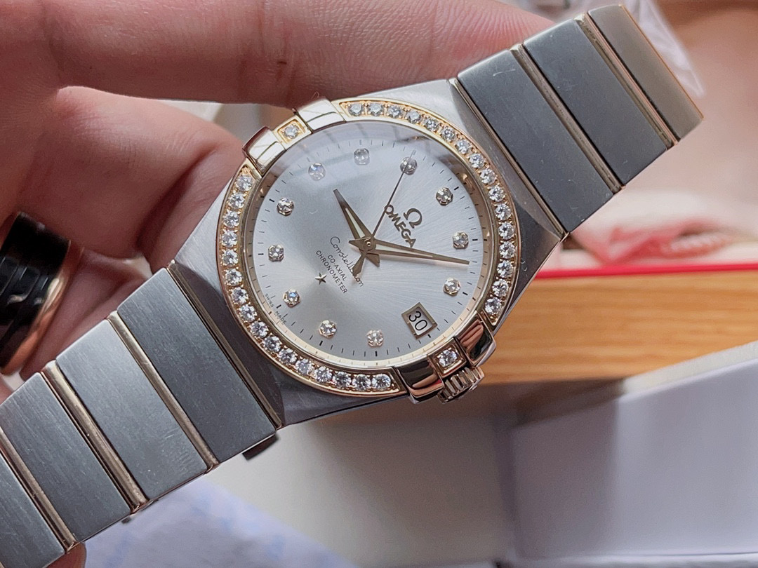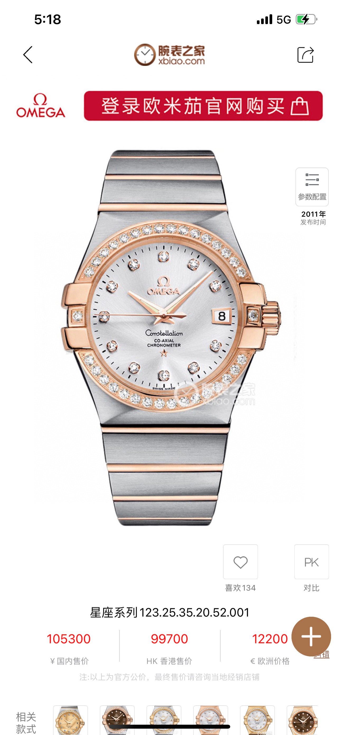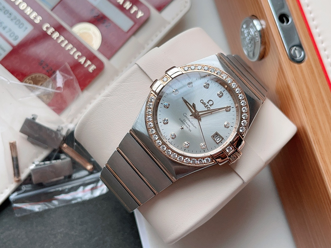 欧米茄星座系列 123.25.35.20.52.001 男士自动机械手表 表径35毫米 精钢材质/18kt玫瑰金内外原镶钻石钻刻 2020年购入 空白卡 新成色 附件齐全如图 专柜售105300 性价比高 现货好价分享