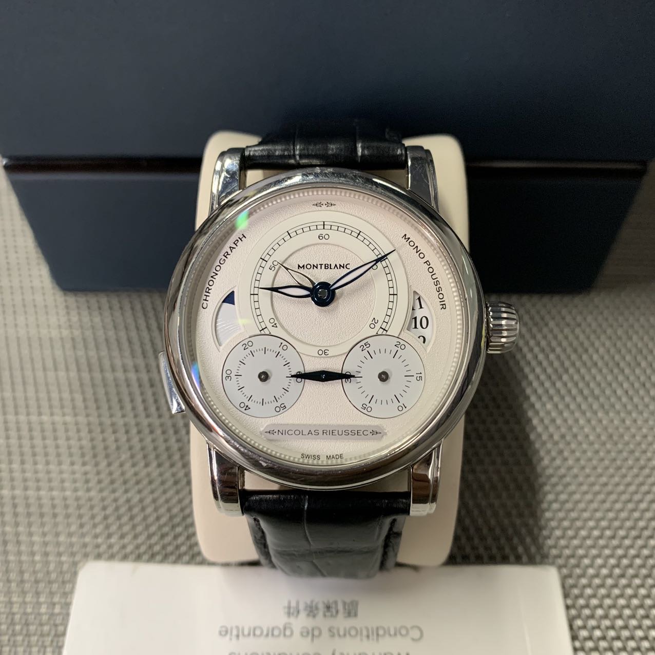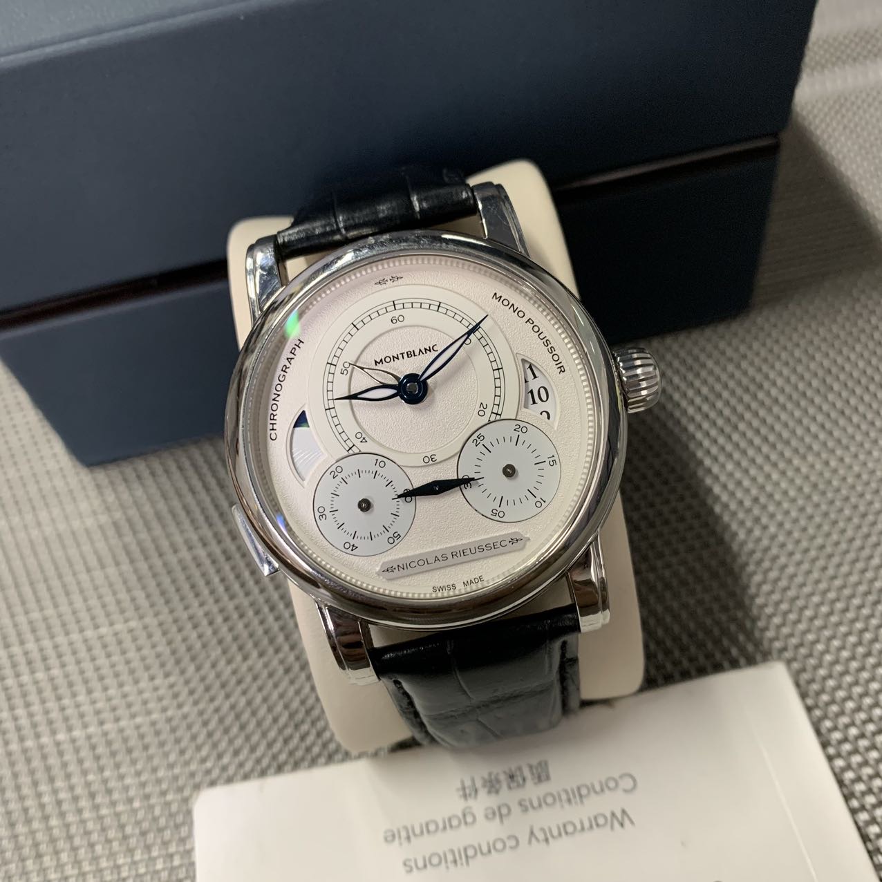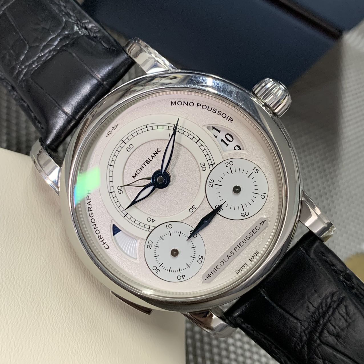 万宝龙尼古拉斯凯世系列,半镂空的设计只有上手才能感受到工艺之复杂,技艺之精湛。表盘对称且起起落落,追求平衡美的同时还赋予了表极多的功能和可能性。柳叶针、v形计时夹板,搭配数字时标,昼夜更替和日历窗口,无数的加法才组成了这样一块儿功能性腕表。白色立体雕纹表盘,大气沉稳。独立单键计时功能,搭载自产机芯。稳重且精致,上手绝对惊喜!