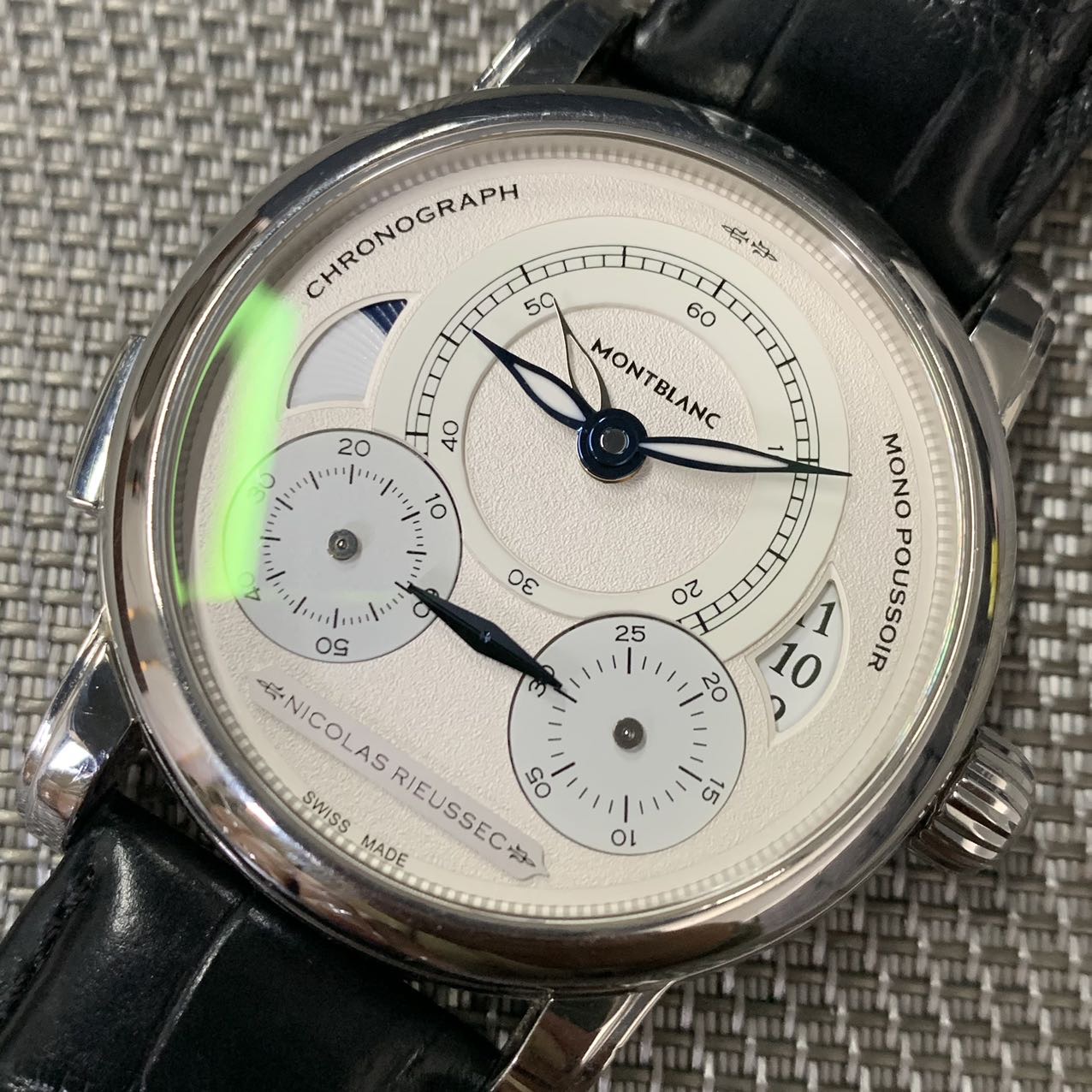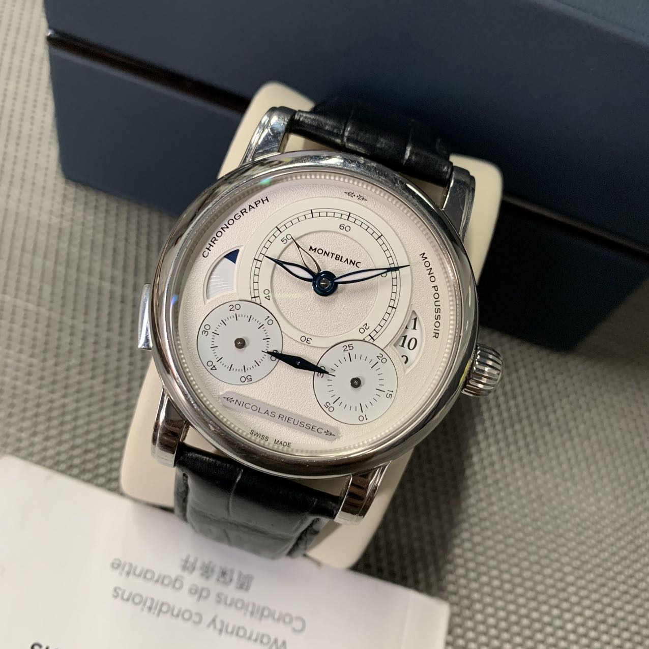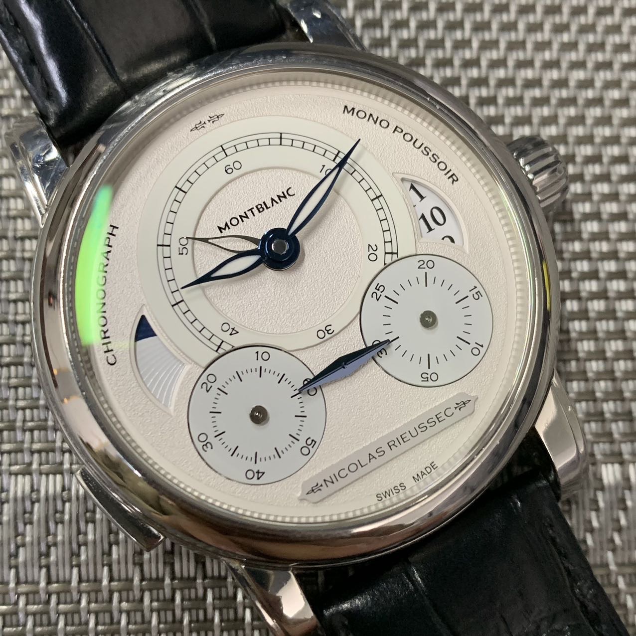 万宝龙尼古拉斯凯世系列,半镂空的设计只有上手才能感受到工艺之复杂,技艺之精湛。表盘对称且起起落落,追求平衡美的同时还赋予了表极多的功能和可能性。柳叶针、v形计时夹板,搭配数字时标,昼夜更替和日历窗口,无数的加法才组成了这样一块儿功能性腕表。白色立体雕纹表盘,大气沉稳。独立单键计时功能,搭载自产机芯。稳重且精致,上手绝对惊喜!