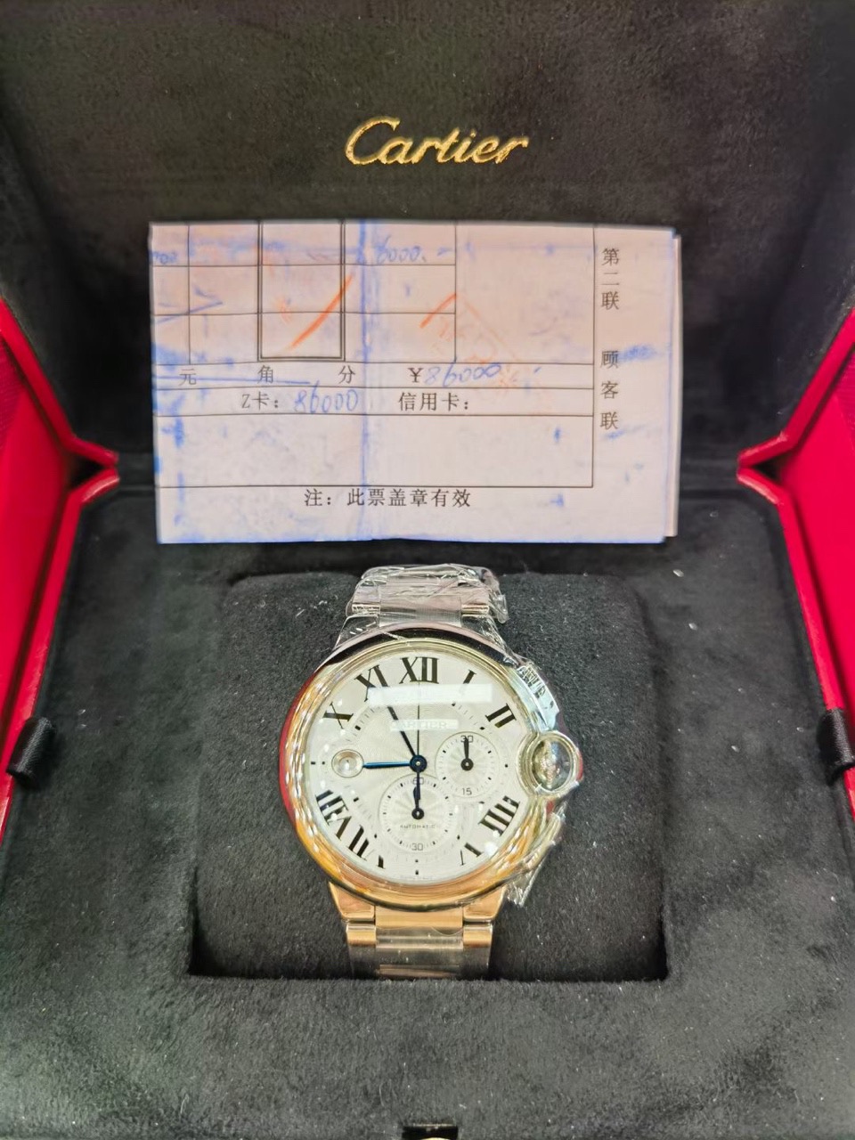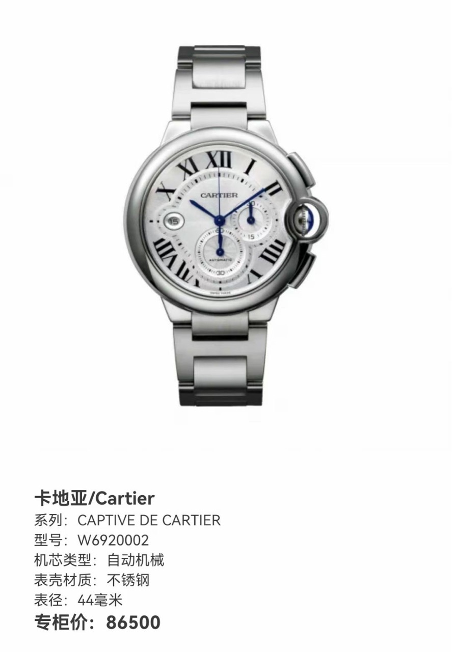 卡地亚/Cartier CAPTIVE DE CARTIER W6920002 自动机械 不锈钢 44毫米 镀银雕纹表盘,罗马数字刻度,蓝钢指针,搭载自产计时机芯 日期显示,计时功能。公价86500,23年全套未使用 成色完美,现货好价出!
