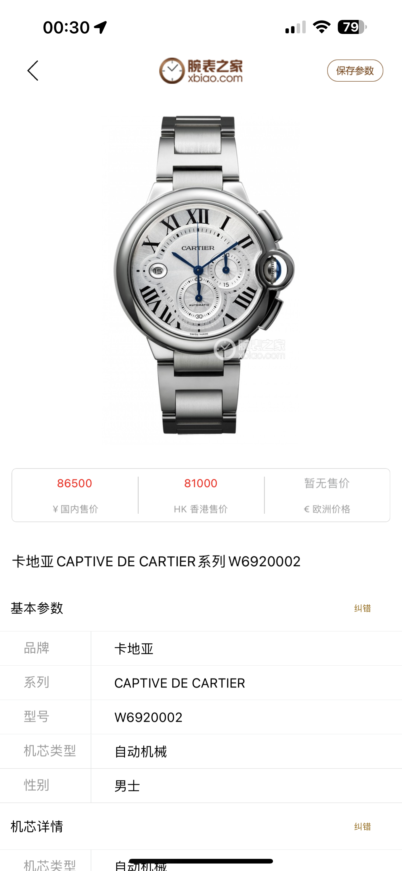 卡地亚蓝气球BALLON BLANC DE CARTIERW6920002机械男性