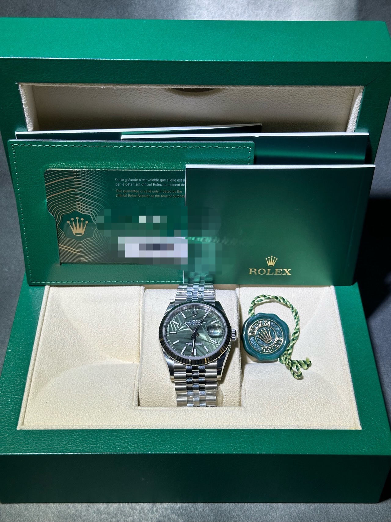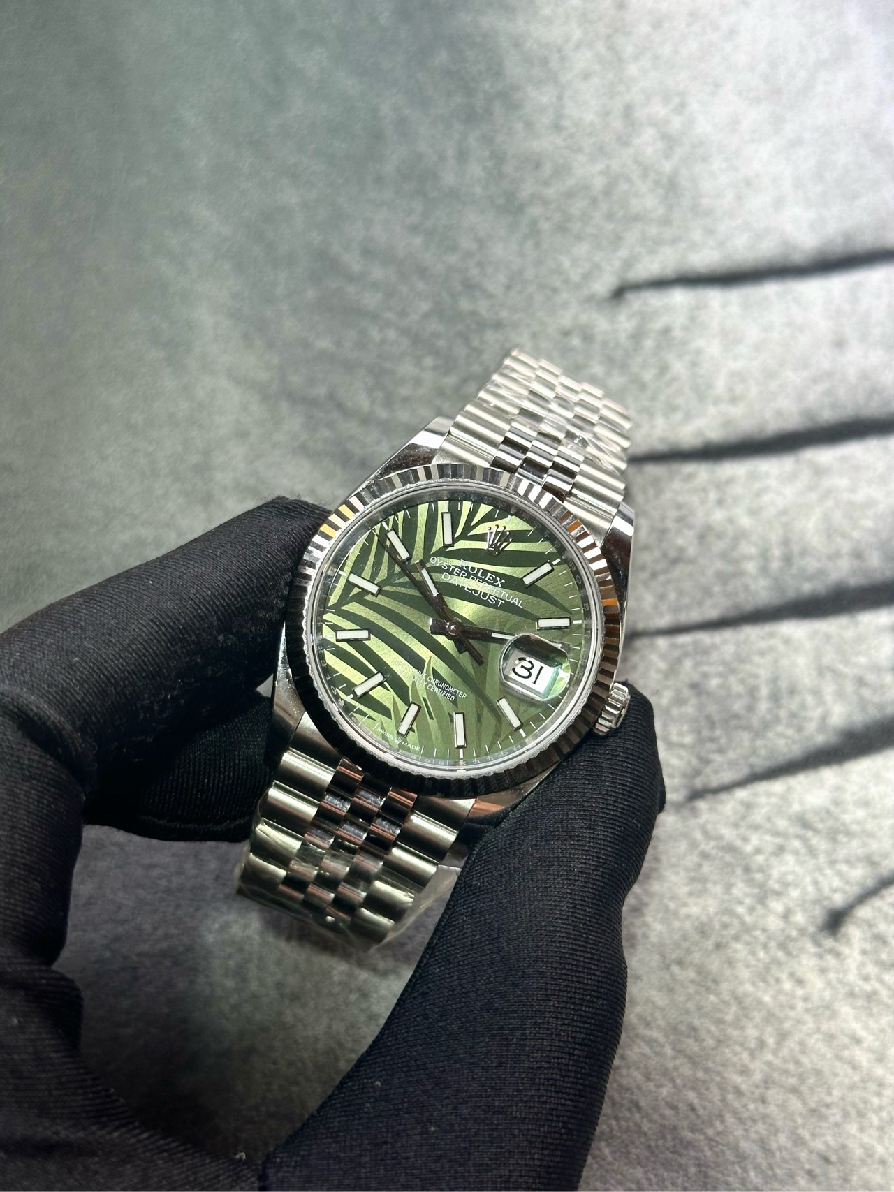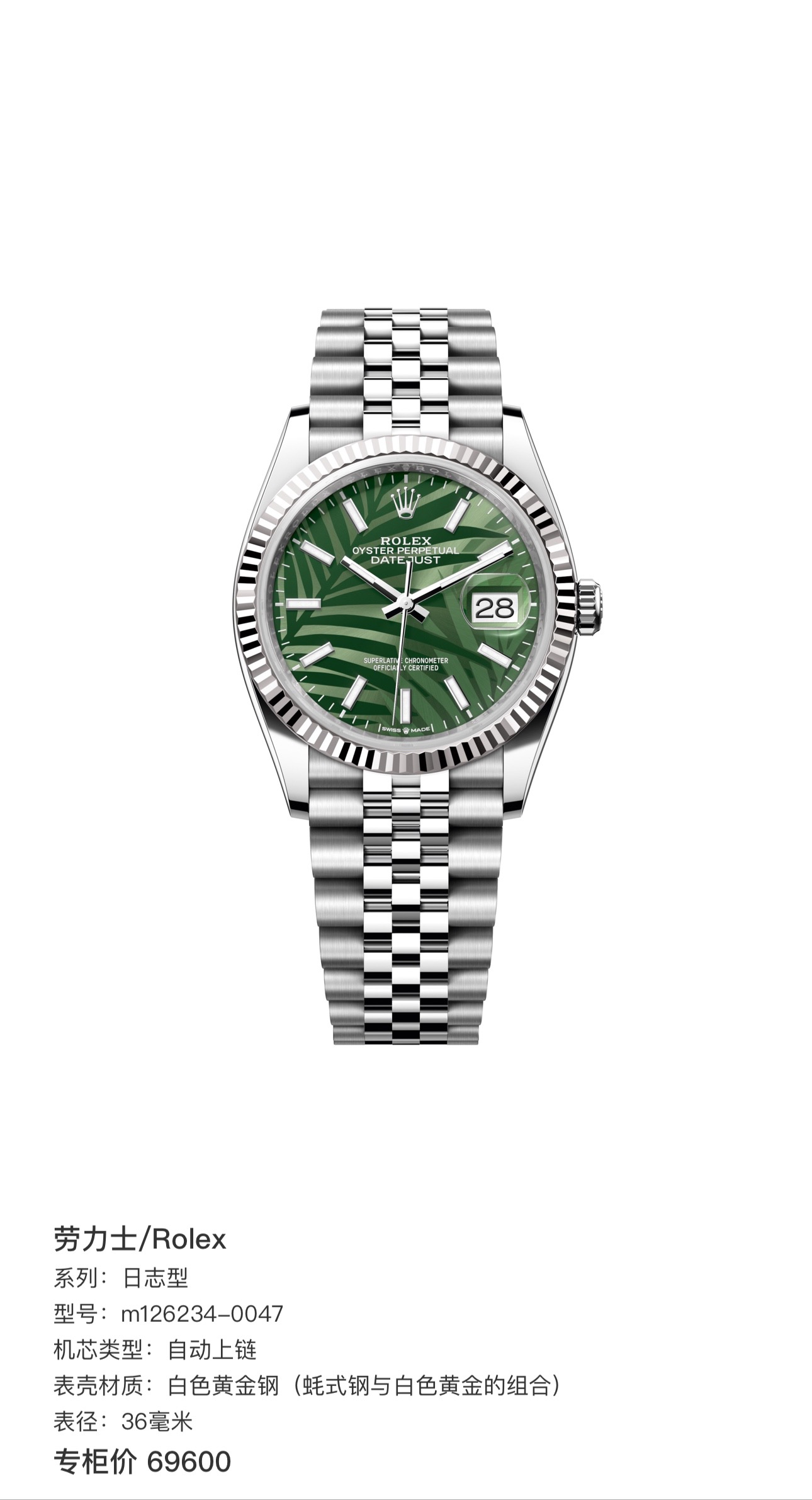 劳力士/Rolex 日志型 m126234-0047 自动机械腕表 蚝式钢材质 表圈白色黄金钢圈 36毫米表径 橄榄绿棕榈叶表盘 未使用全套 专柜价 69600