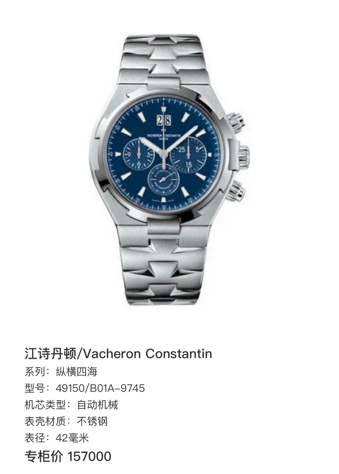 江诗丹顿/Vacheron Constantin 纵横四海系列49150/B01A-9745 自动机械男士腕表,精钢材质,42毫米表径,稀有蓝面,专柜价 157000,现单表好价