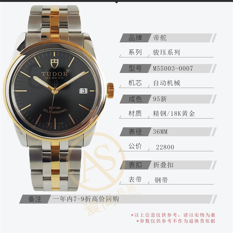 帝舵骏珏系列 型号M55003-0007 36表径自动机械表 精钢/18K黄金材质 公价22800元