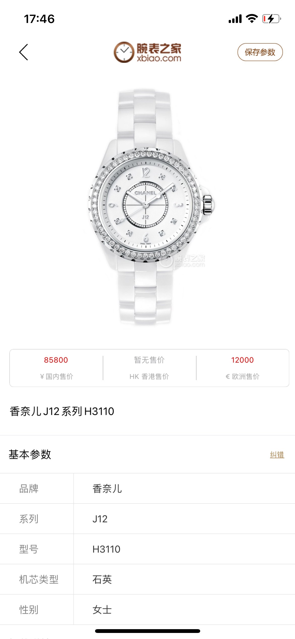 Chanel香奈儿J12系列石英腕表 型号:H3110 配件:内外盒子 保卡 保卡日期:2022年 材质:白陶瓷/精钢 表径:33mm 专柜售价96500