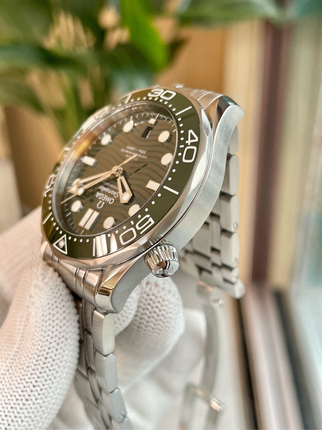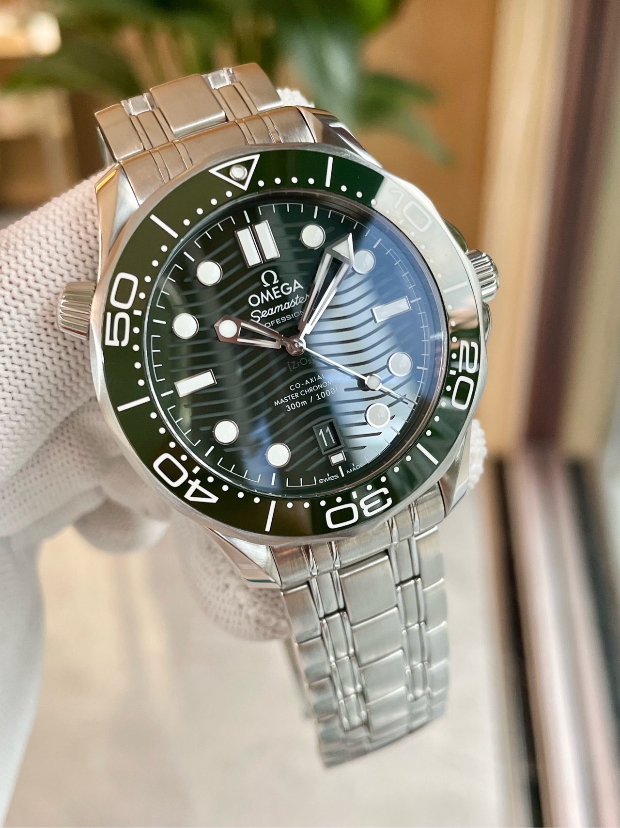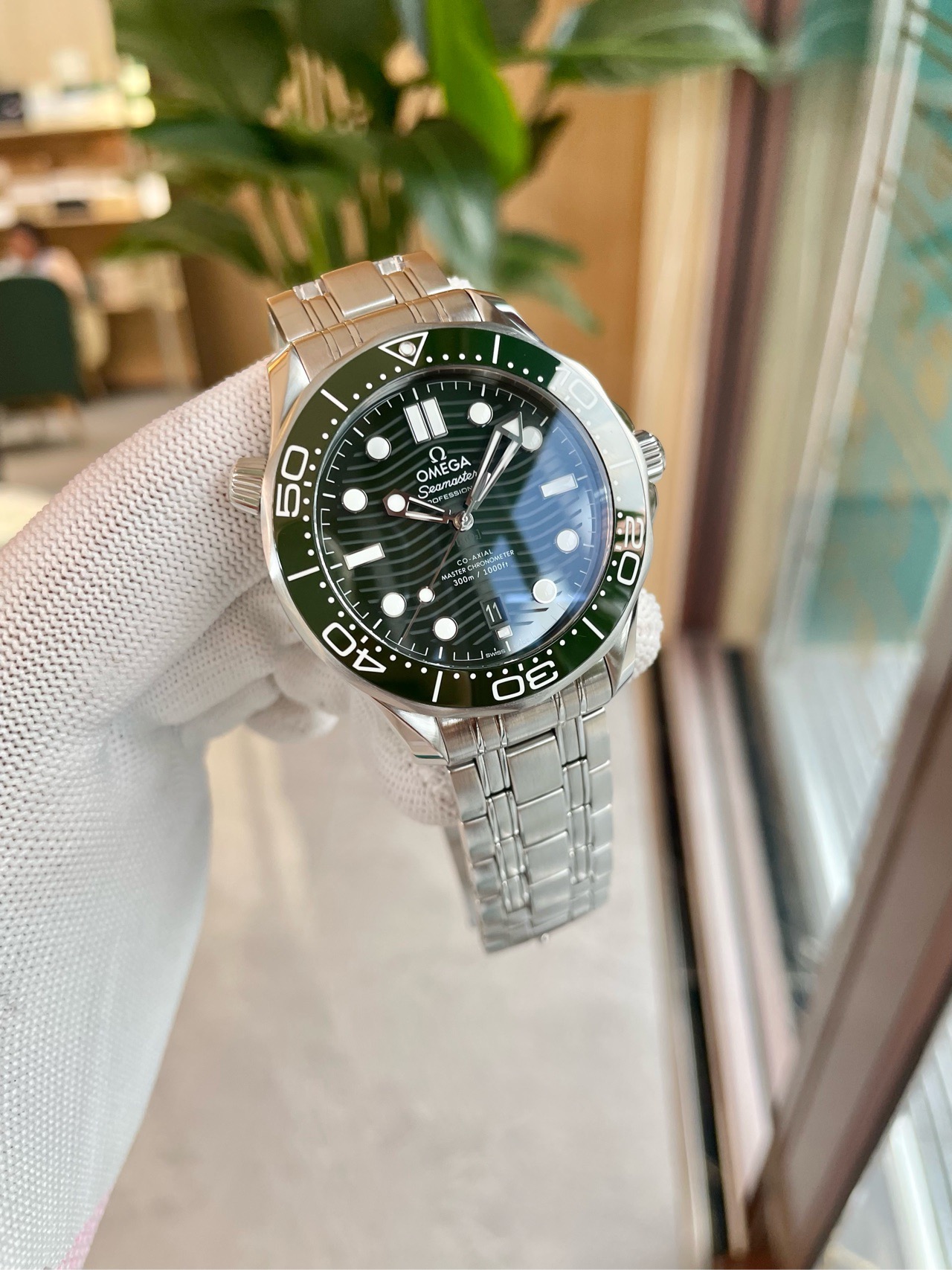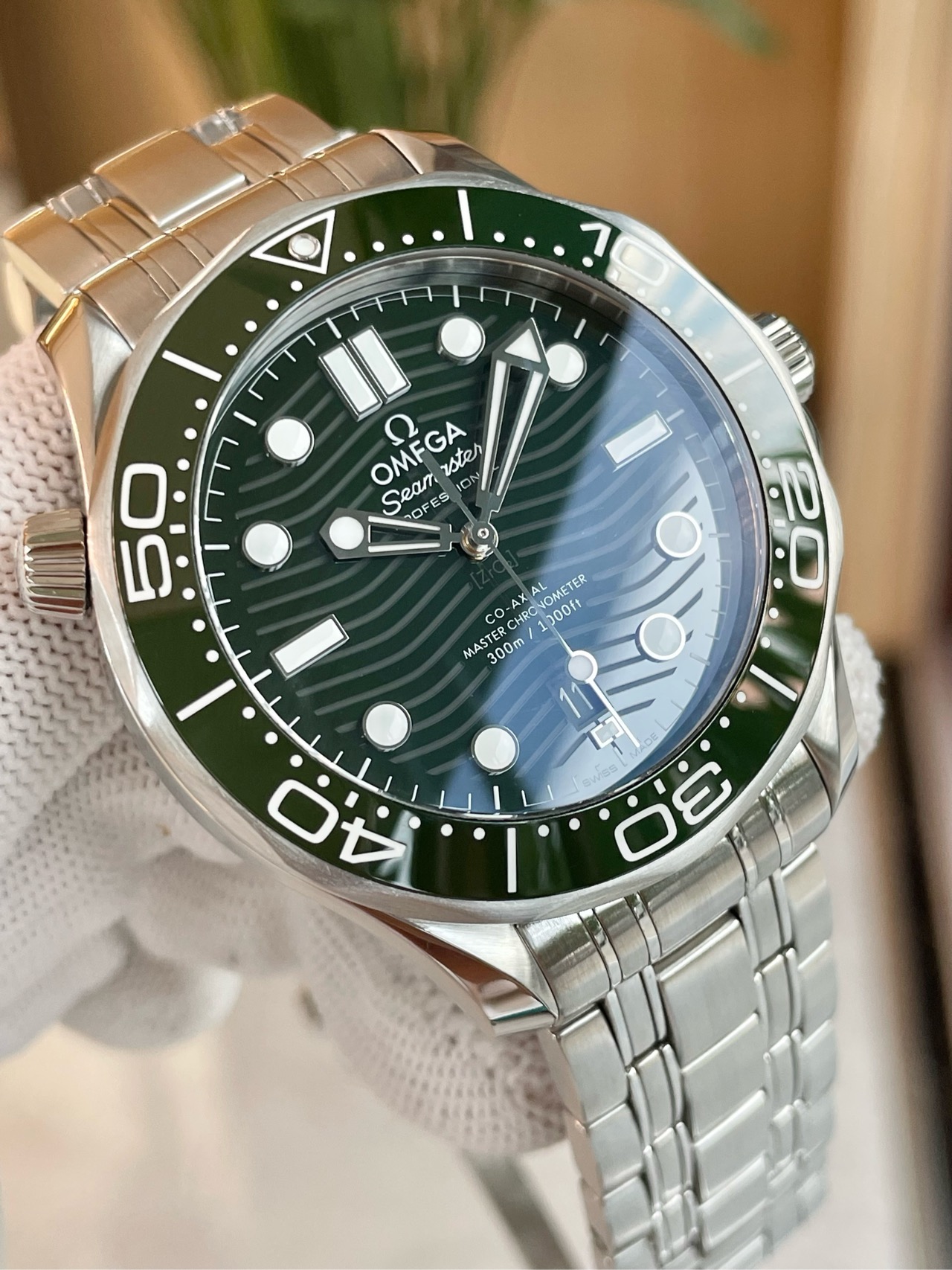 欧米茄新款海马300绿钢,210.30.42.20.10.001,23年4月全套带票据。二氧化锆陶瓷表盘、表盘暗刻水波纹、陶瓷圈珐琅字、300米防水、42MM口径、8800机芯,好价