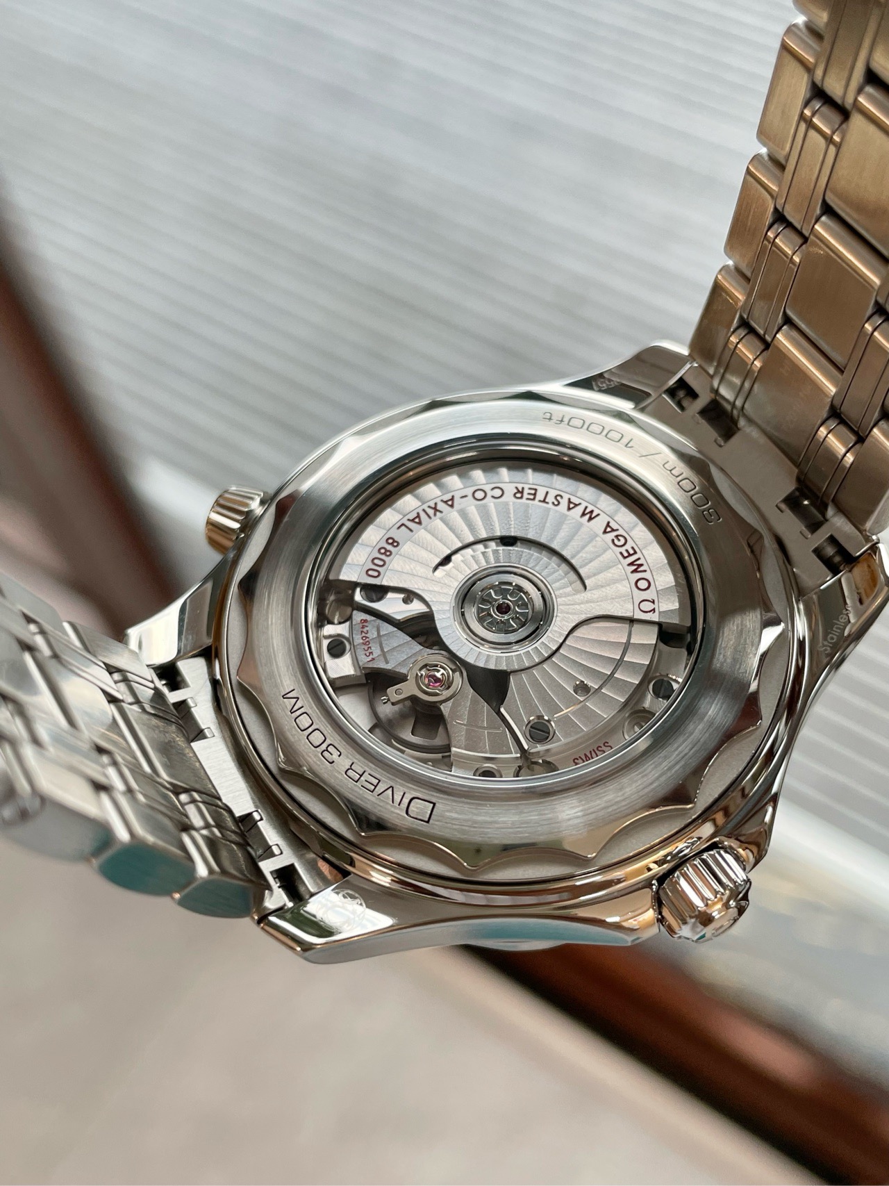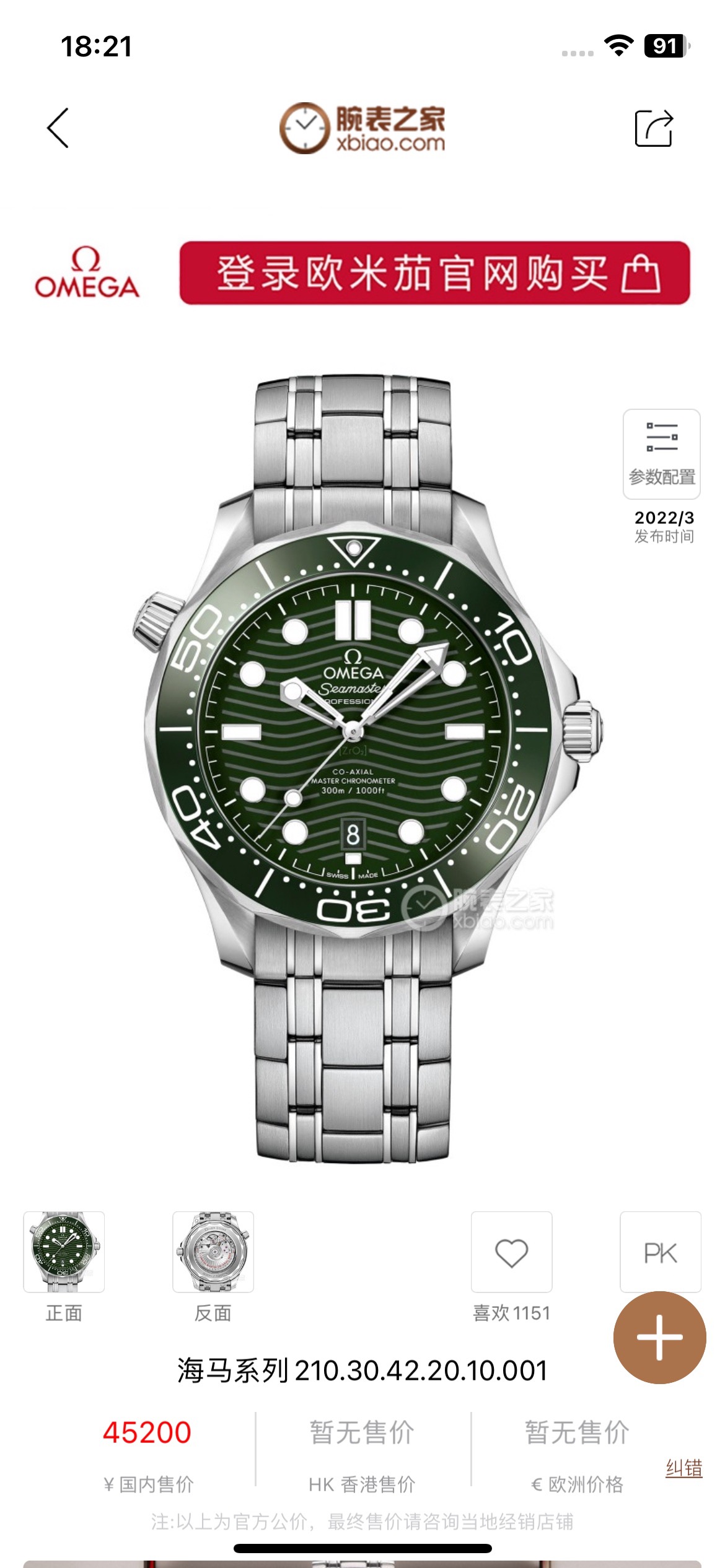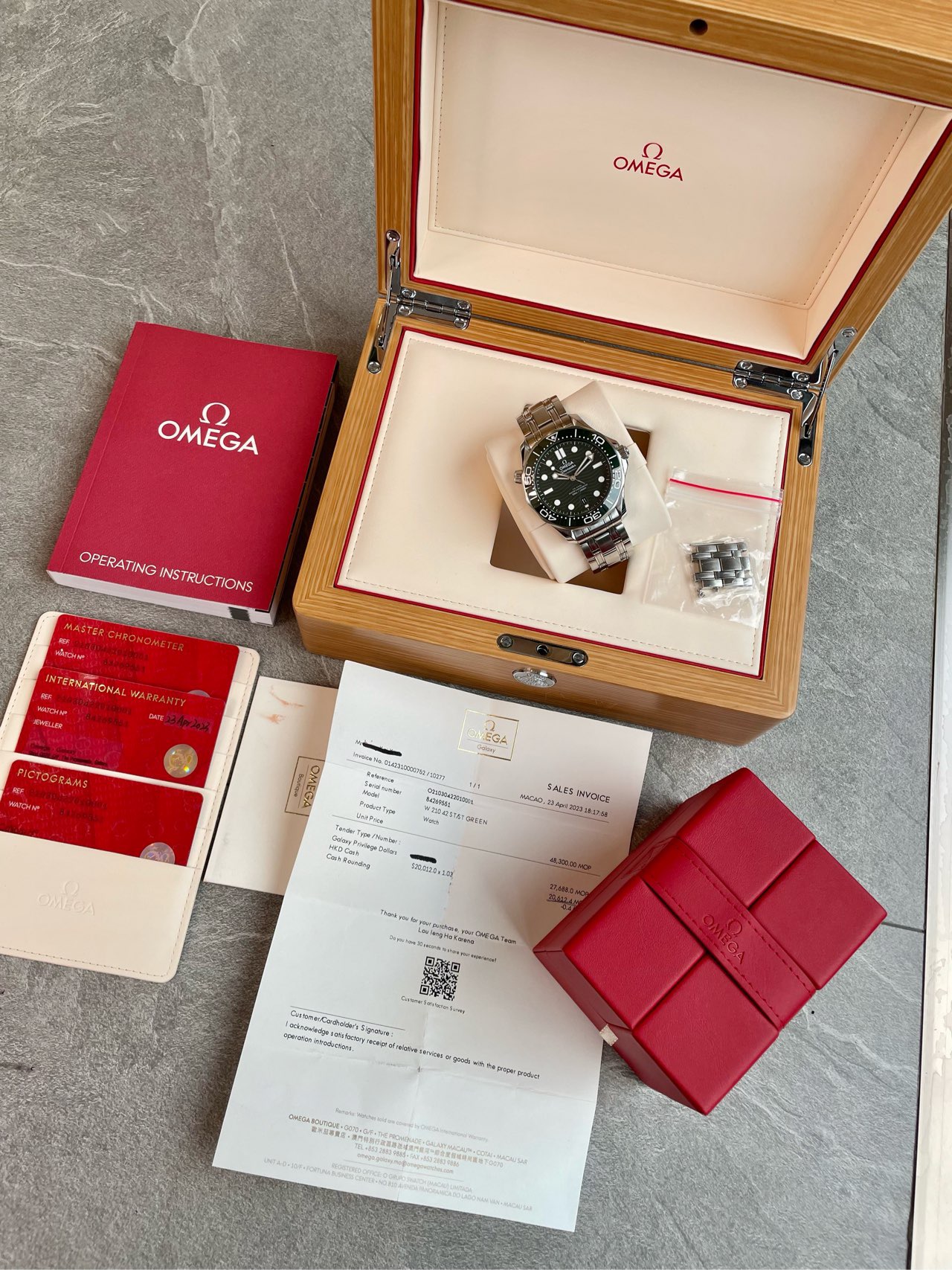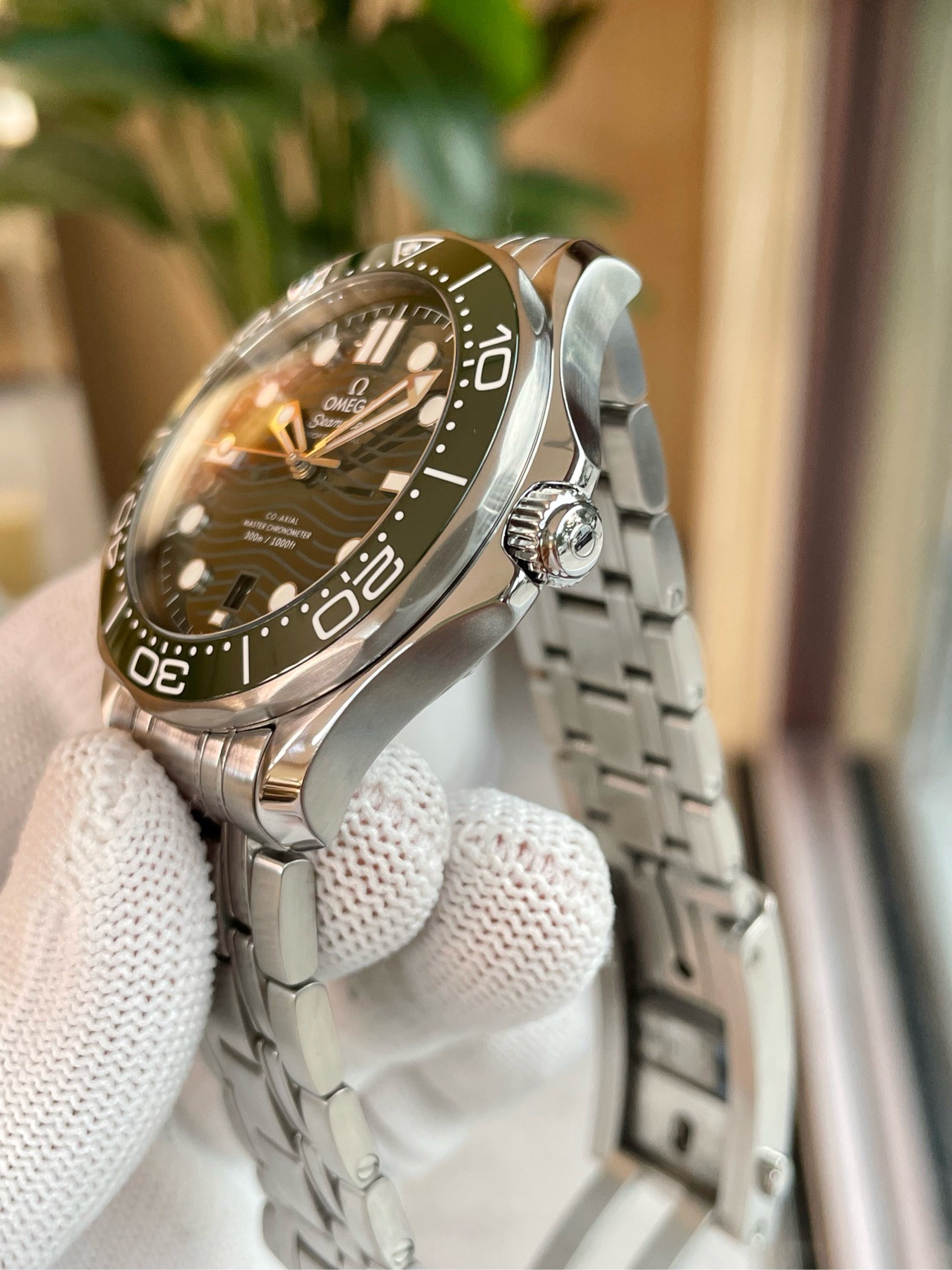 欧米茄新款海马300绿钢,210.30.42.20.10.001,23年4月全套带票据。二氧化锆陶瓷表盘、表盘暗刻水波纹、陶瓷圈珐琅字、300米防水、42MM口径、8800机芯,好价