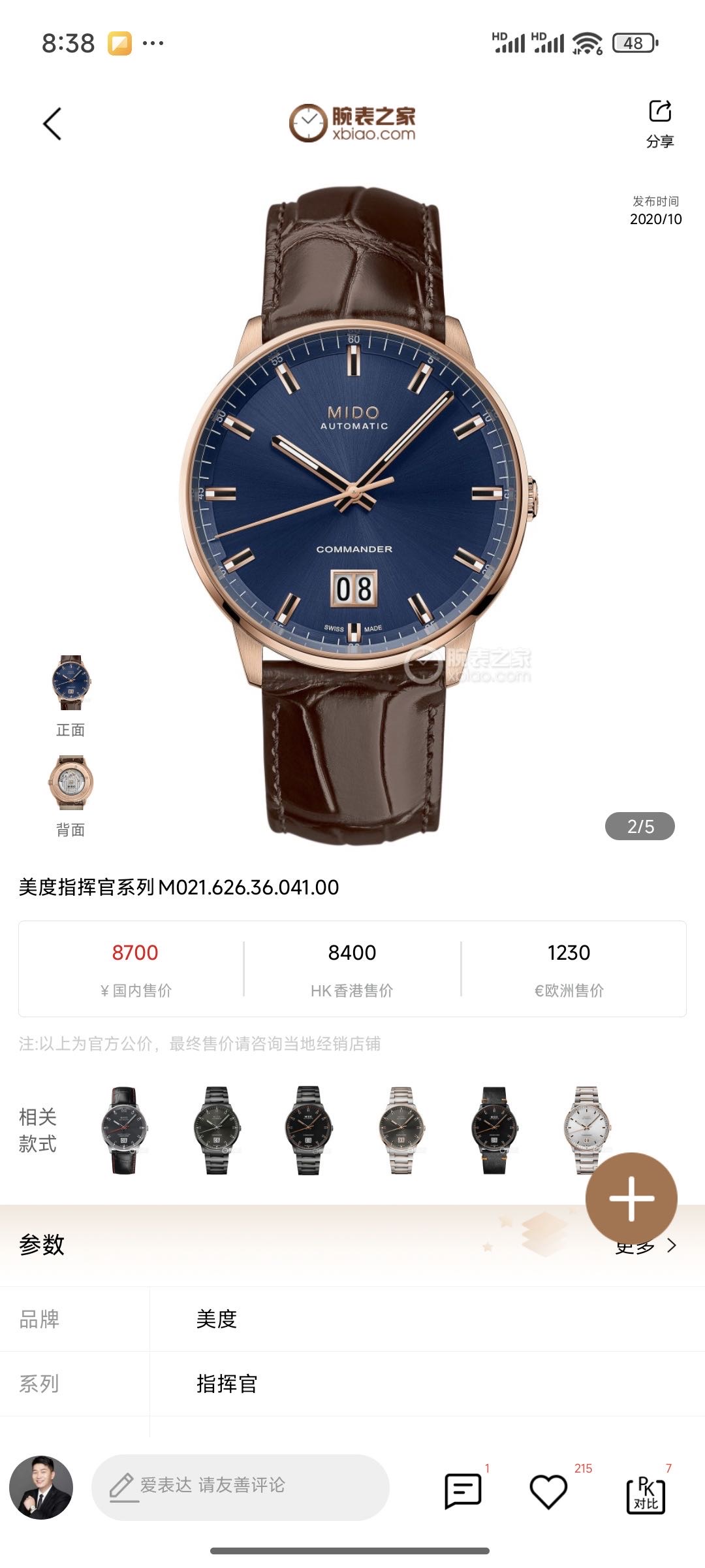 MIDO美度 指挥官系列 自动机械机芯 50米防水 男表 瑞表 42mm 蓝色表盘 不锈钢表壳 真皮表带 M021.626.36.041.00专柜售价8700 全新全套官方联保近期保卡