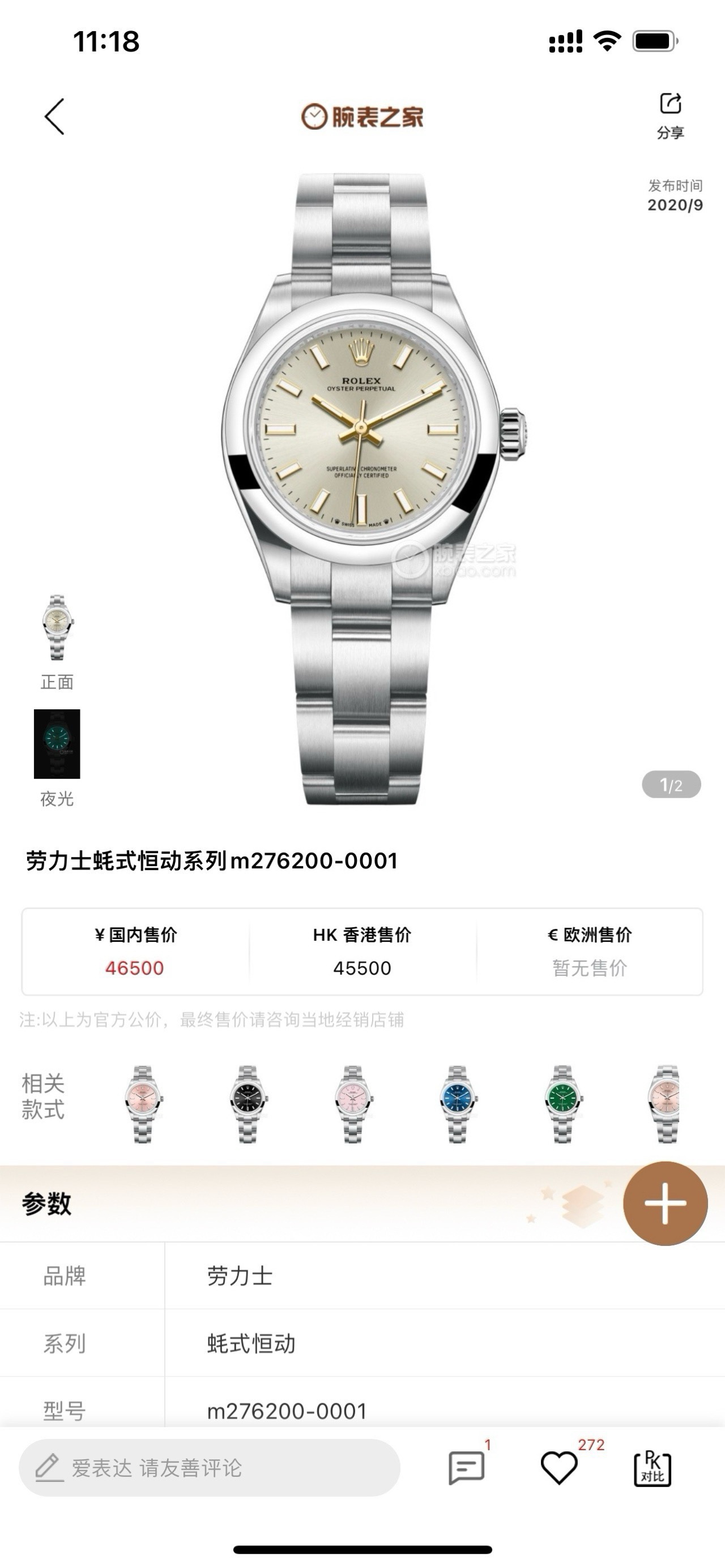 劳力士 m276200-0001蚝式恒动女士自动机械表,新款金针银面,表径28mm,全套21年保卡,公价46500 现货好价!