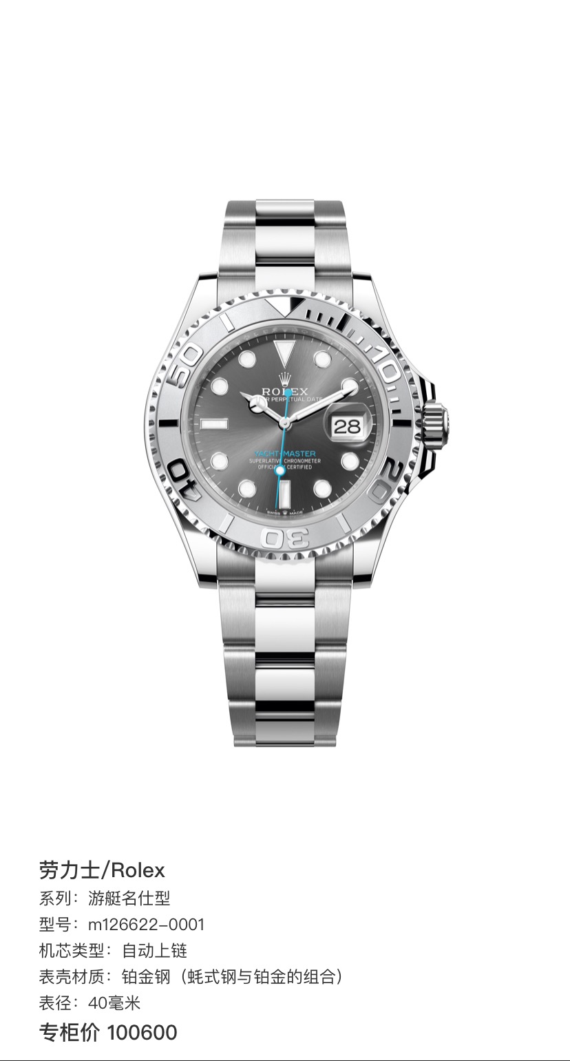 劳力士/Rolex 游艇名仕型 m126622-0001 自动上链 铂金钢(蚝式钢与铂金的组合) 40毫米 专柜价 95800