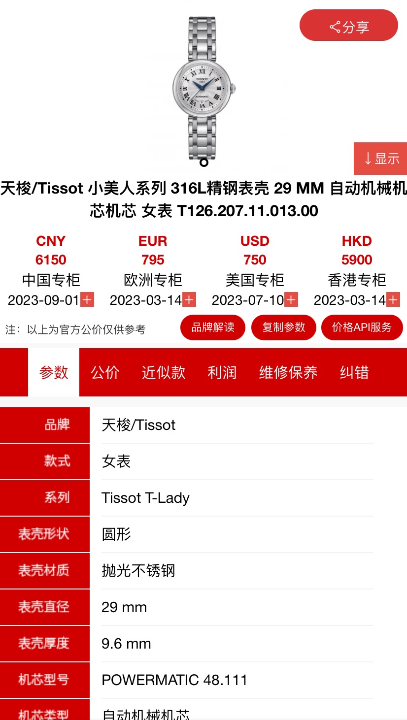 天梭/Tissot 小美人系列 316L精钢表壳 29 MM 自动机械机芯机芯 女表 T126.207.11.013.00