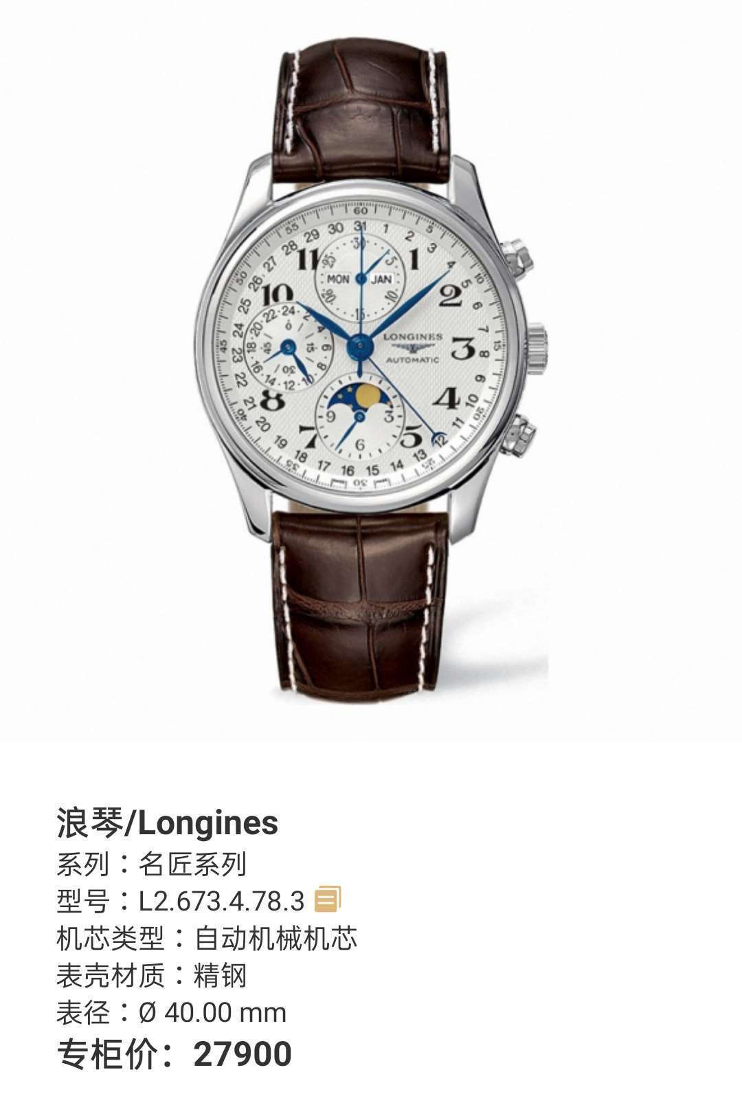 浪琴/Longines 名匠系列 L2.673.4.78.3 自动机械机芯 精钢 Ø 40.00 mm 专柜价29300~