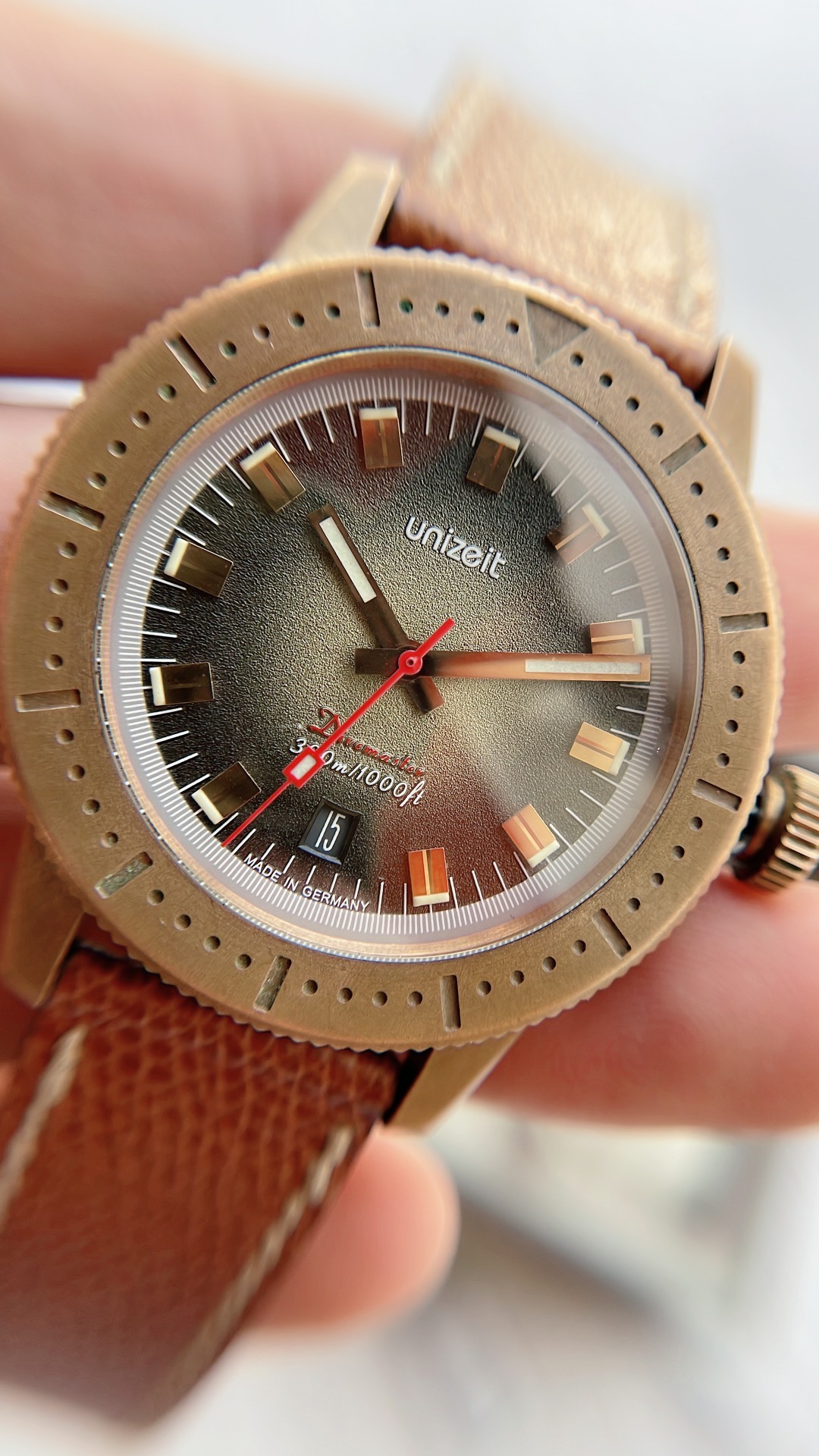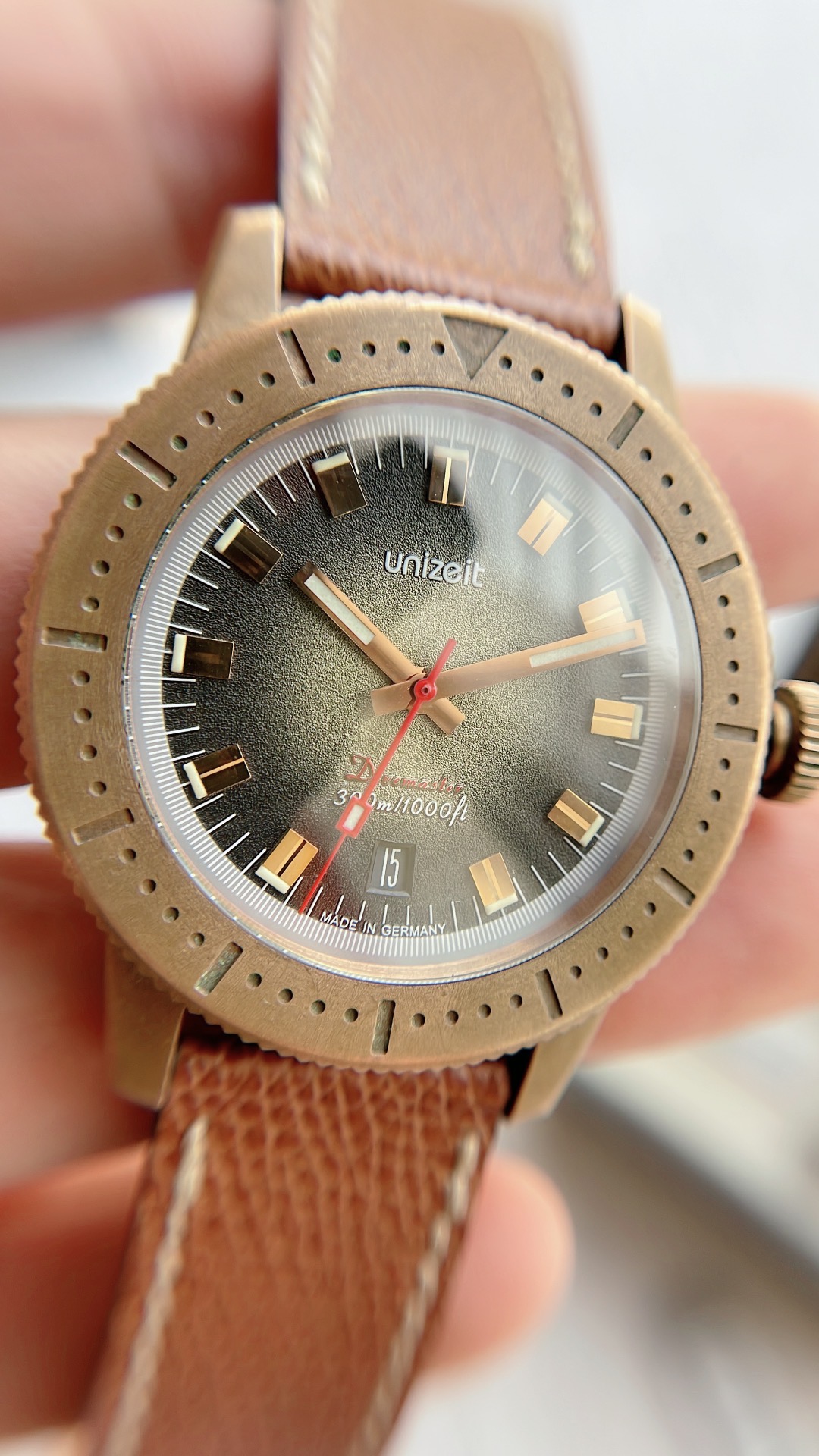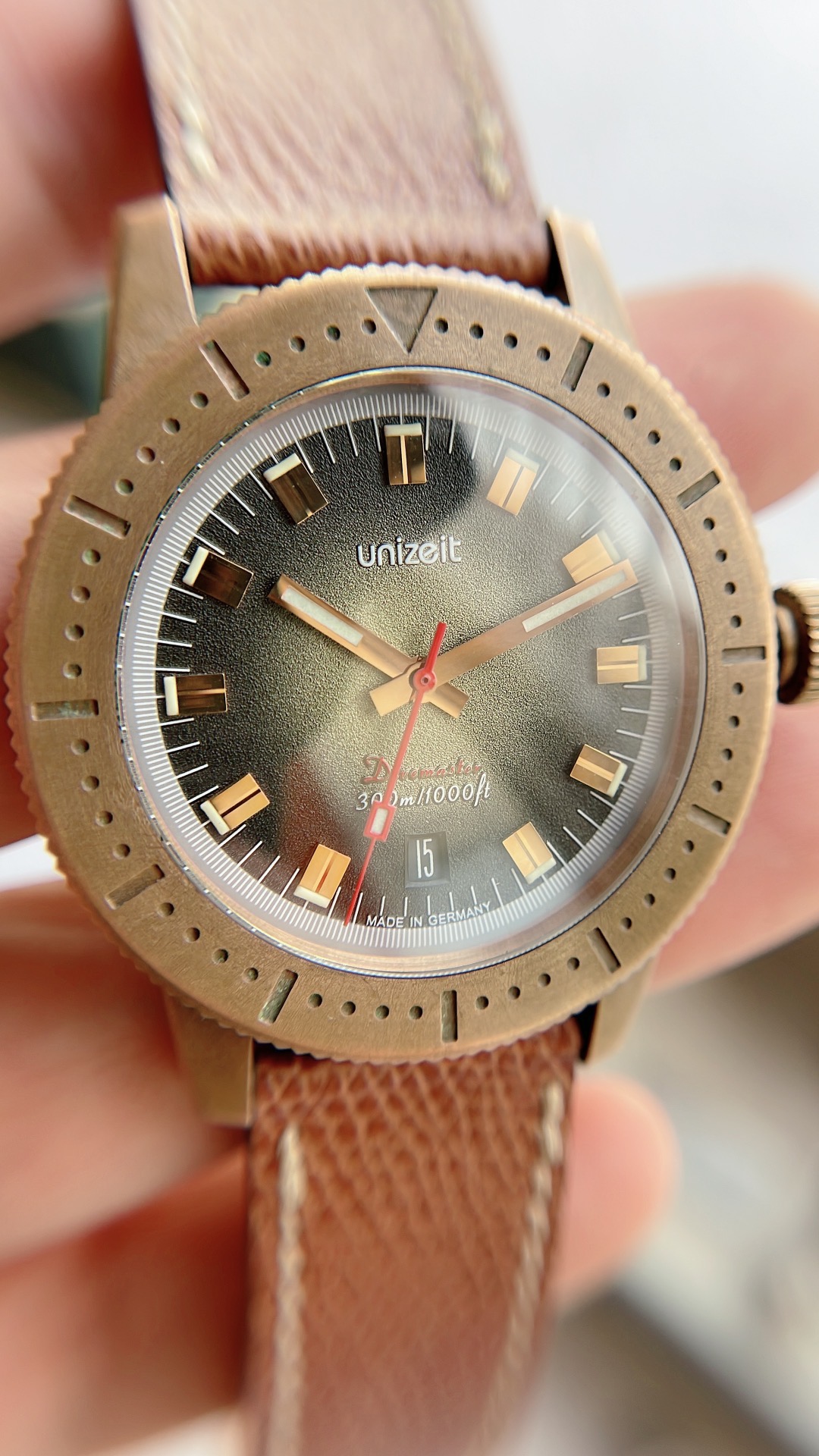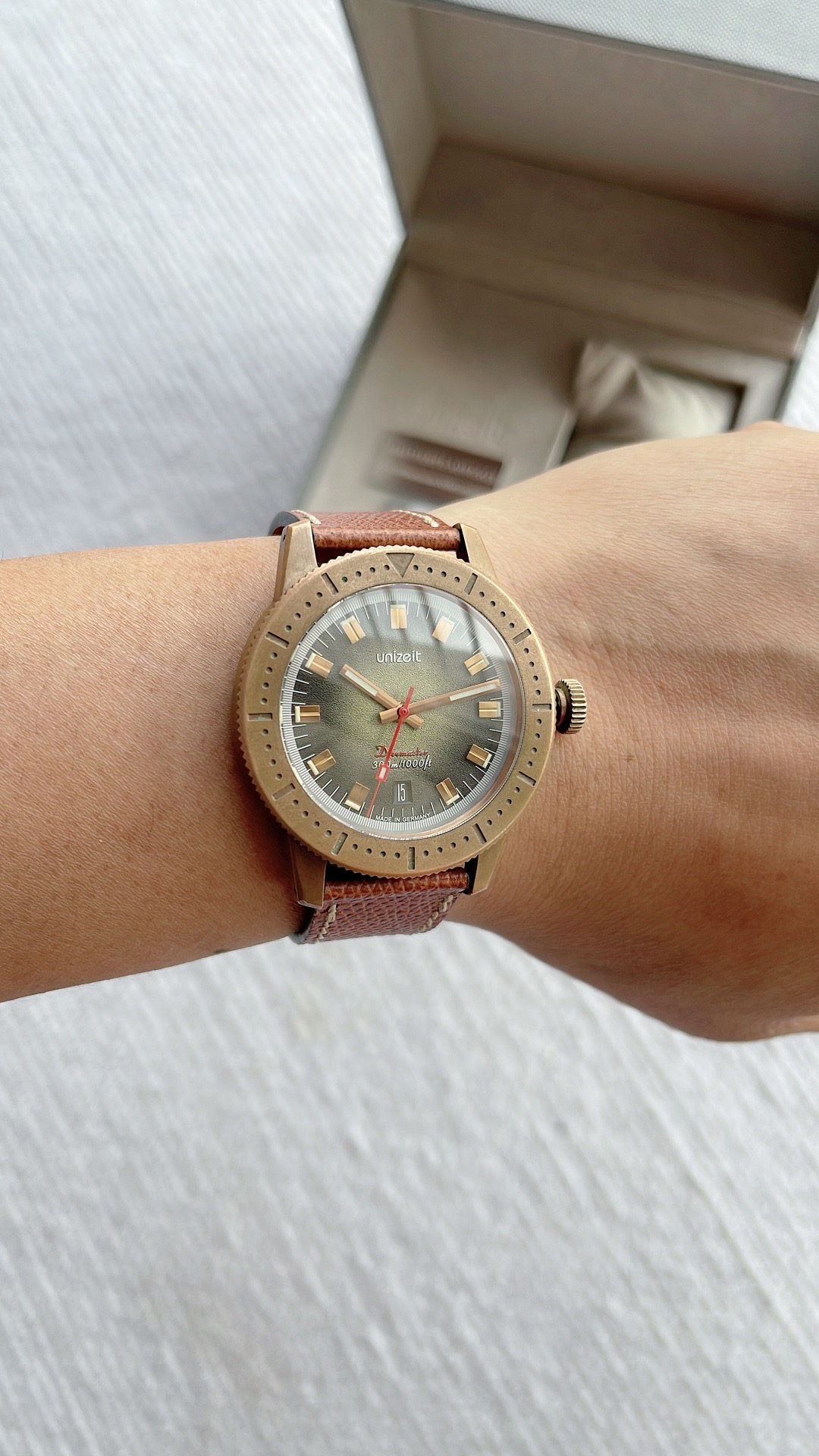 德国独立制表品牌优立时DM001青铜器,42mm表径,搭载SOPROD A10机芯,复古渐变面,青铜表壳钛合金底壳,300m防水,原价35000,95新极品佩戴舒适,上手非常有味道的一款!