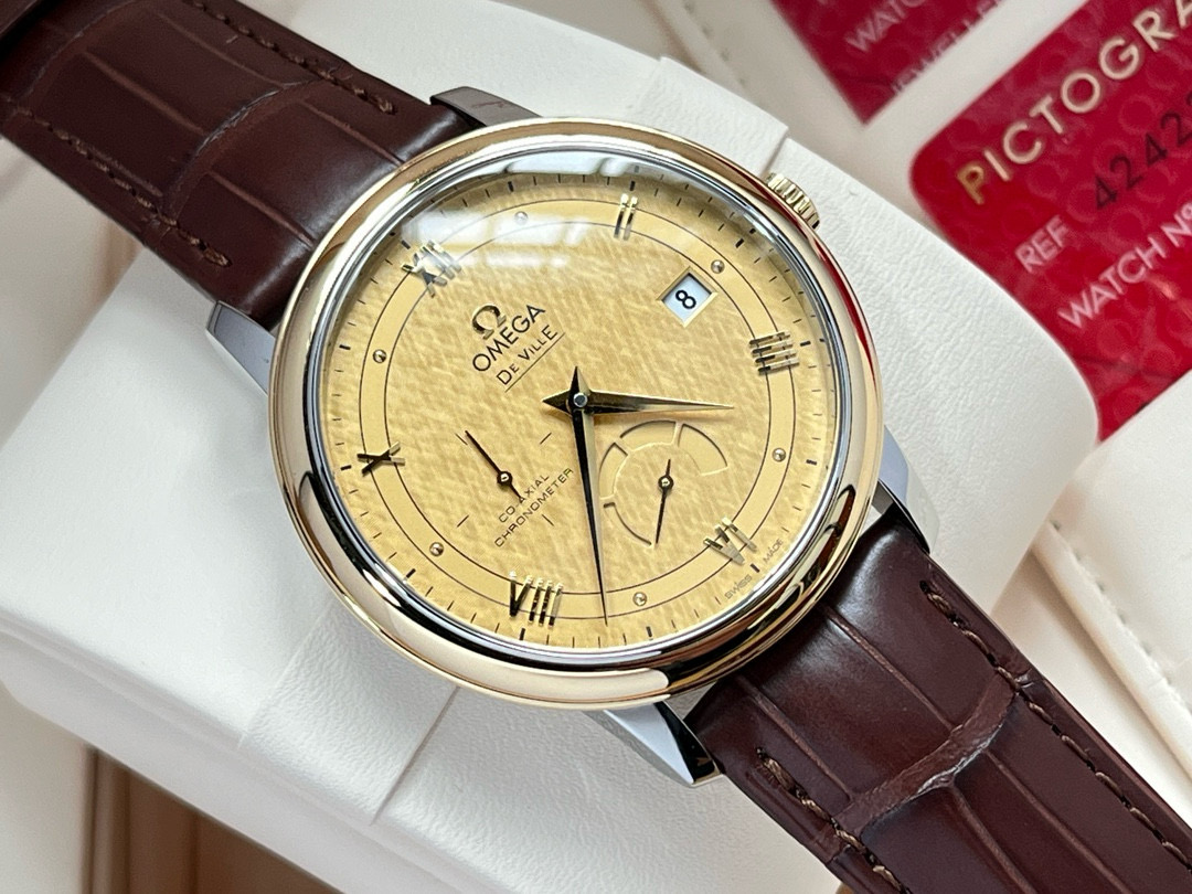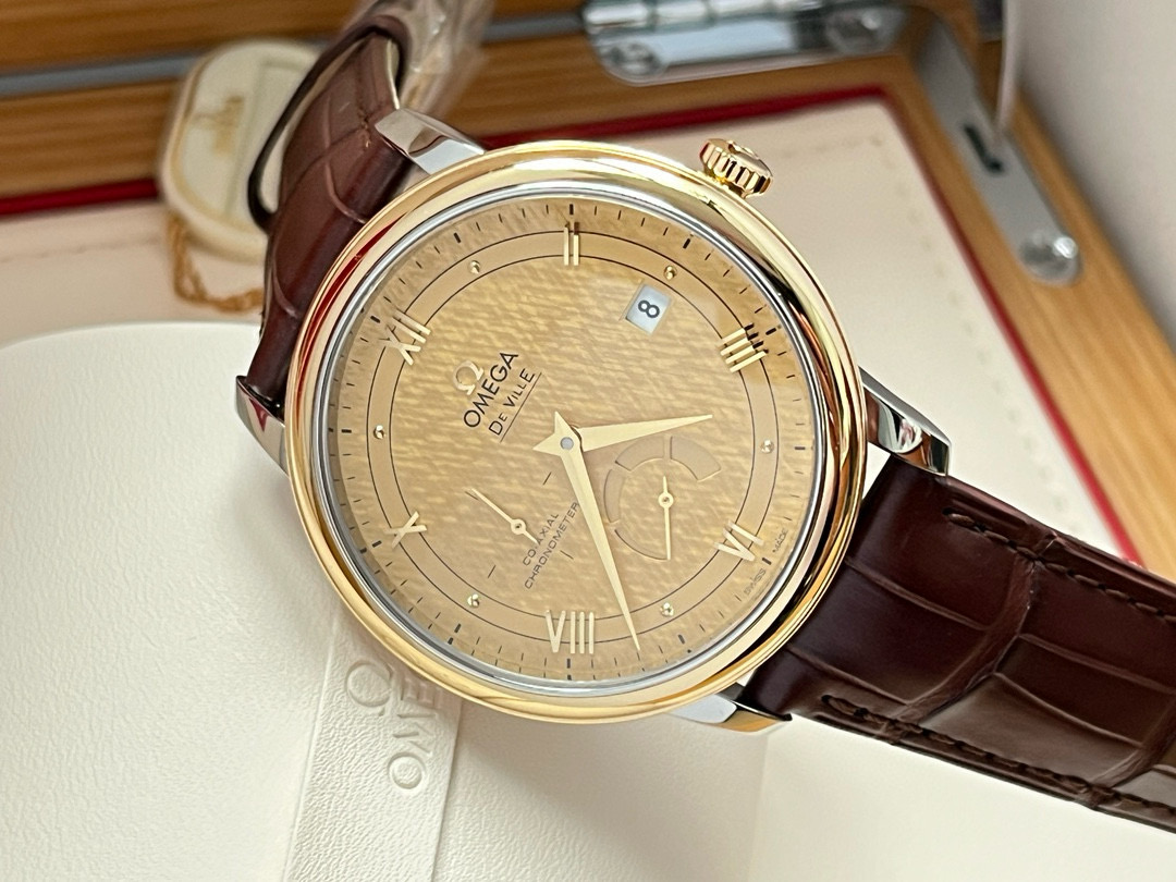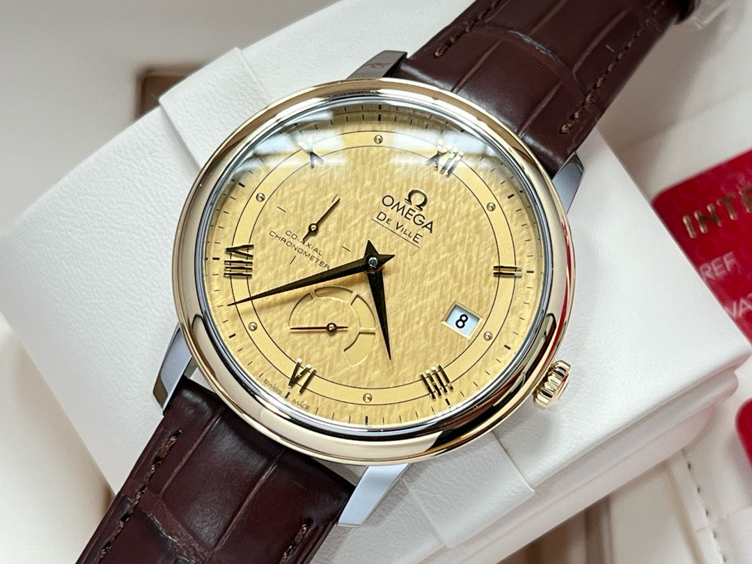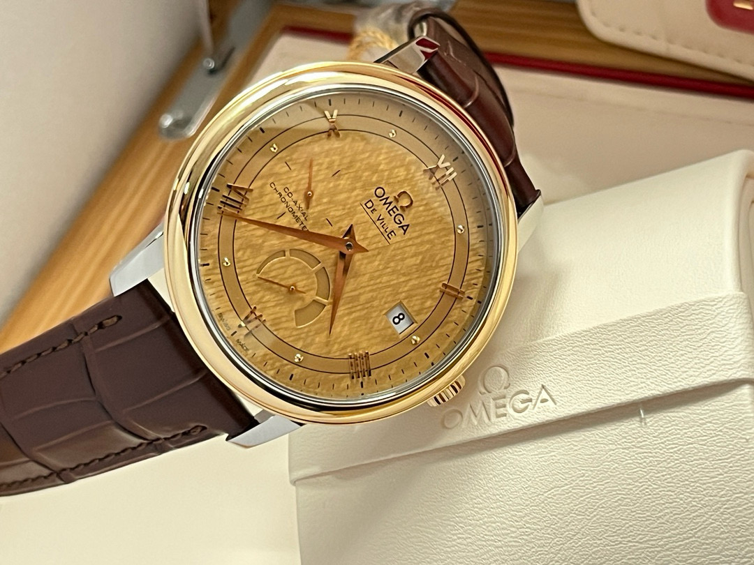 欧米茄 碟飞 新款轨道黄金面 动显 18k玫瑰金圈 Cal.2627同轴机芯 。现全新全套、空白保卡。 表径39.5mm 热门休闲百搭款 工价55200,现未使用品好价