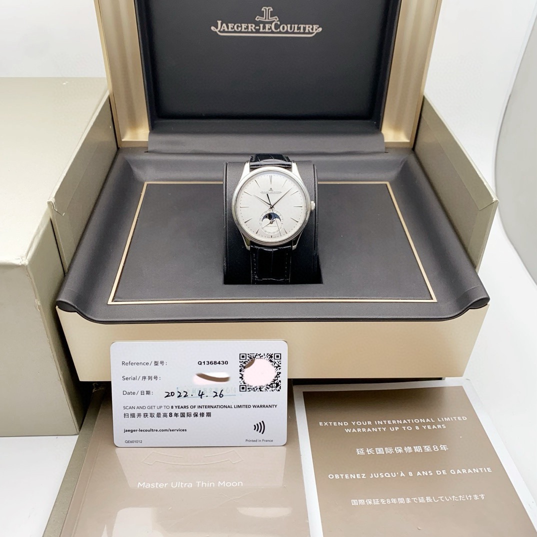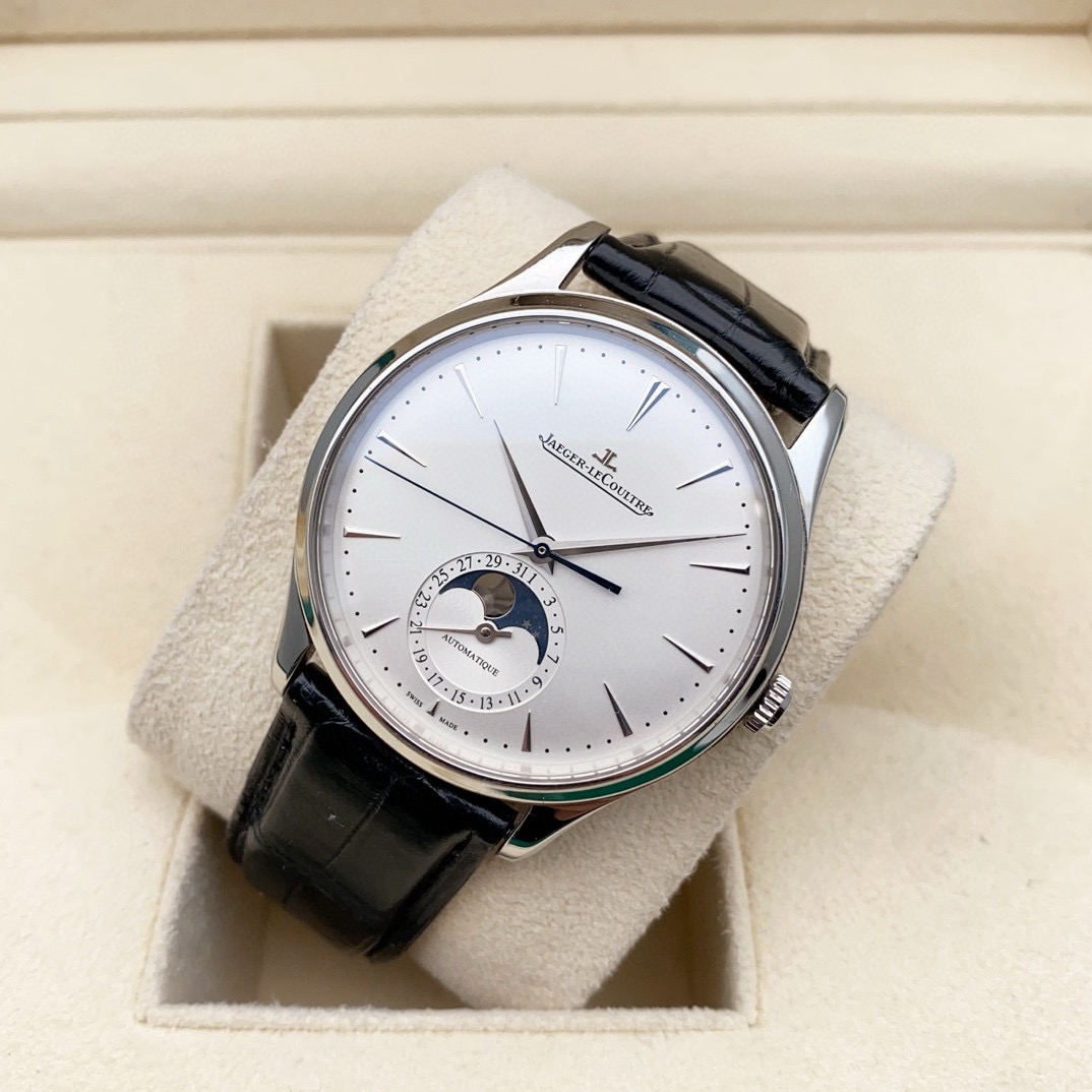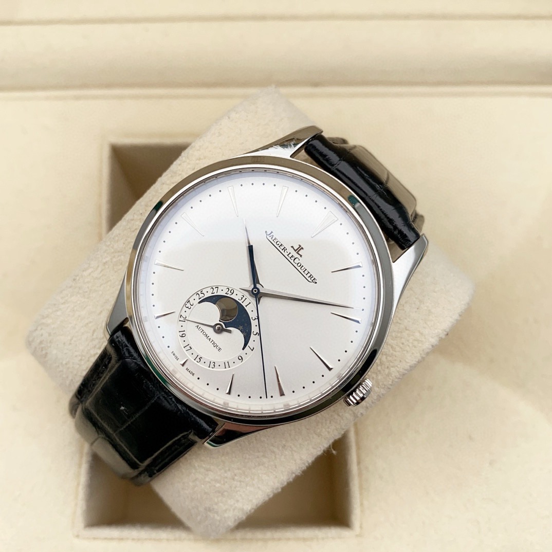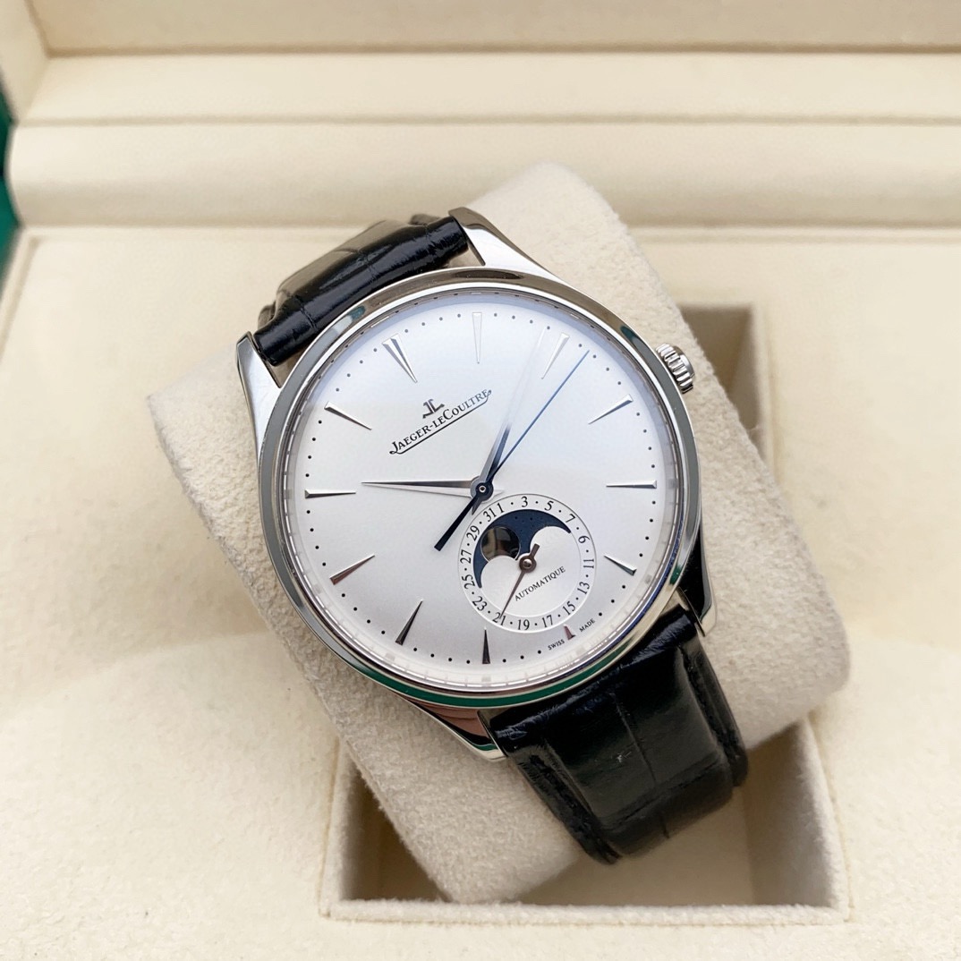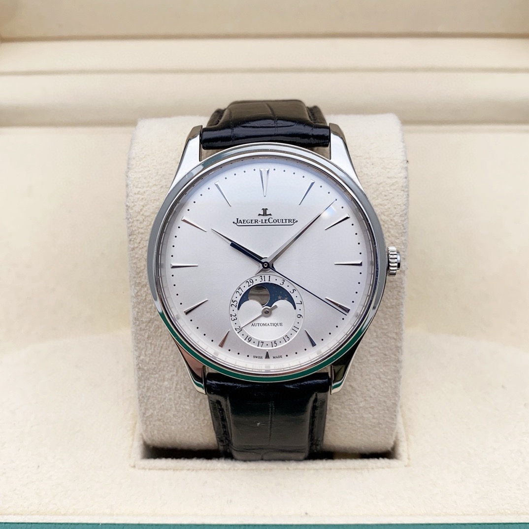 积家 大师系列1368430男士自动机械腕表,39毫米表径,精钢材质,新款大师月相,正装腕表首选,22年4月保卡,原始成色,延保八年,公价92000,现货好价!