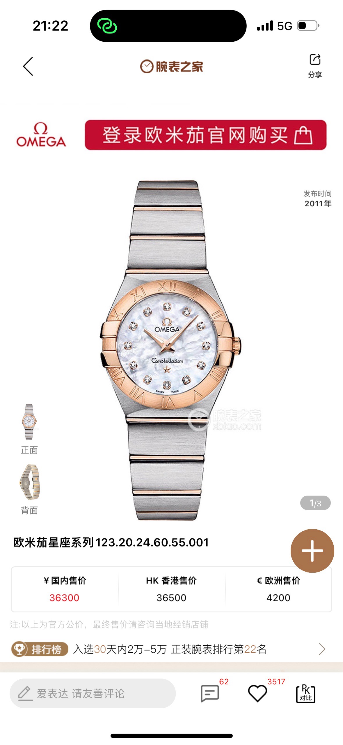欧米茄星座系列123.20.24.60.55.001女士石英腕表,24毫米表径,精钢材质,18k红金材质,公价36300,附件 极品全套
