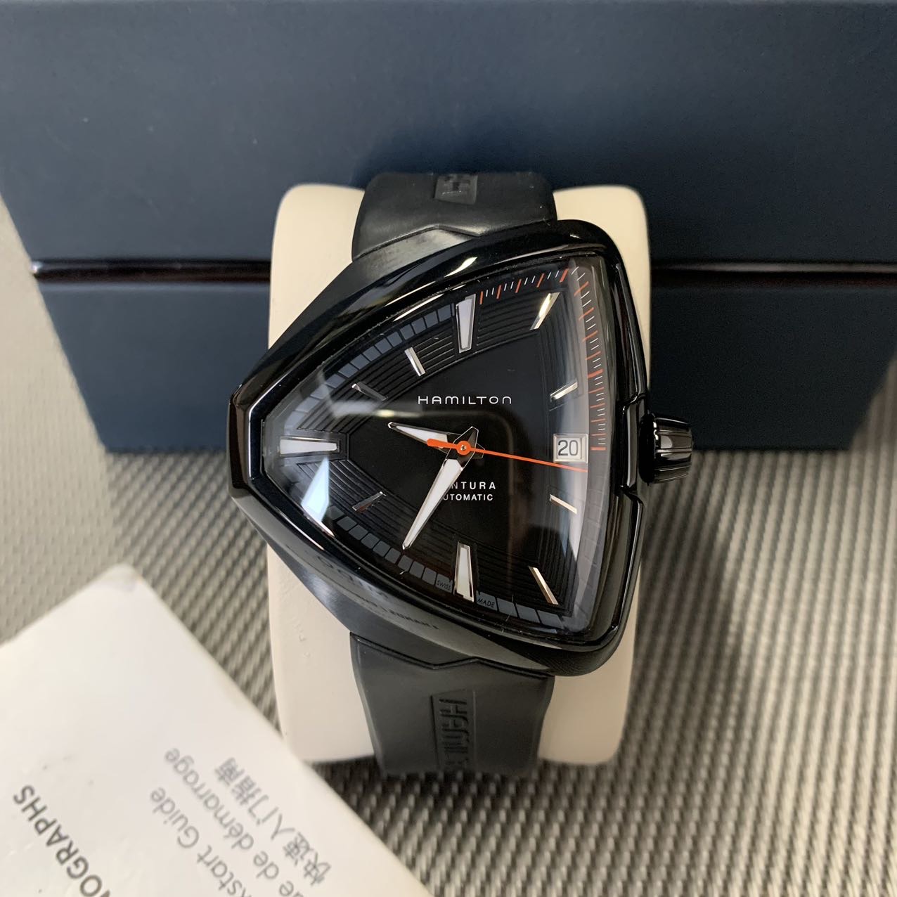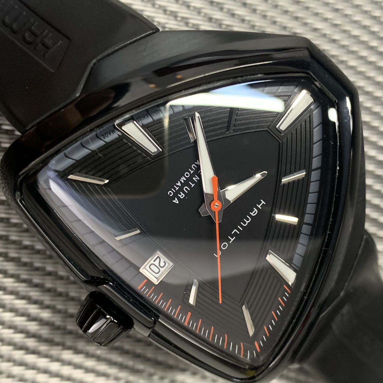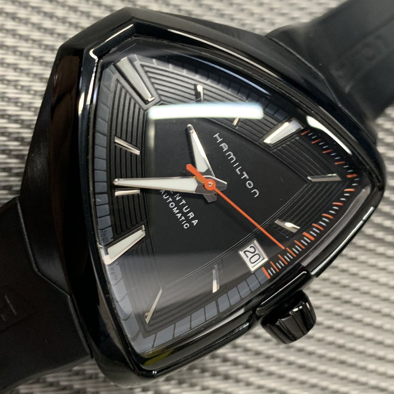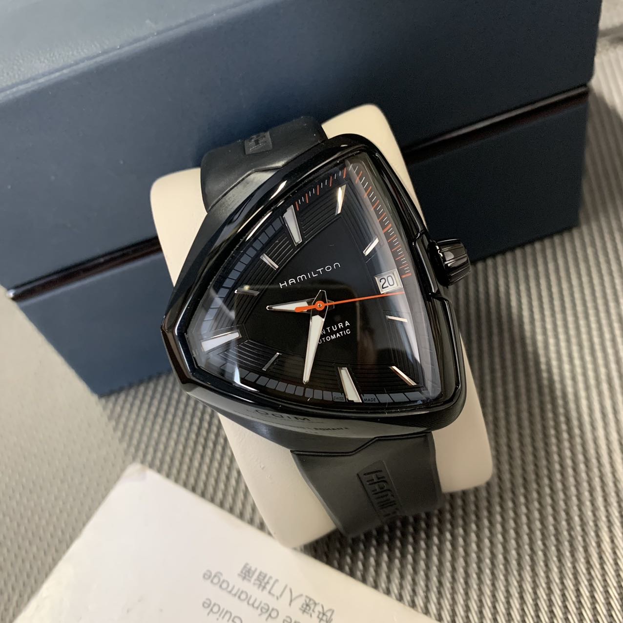 汉密尔顿探险系列-猫王纪念款,公价11000元,表径44mm。全套附件齐全,极品成色97新,PVD电镀黑表壳,子弹形设计表壳 散发出一种奋勇拼搏的精神,高颜值夸张设计 弧形流线佩戴舒适。