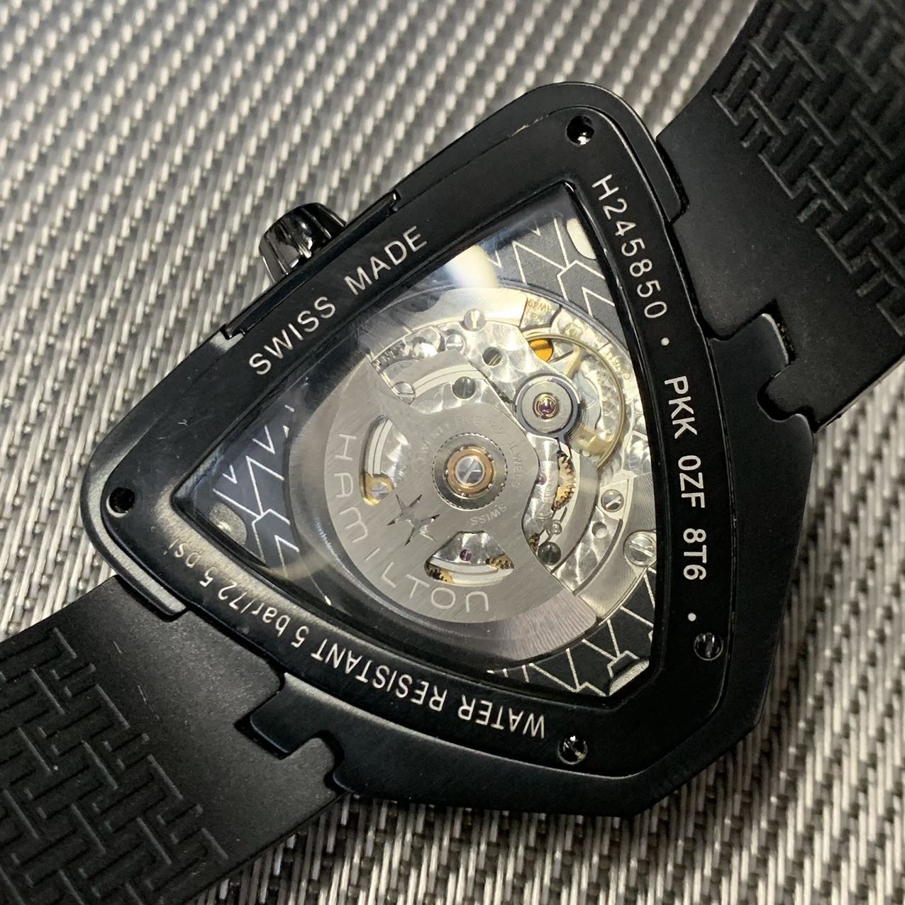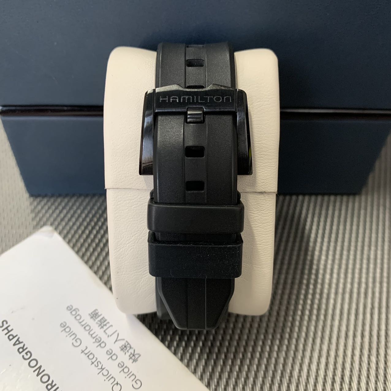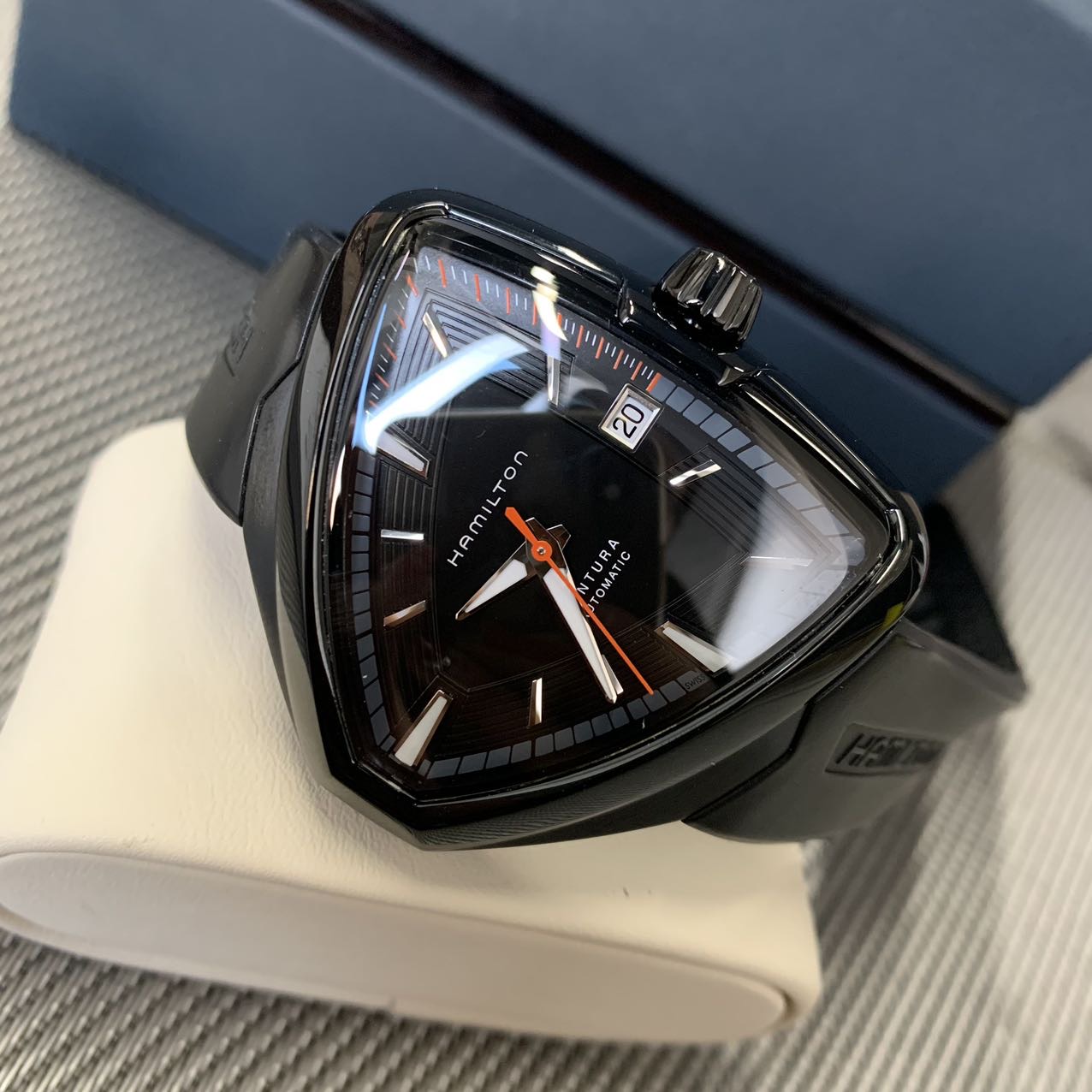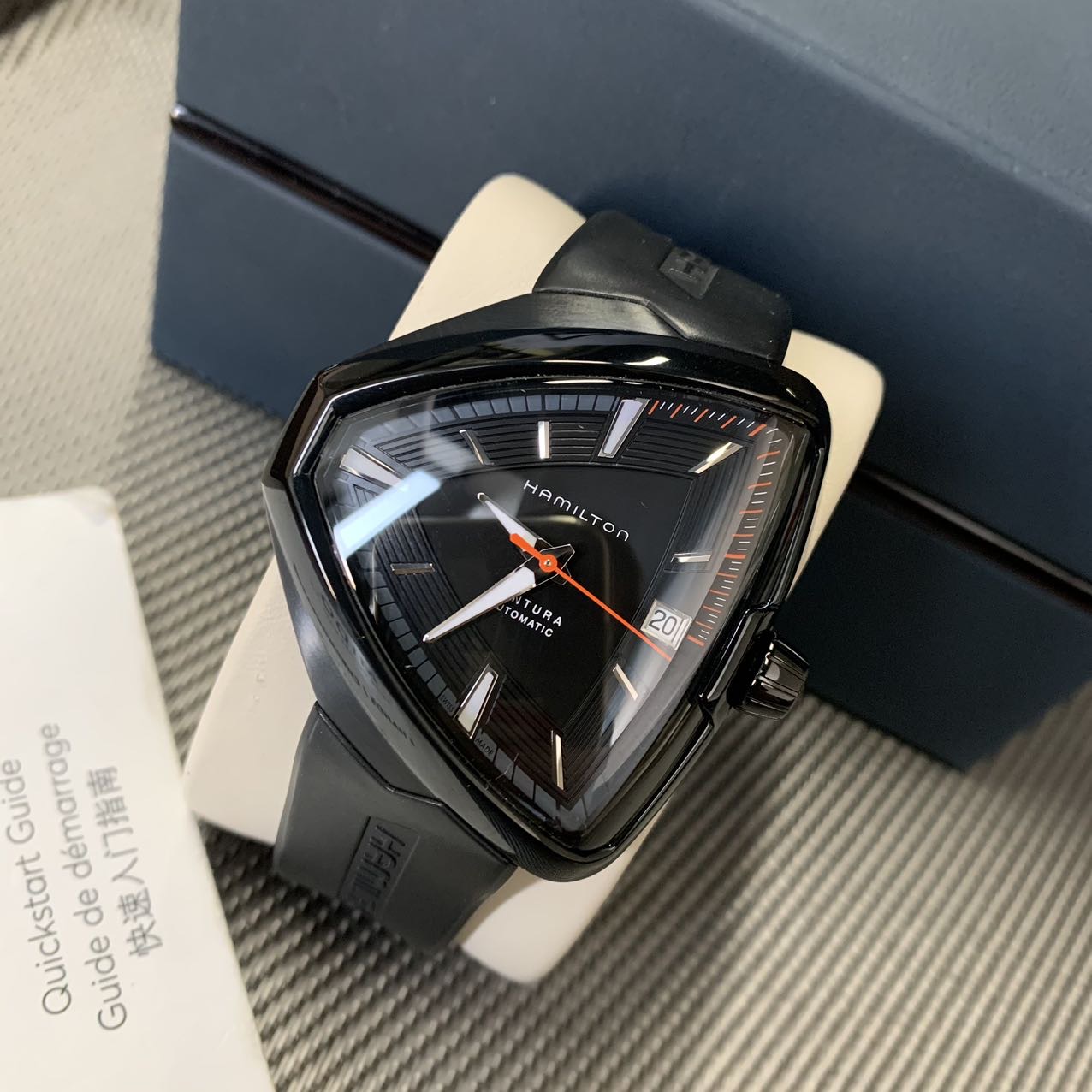 汉密尔顿探险系列-猫王纪念款,公价11000元,表径44mm。全套附件齐全,极品成色97新,PVD电镀黑表壳,子弹形设计表壳 散发出一种奋勇拼搏的精神,高颜值夸张设计 弧形流线佩戴舒适。