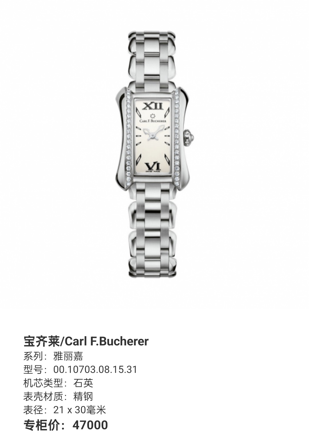 宝齐莱/Carl F.Bucherer 雅丽嘉 00.10703.08.15.31 石英 精钢 21 x 30毫米 专柜价47000~现好价