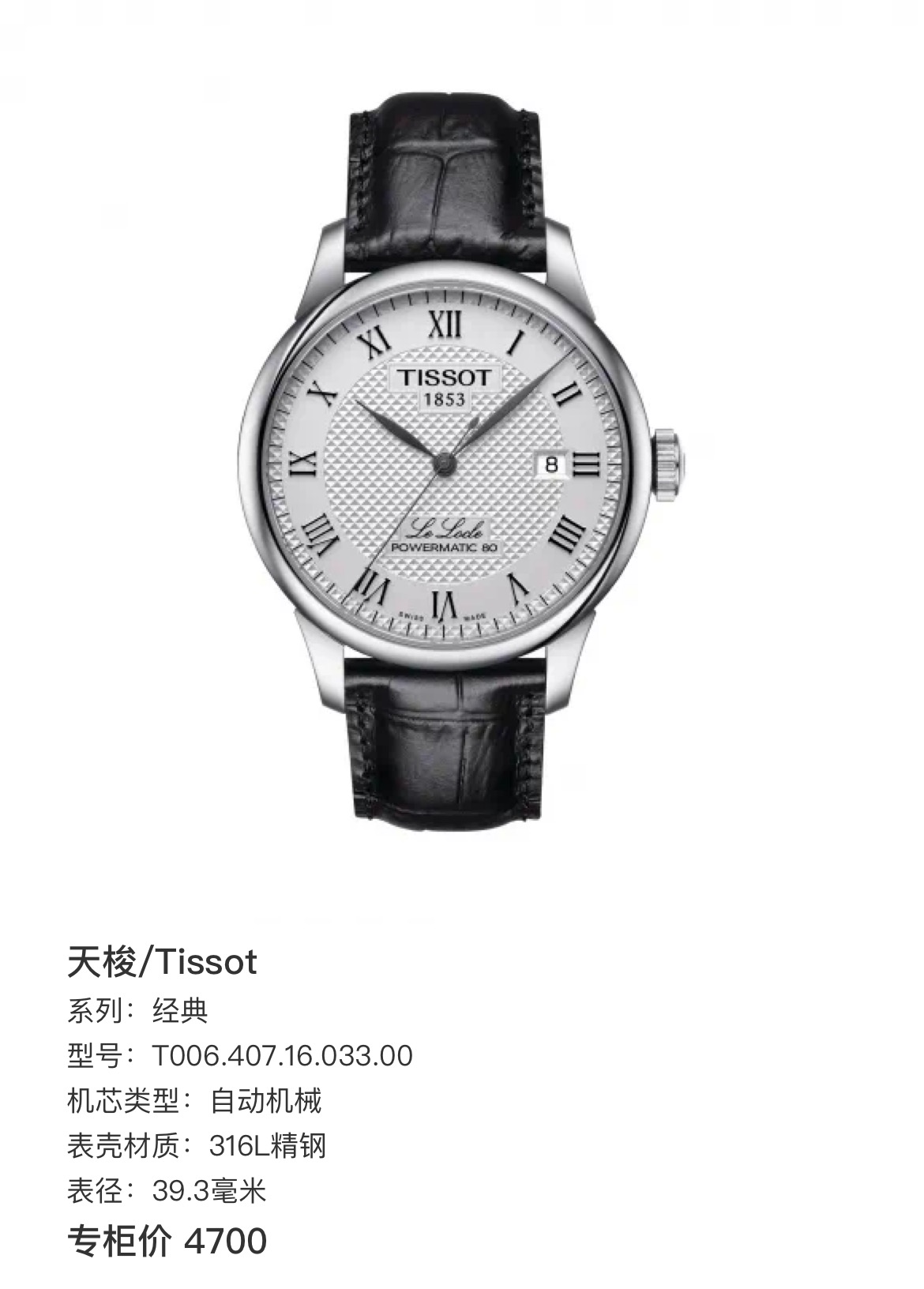 型号:T006.407.16.033.00机芯类型:自动机械表壳材质:316L精钢表径:39.3毫米