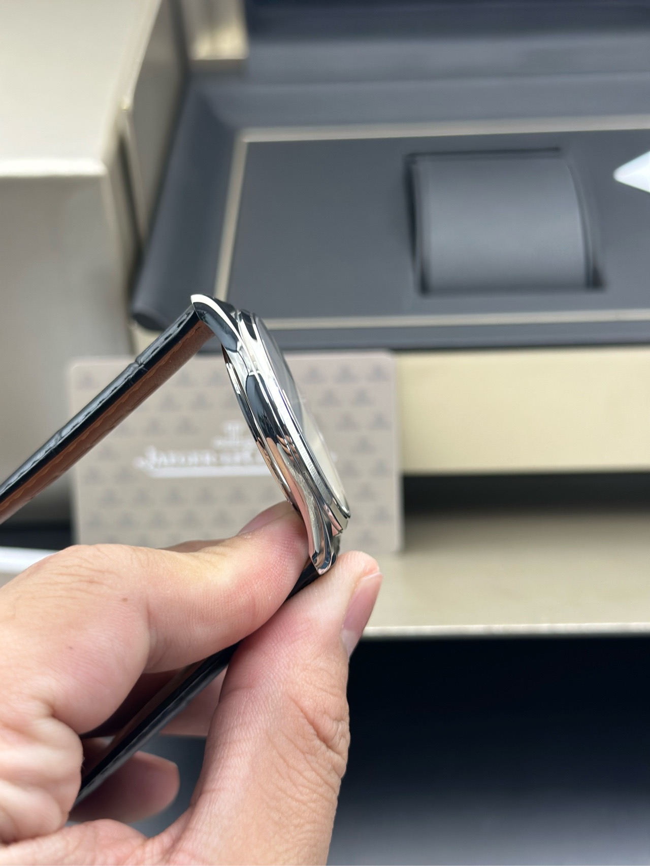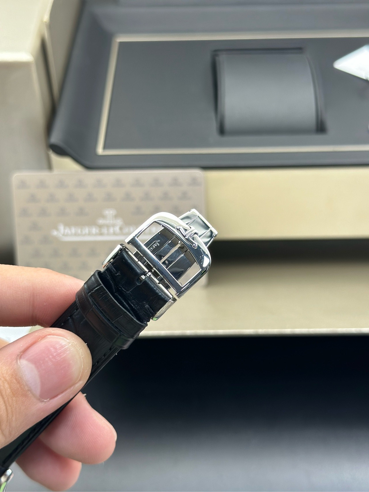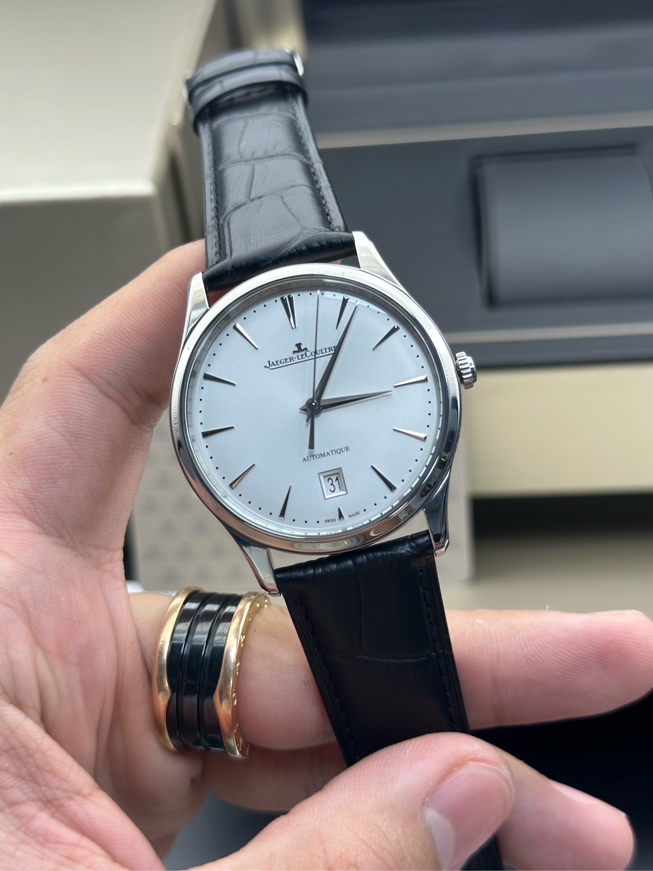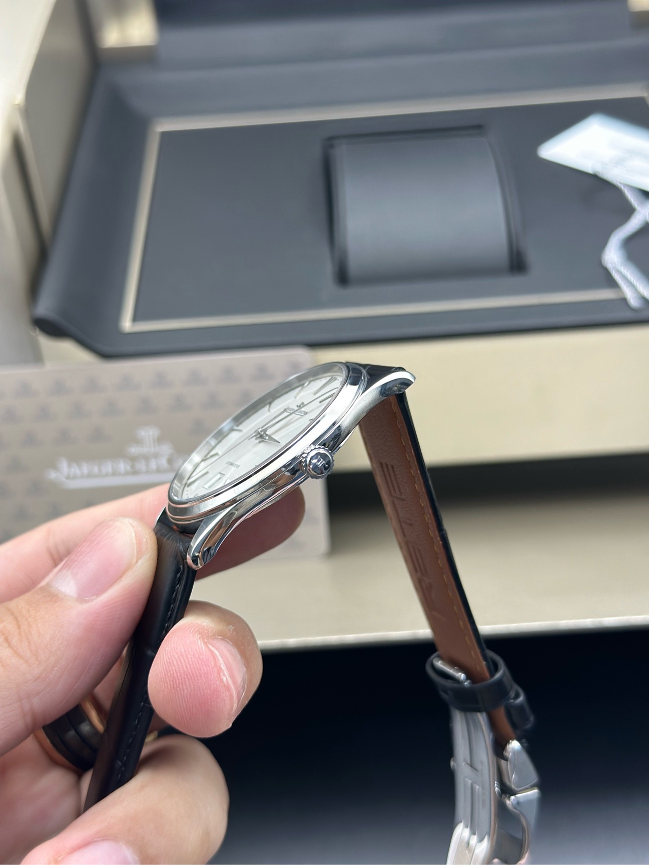 积家 大师系列Q1238420男士机械腕表,国行全套保卡20年11月已延保至28年,整表近新表径39新换皮带,金坨机芯,新款的简约大三针超薄大师,原价74000现货好价!