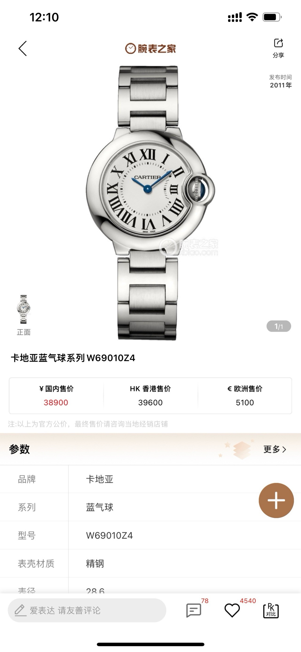 卡地亚蓝气球BALLON BLANCW69010Z4石英女性