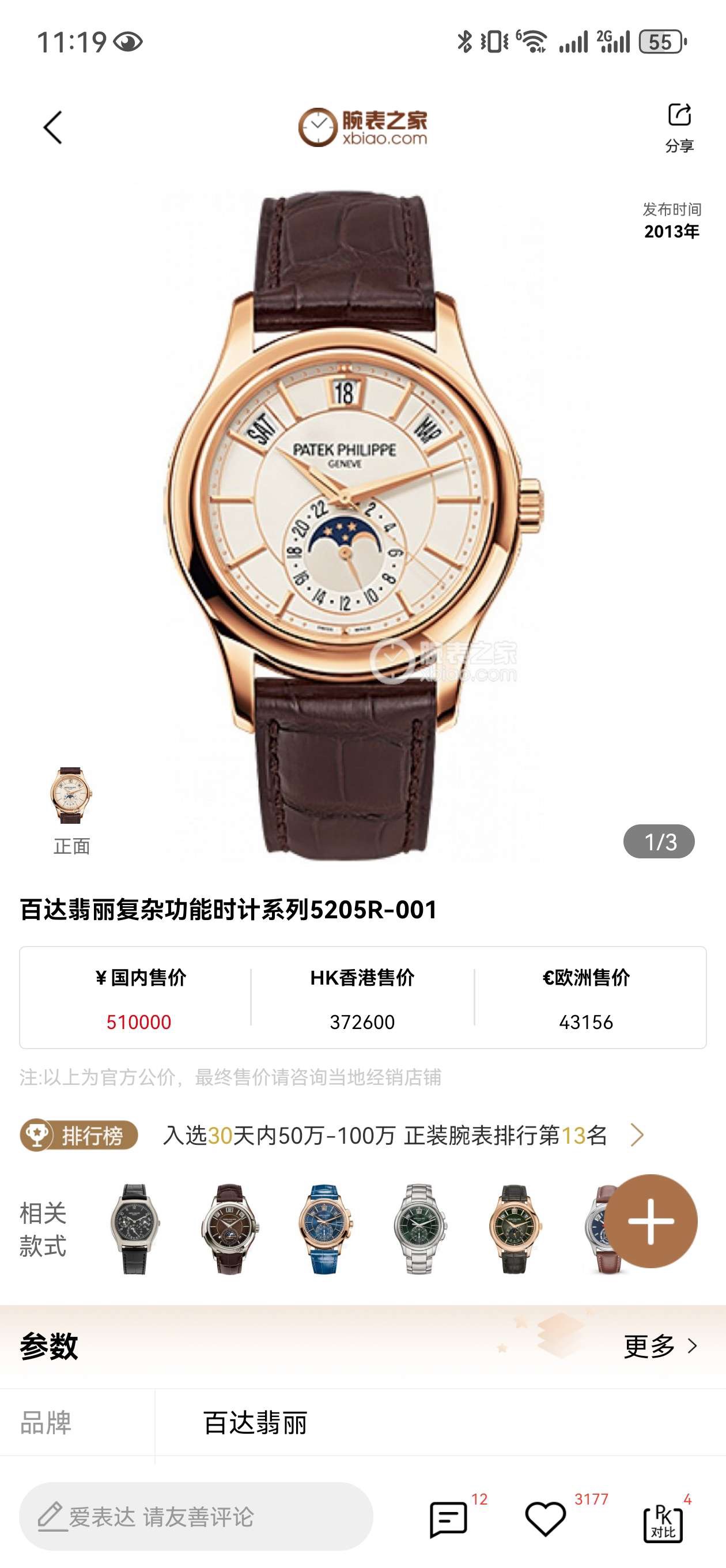百达翡丽/Patek Philippe 复杂功能时计 5205R-001 自动机械机芯 18k玫瑰金 40毫米 专柜价510000~2013年大全套