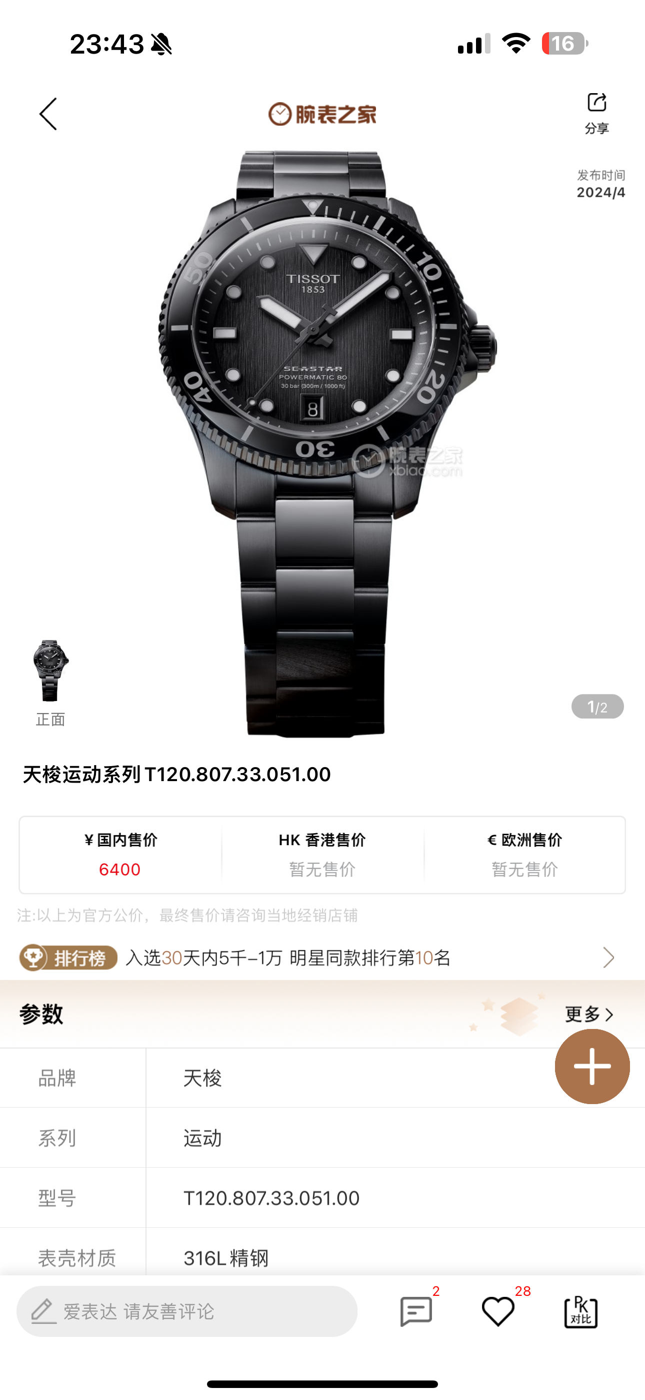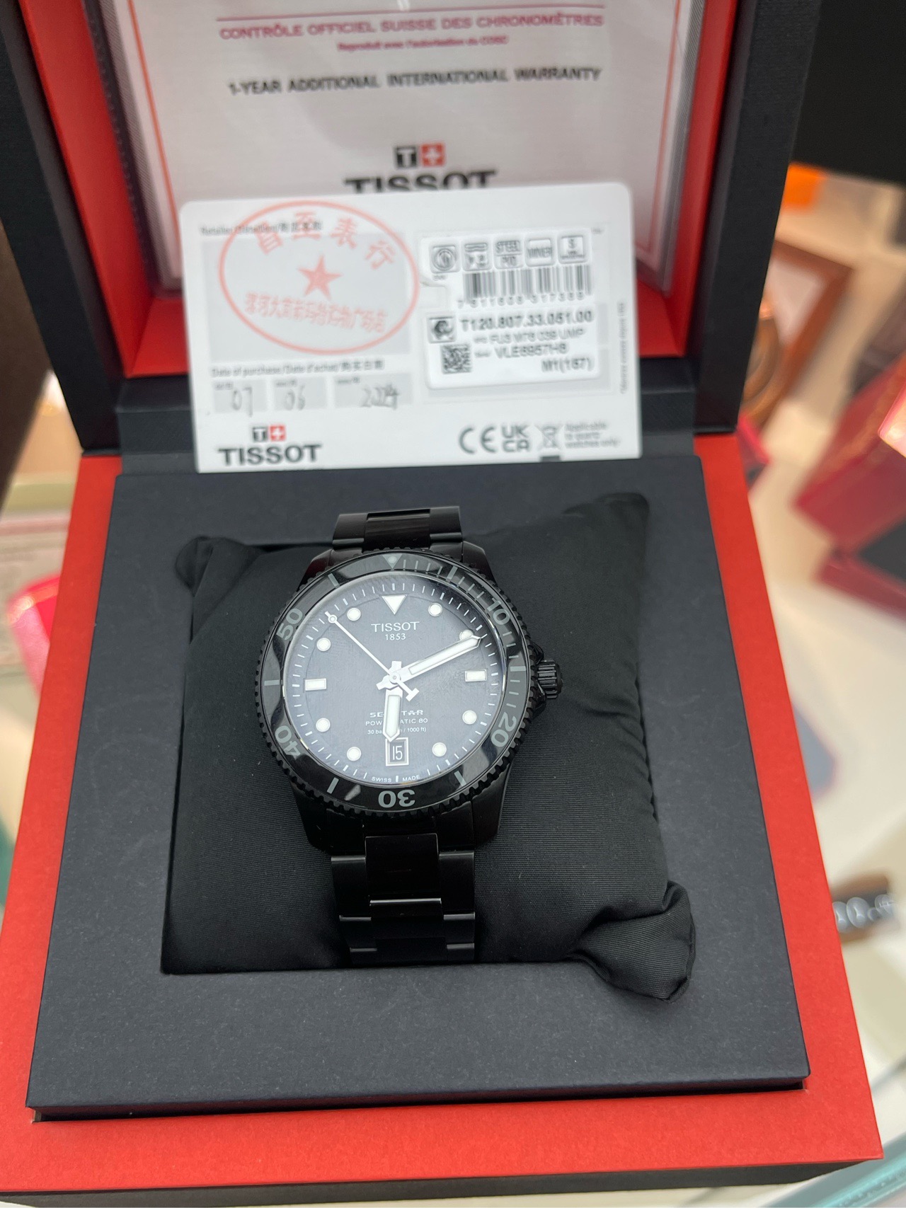 天梭 运动系列 T120.807.33.051.00 男士 自动机械 专柜价6400 2024年6月卡全套未使用,现货好价!