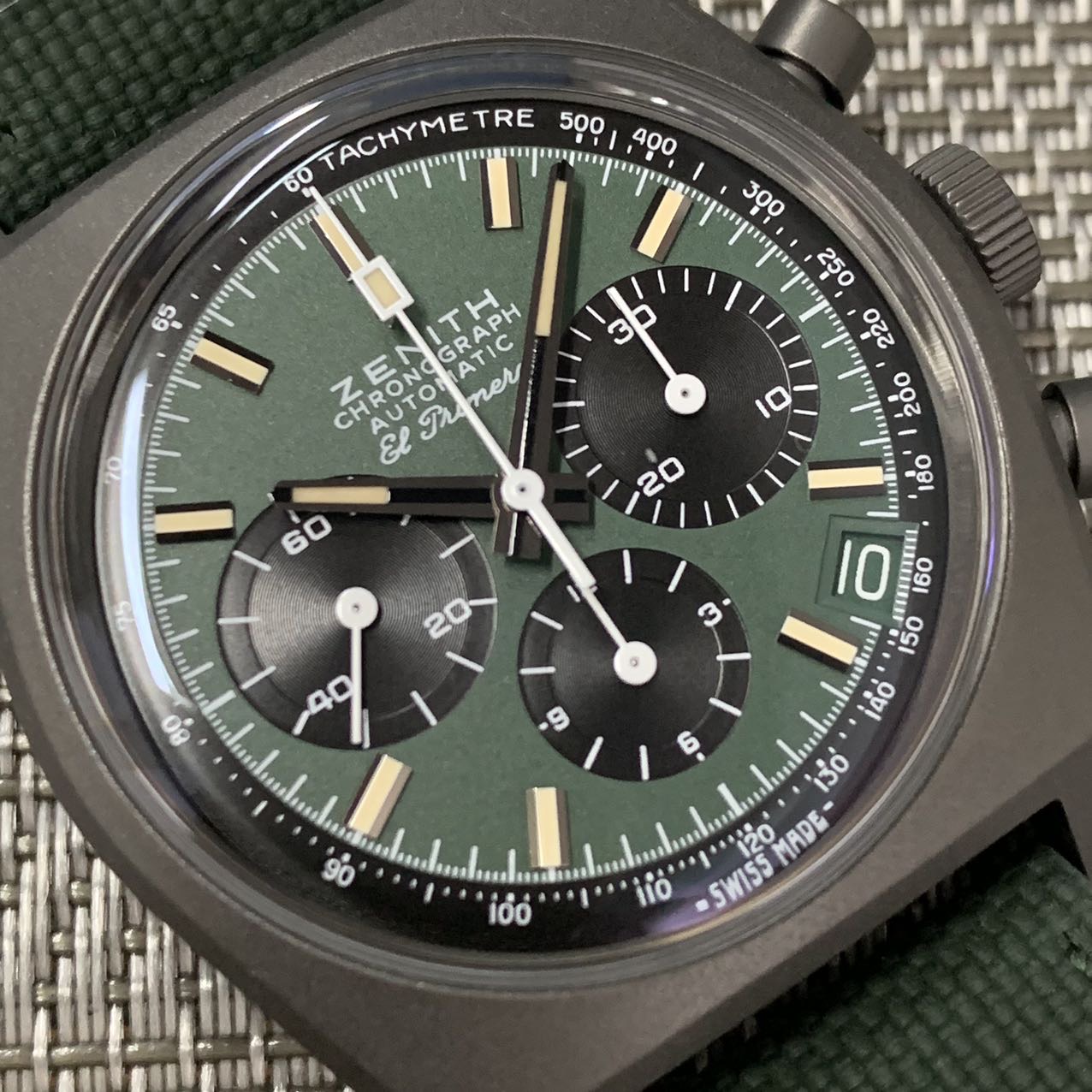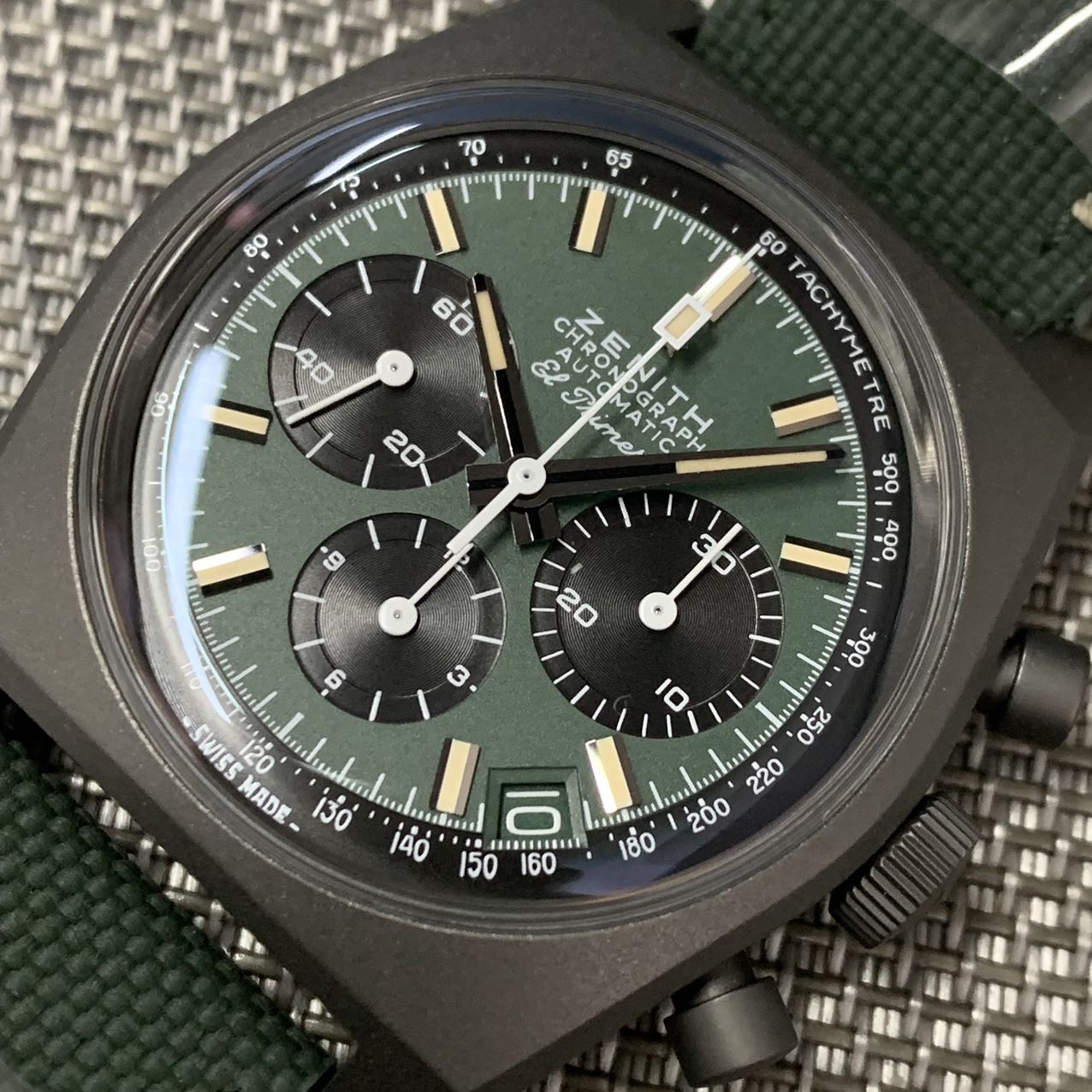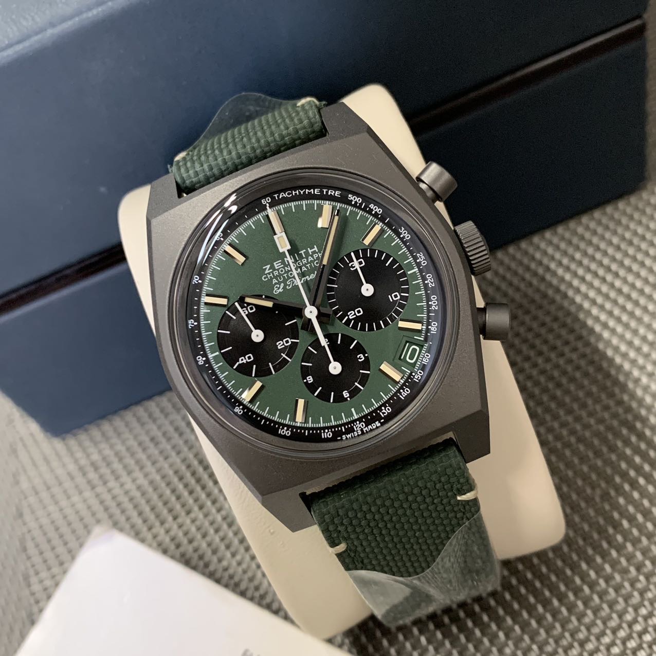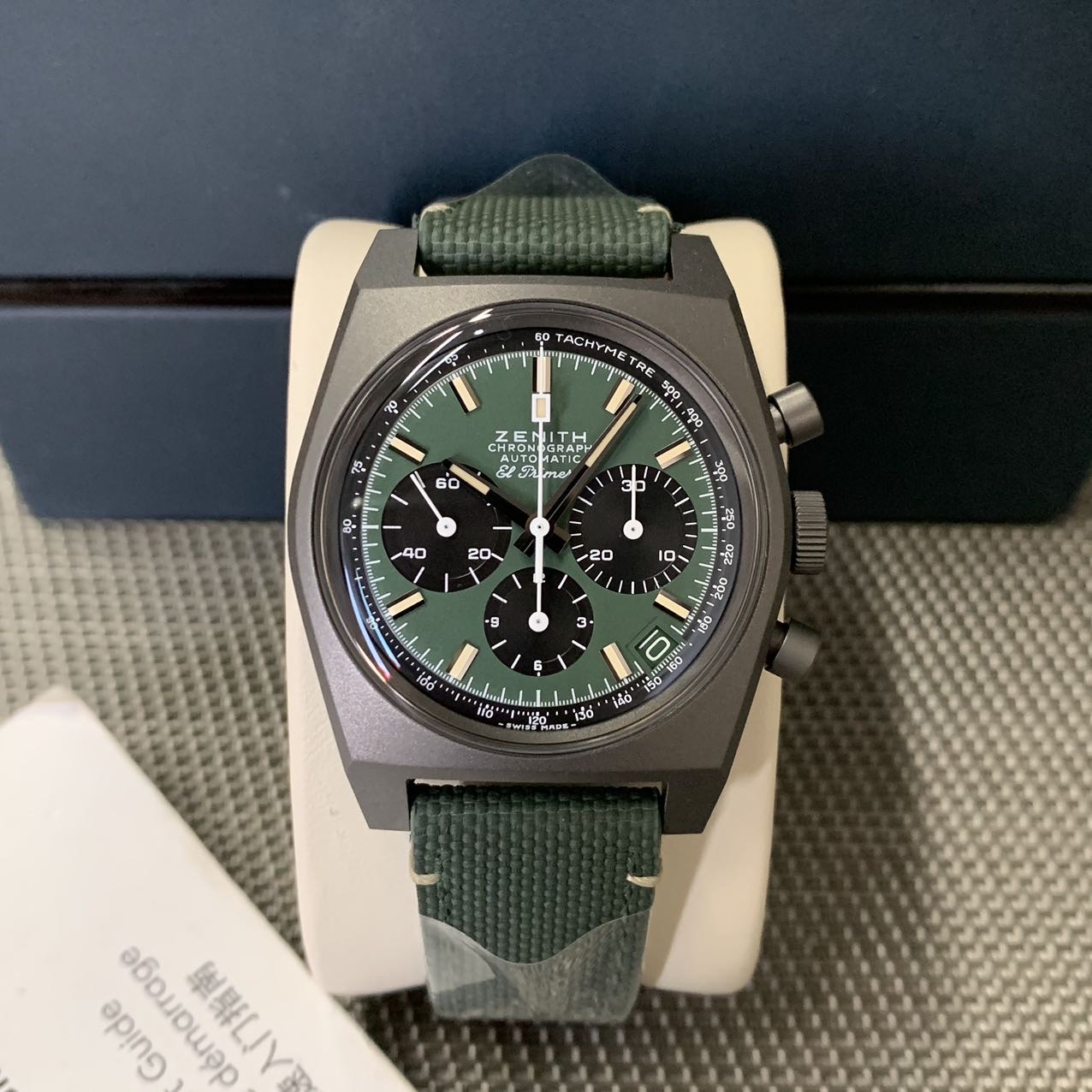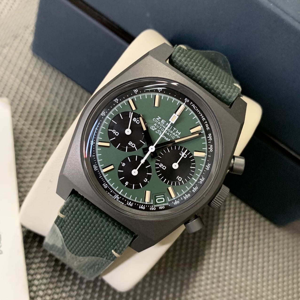 真力时旗舰系列-Safari 复刻版,公价7.37万,表径37mm,全套 收藏未使用品(2022年购买),绿色面表盘 三眼计时盘面布局,喷砂工艺 钛合金材质表壳,新款PRIMERO 400机芯,国内现货不超10支。
