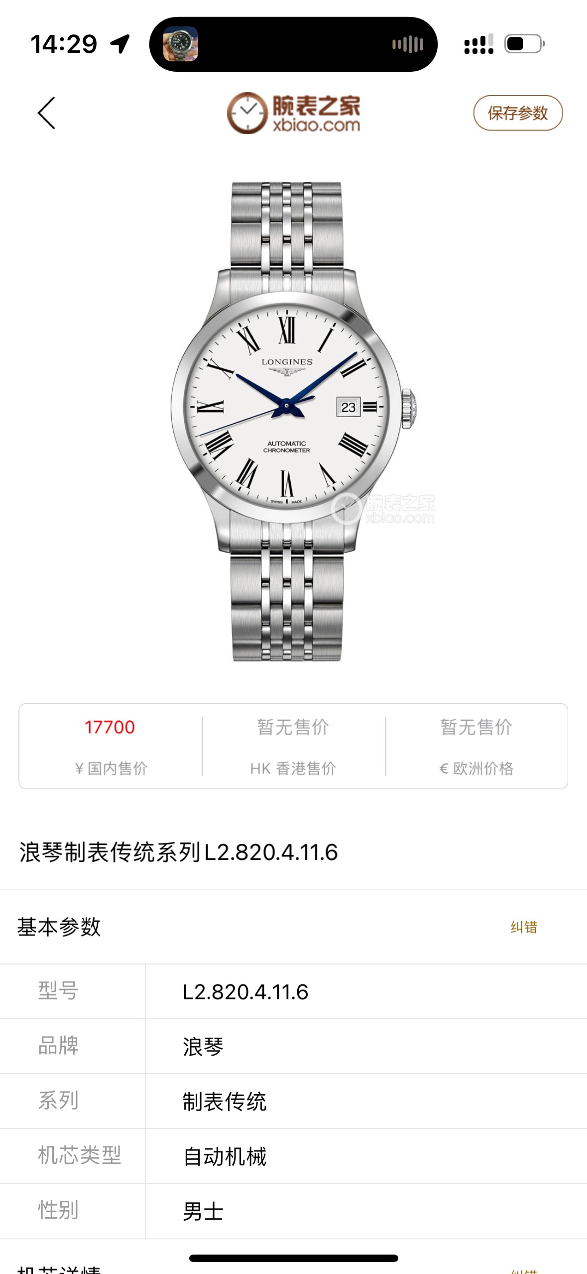 浪琴开创者RECORDL2.820.4.11.6机械男性