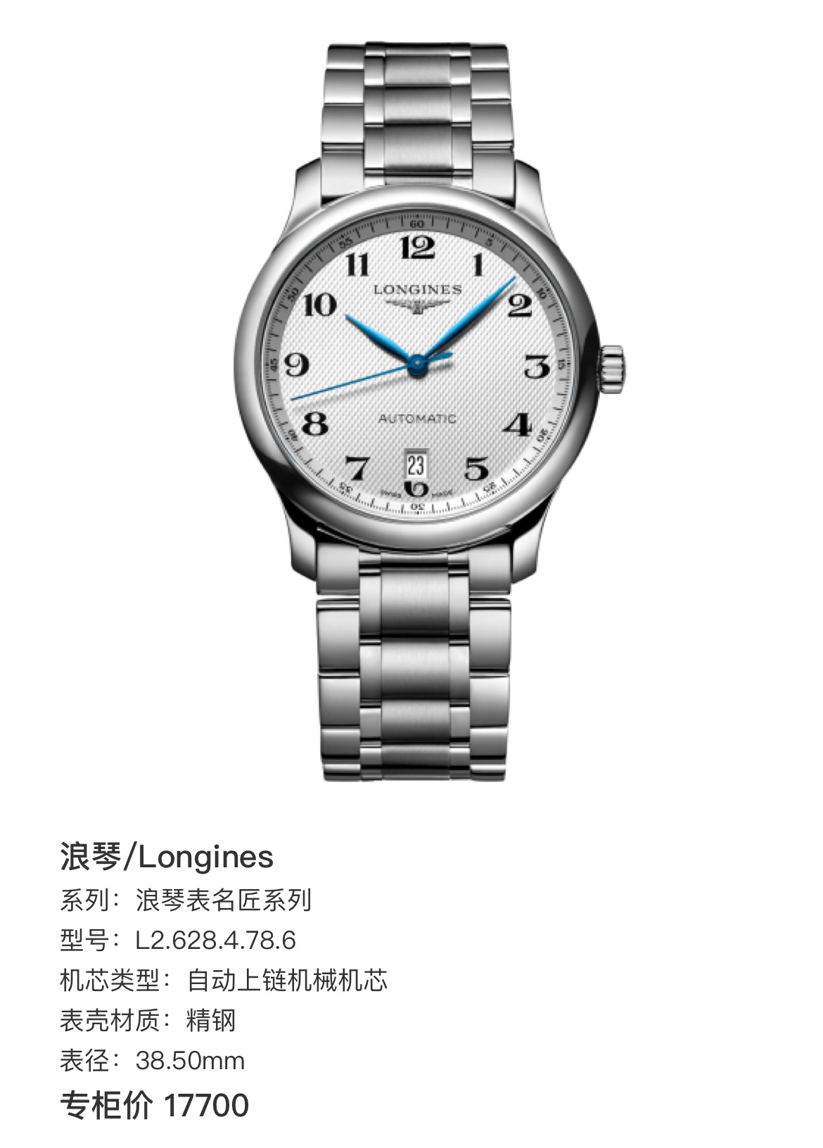 浪琴 名匠系列L2.628.4.78.6男士自动机械腕表,公价17700元,表径38.5mm,全套,成色95新,日历显示功能,经典热门款