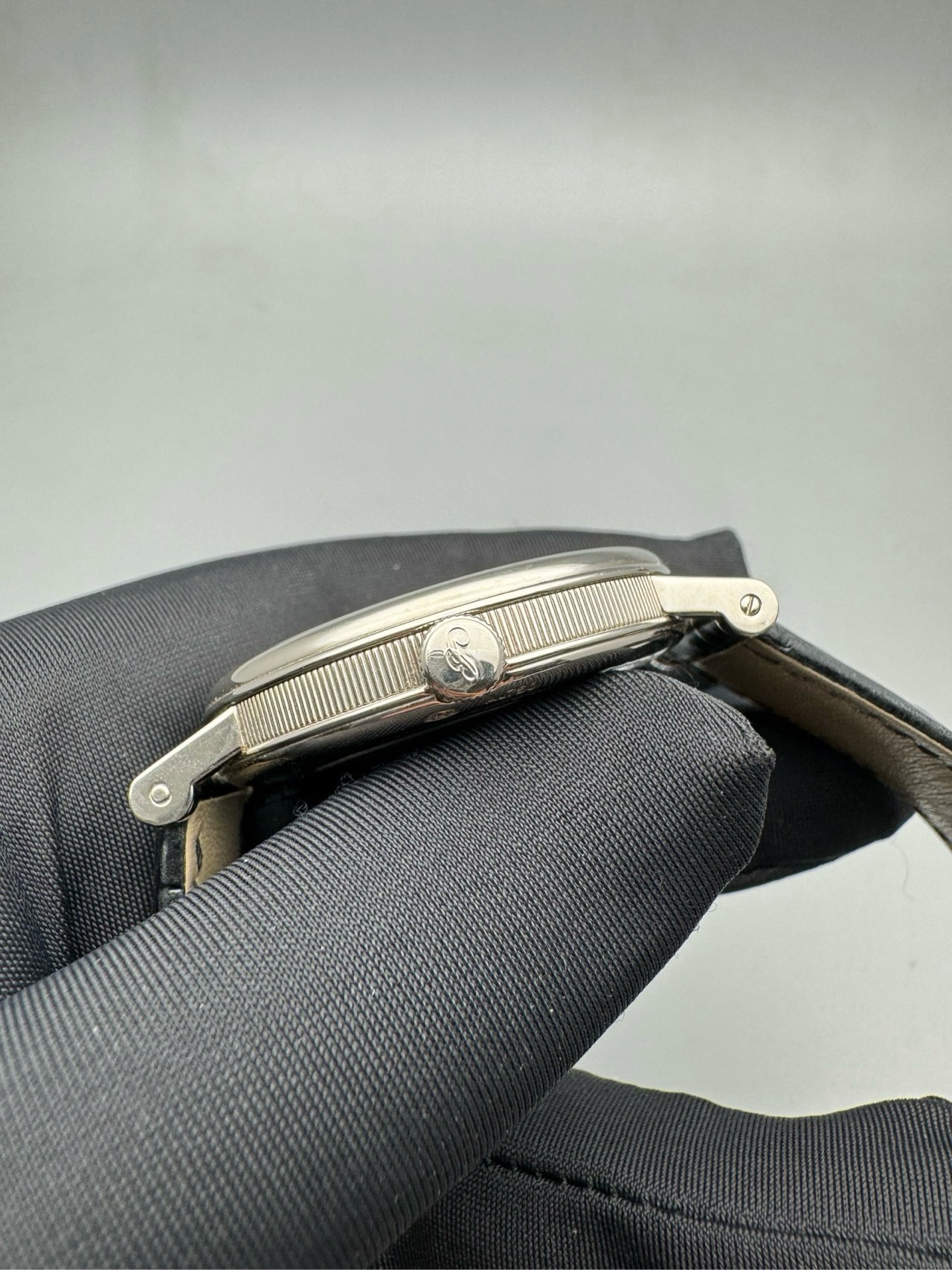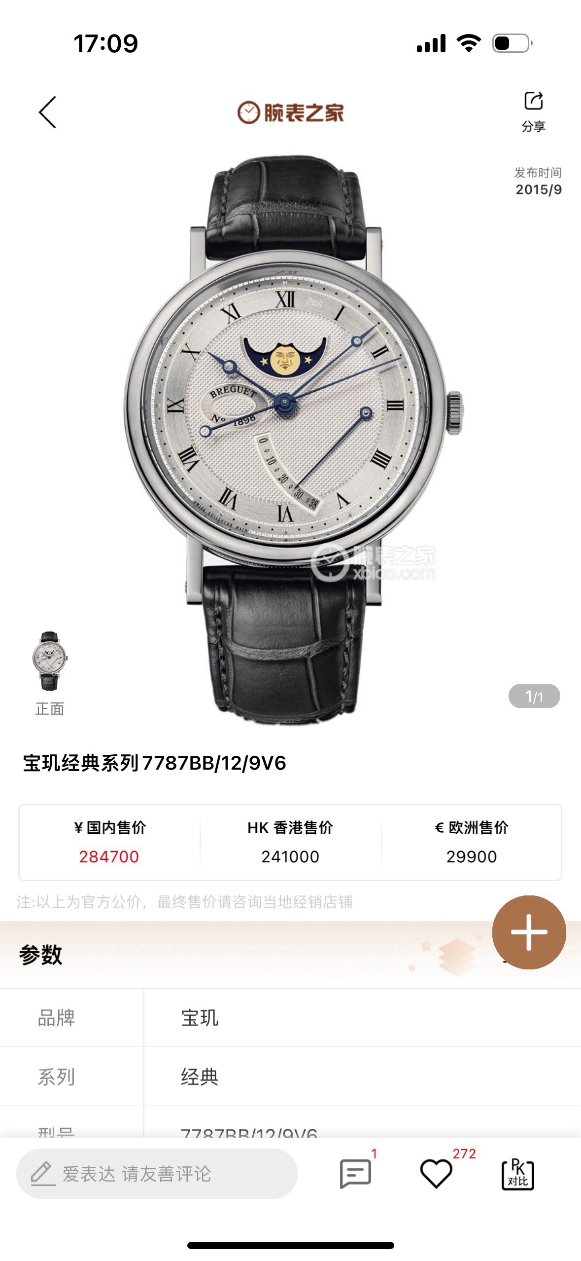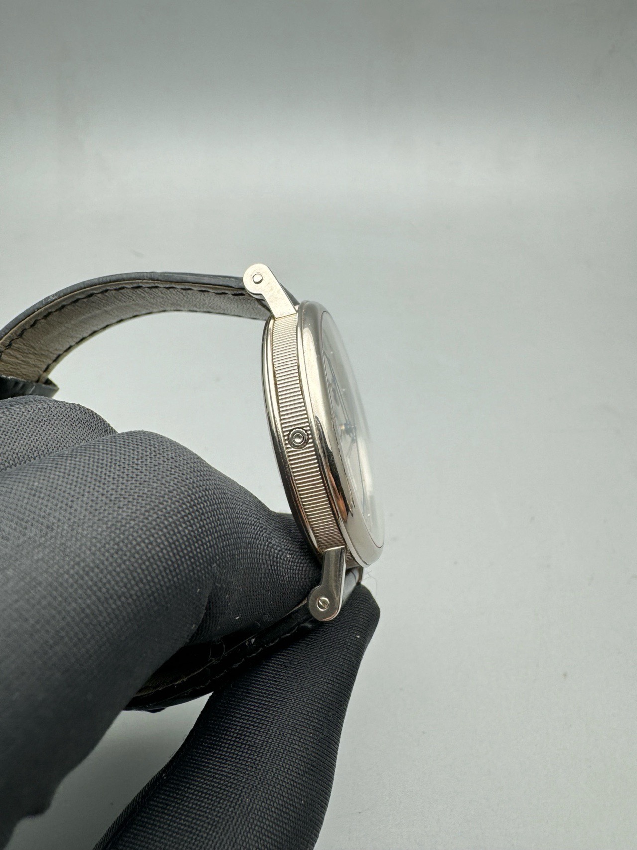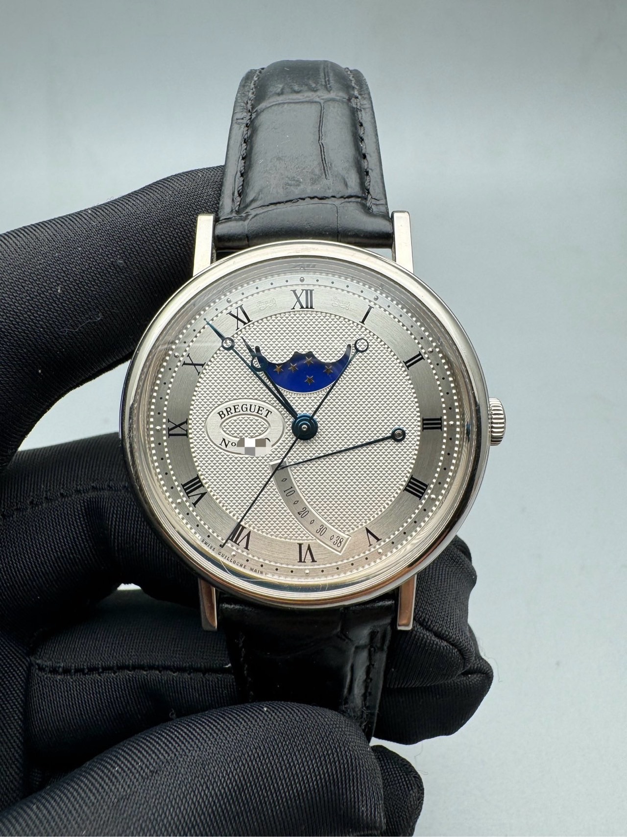 二手单表后配扣,表径39毫米,采用591机芯,动储38小时,防水30米,18k白金表壳,有月相动力储备显示功能,公价284700,现在