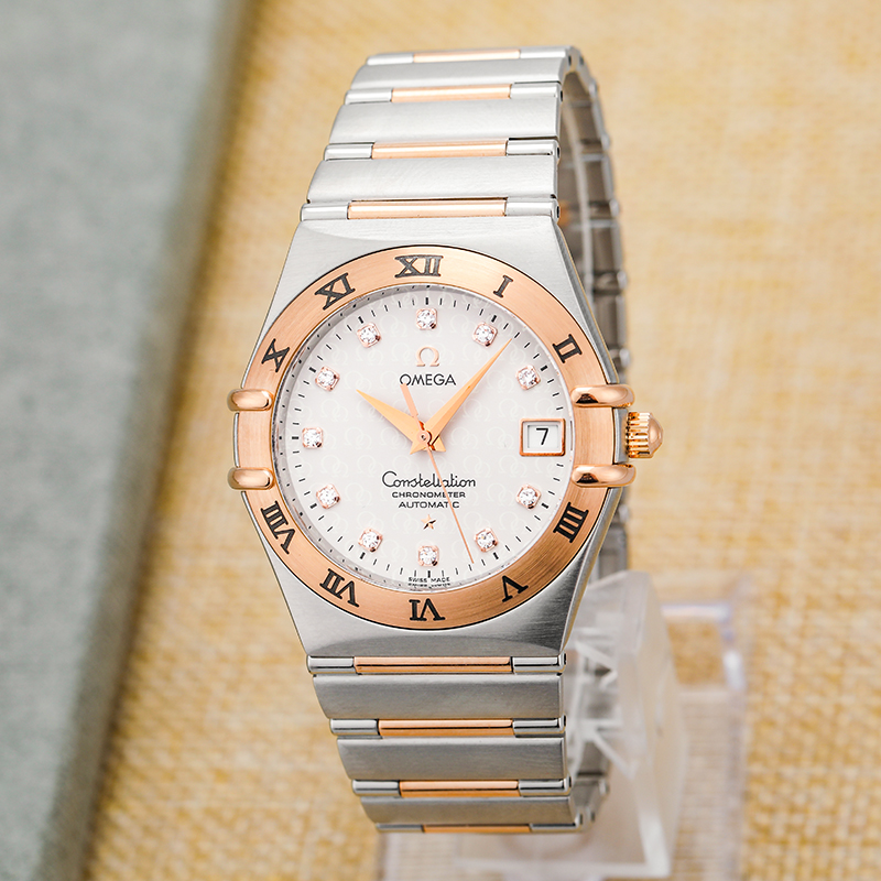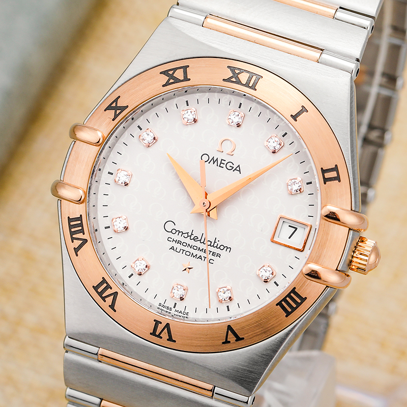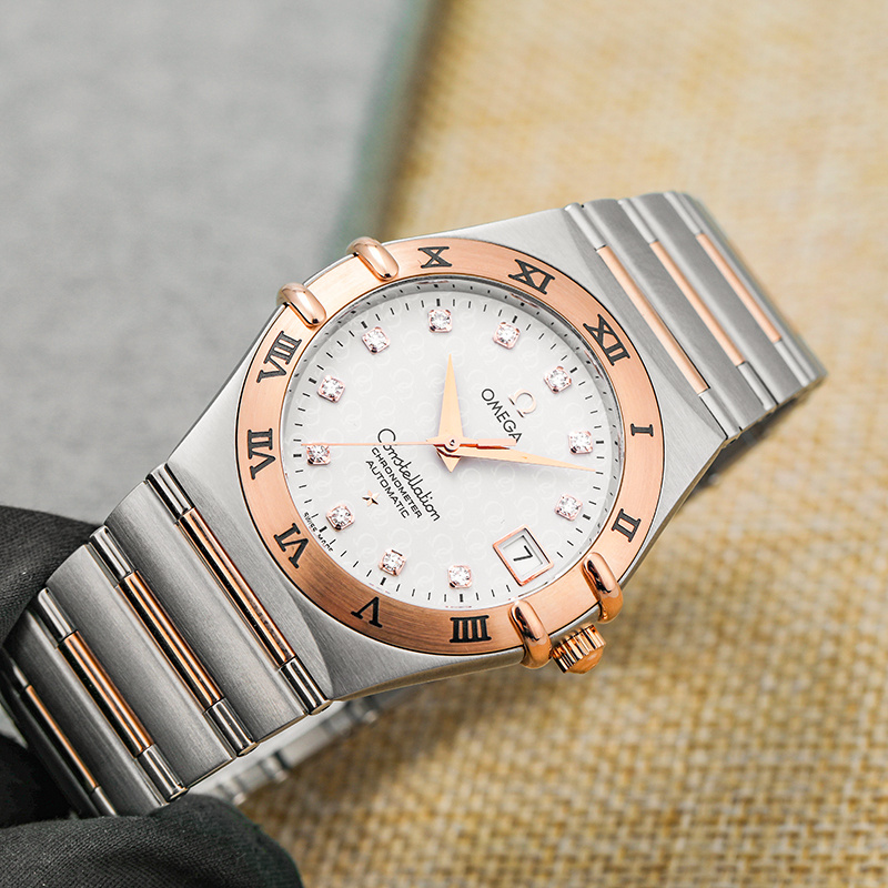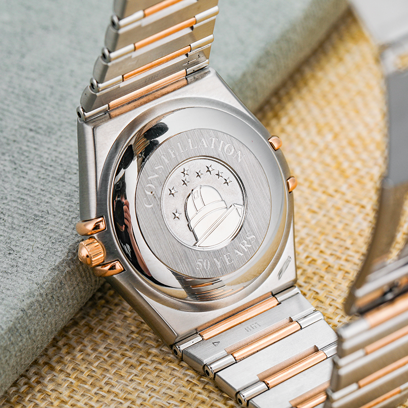 欧米茄星座系列50周年纪念款1304.35.00男士自动机械腕表,35毫米表径,18k玫瑰金精钢材质,镶钻时标,工价42600,现好价