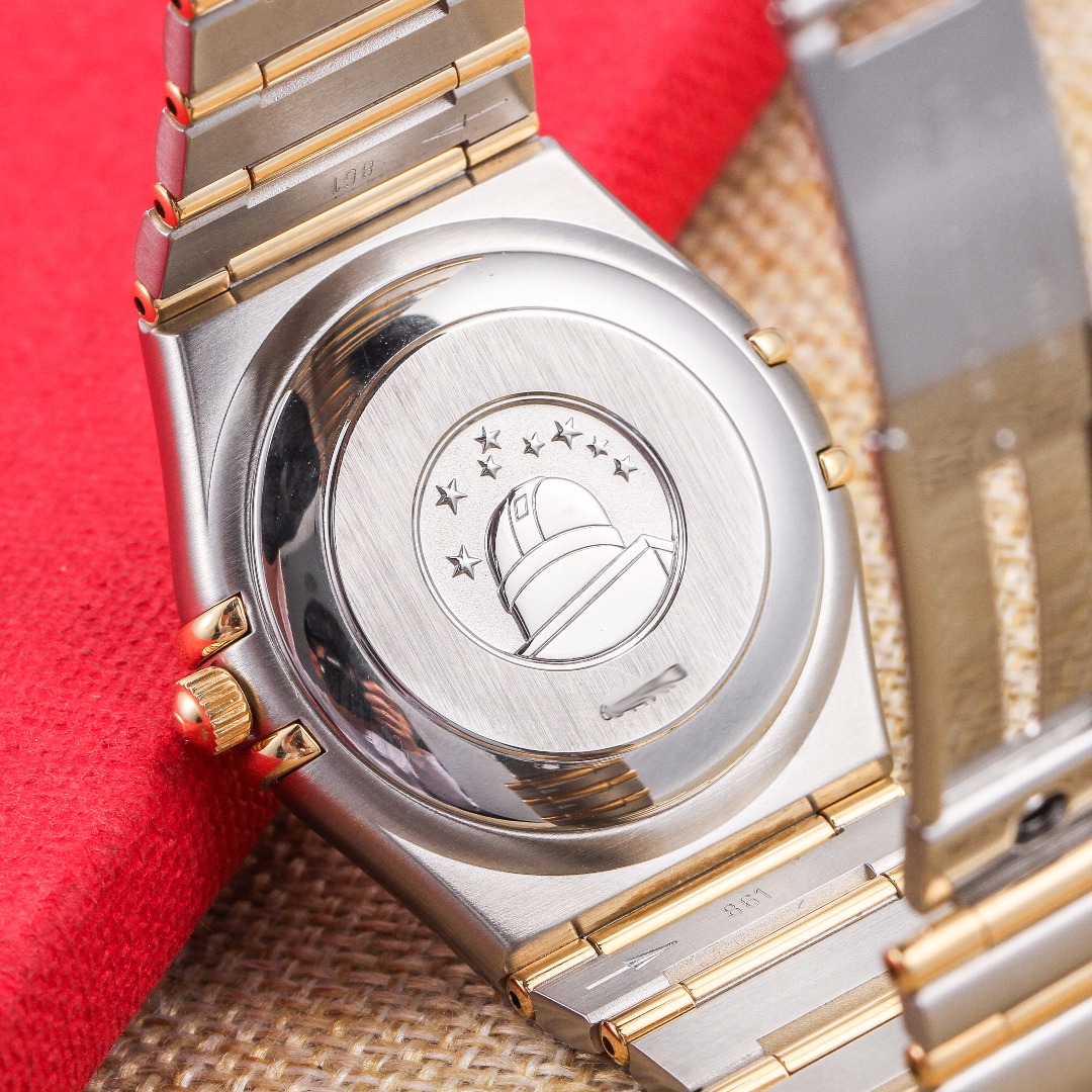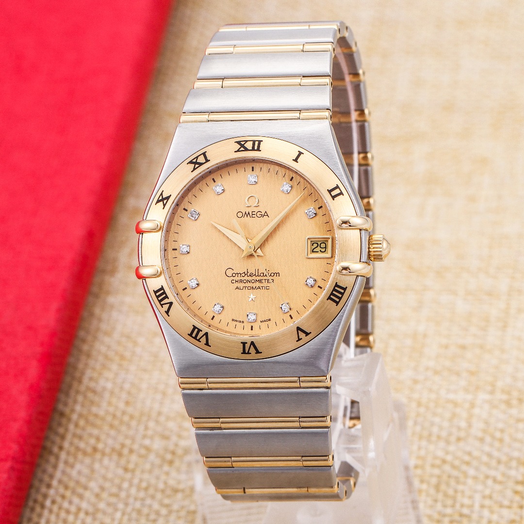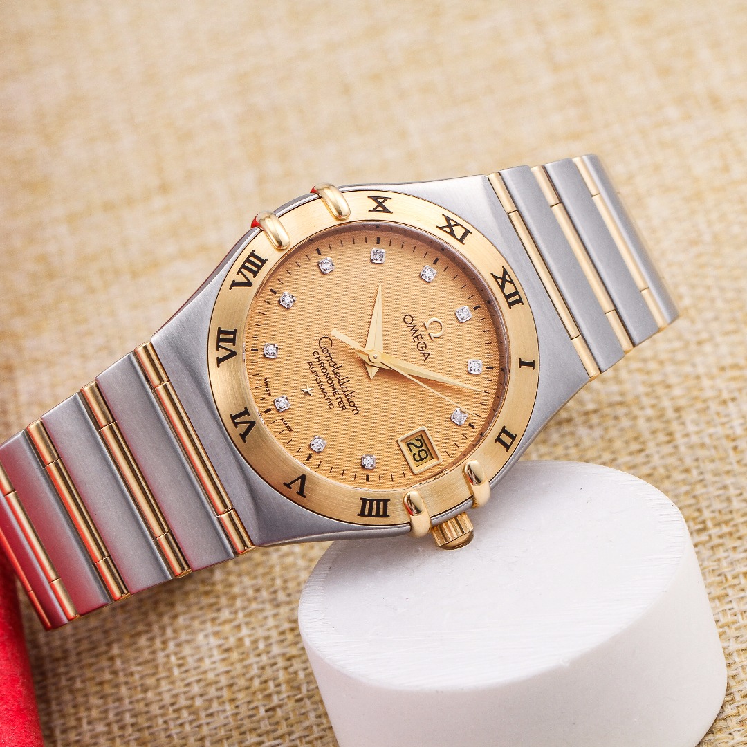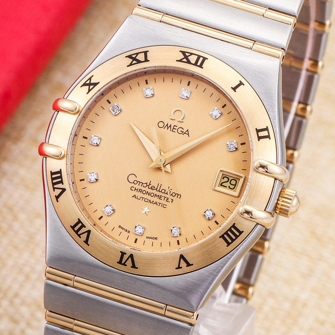 欧米茄星座系列1202.15.00,男款自动机械,35.5毫米表径,金色表盘,镶钻时标,18k黄金/精钢材质,近新原始品相,工价43500,现货好价