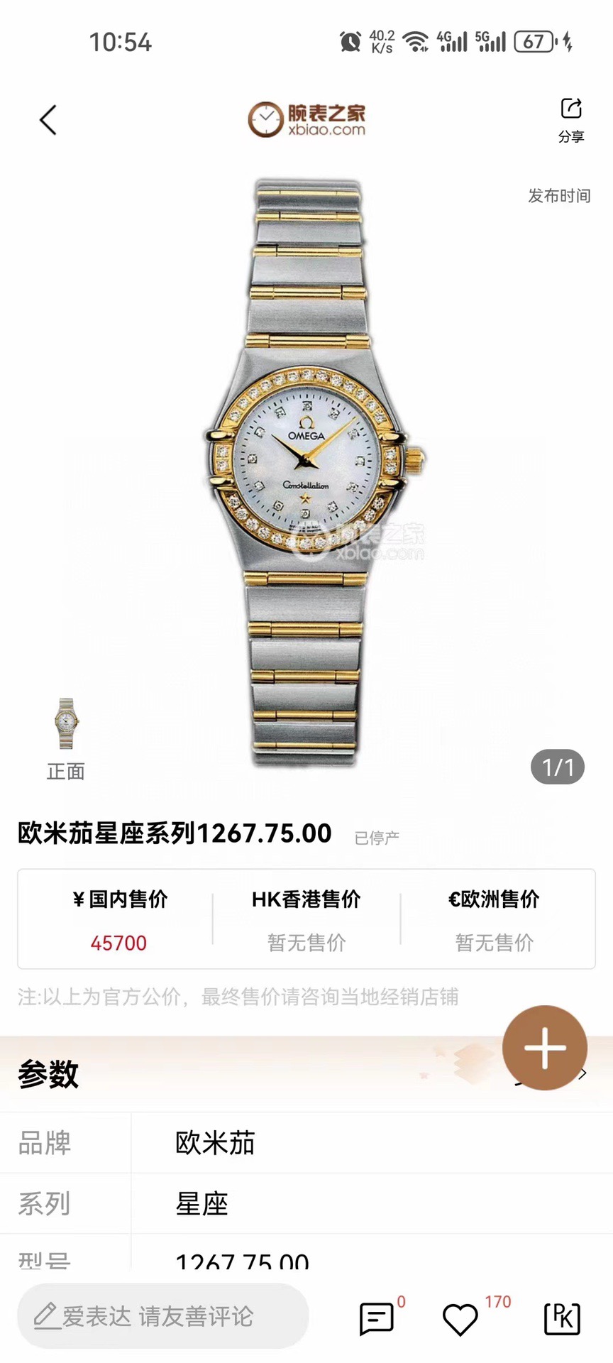 欧米茄 星座系列 1267.75.00 石英女士腕表 精钢+18k黄金材质 22.5mm 外圈镶钻 公价45700