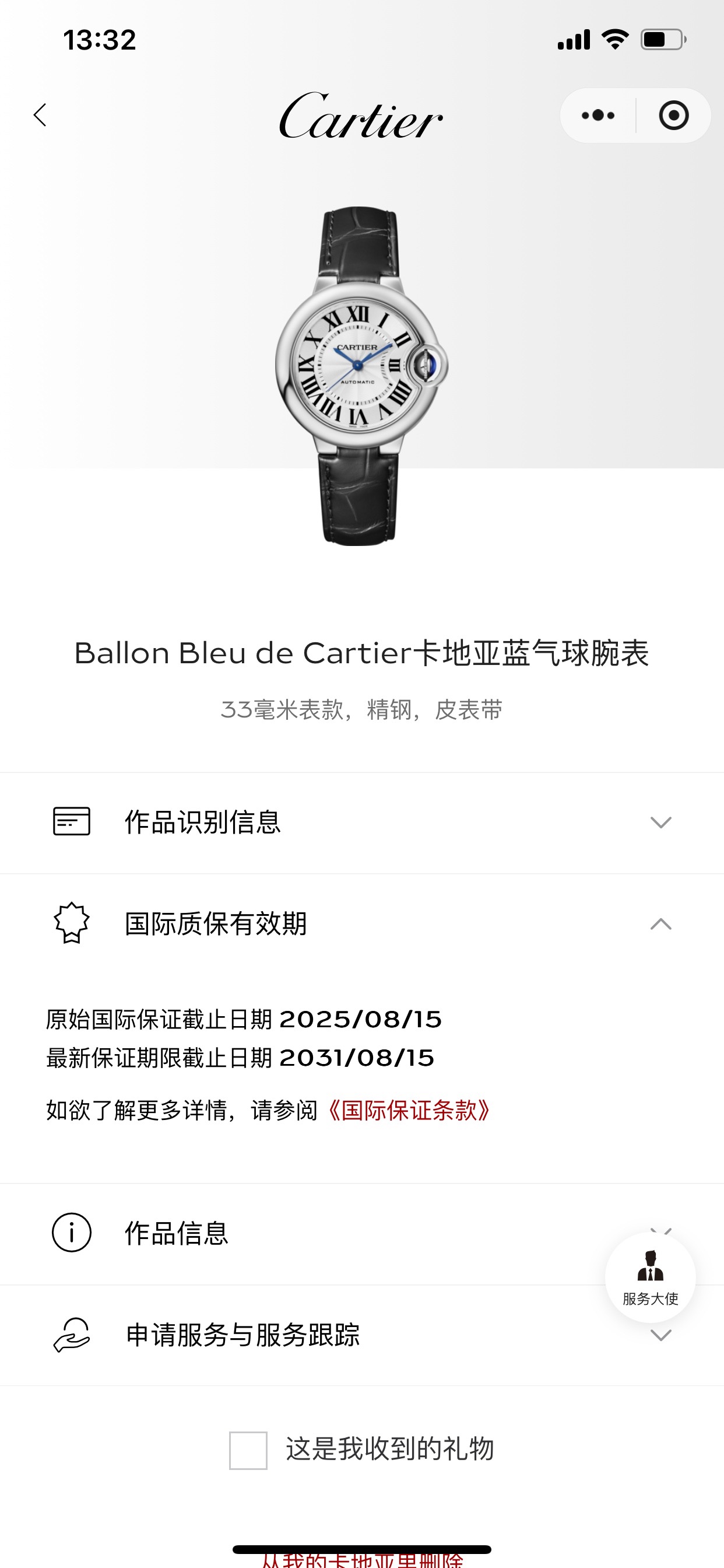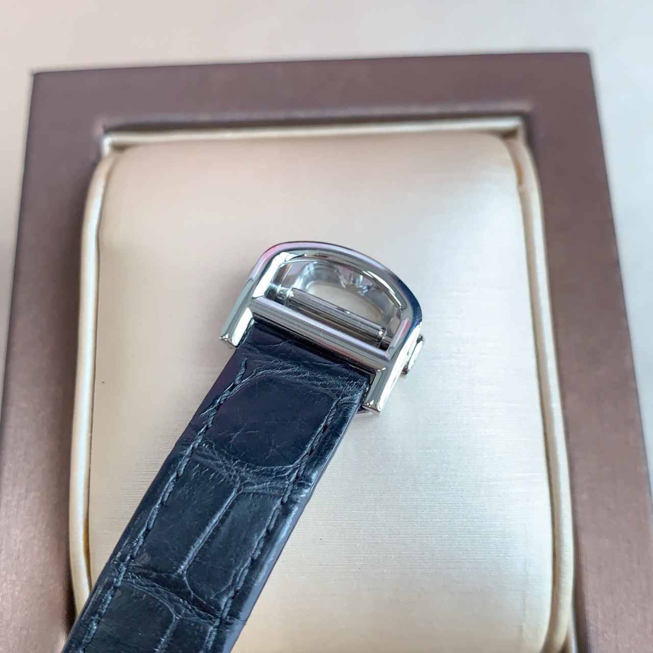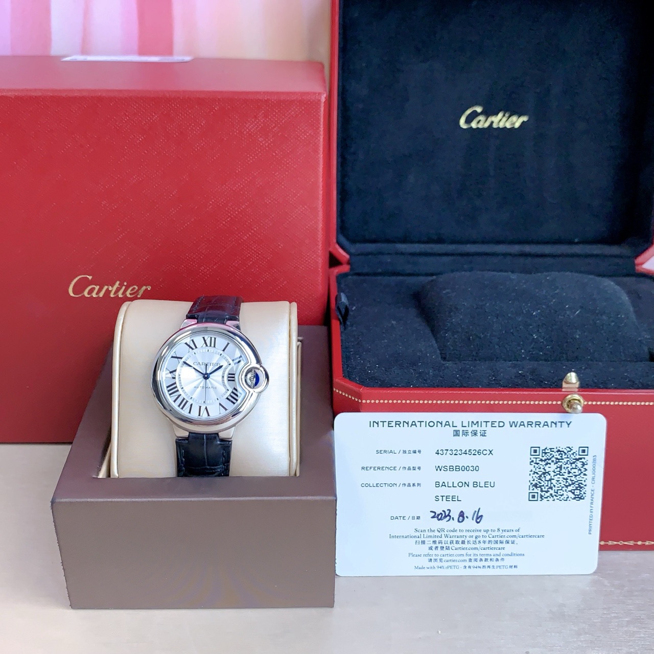 23年8月全套卡地亚蓝气球WSBB0030,自动机械机芯,表径33mm,表壳厚度9.96mm,镀银扭索雕纹珠光表盘,蓝宝石玻璃镜面,镶嵌一颗凸圆形合成尖晶石,鳄鱼皮表带,已延保,柜柜价44500~