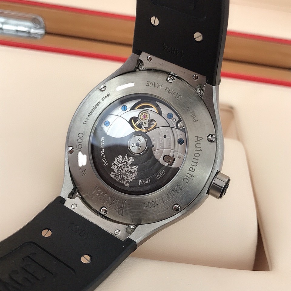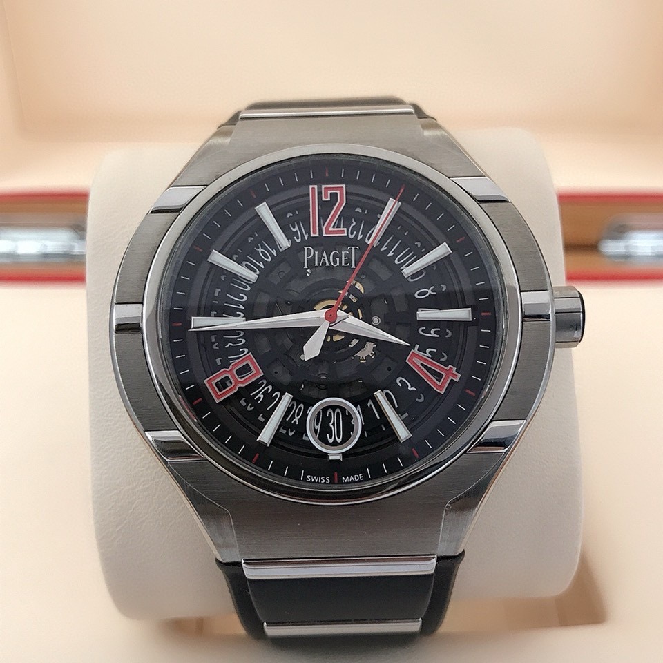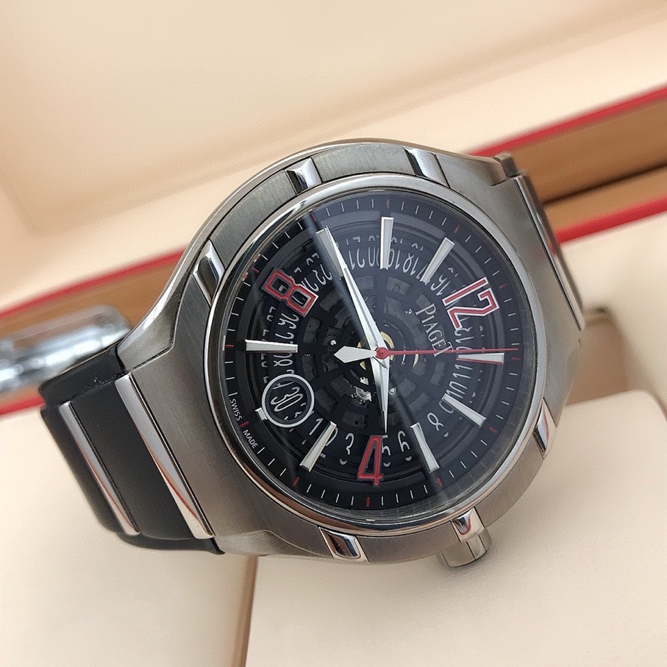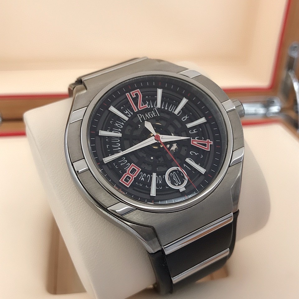 镂空款伯爵男表POLO系列G0A35010,钛金属/精钢材质,45mm表径,大日历窗显示,透底自动机械,专柜售价124000。