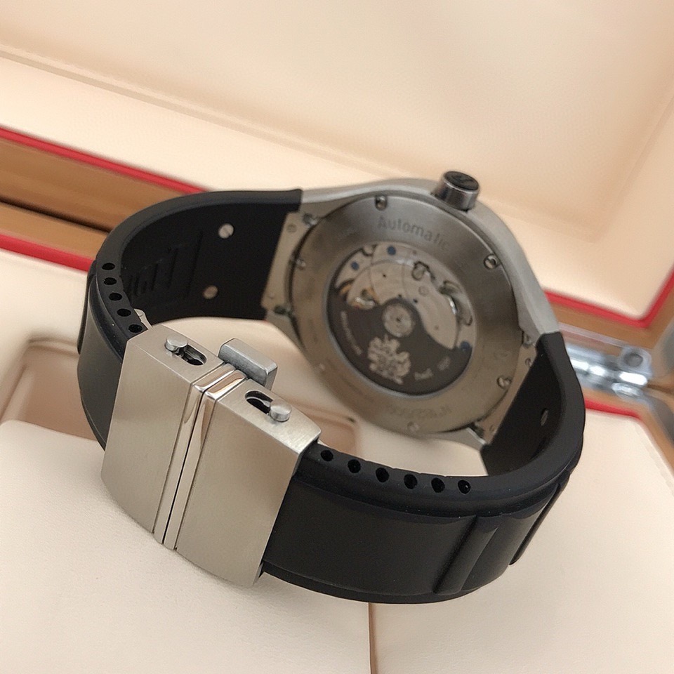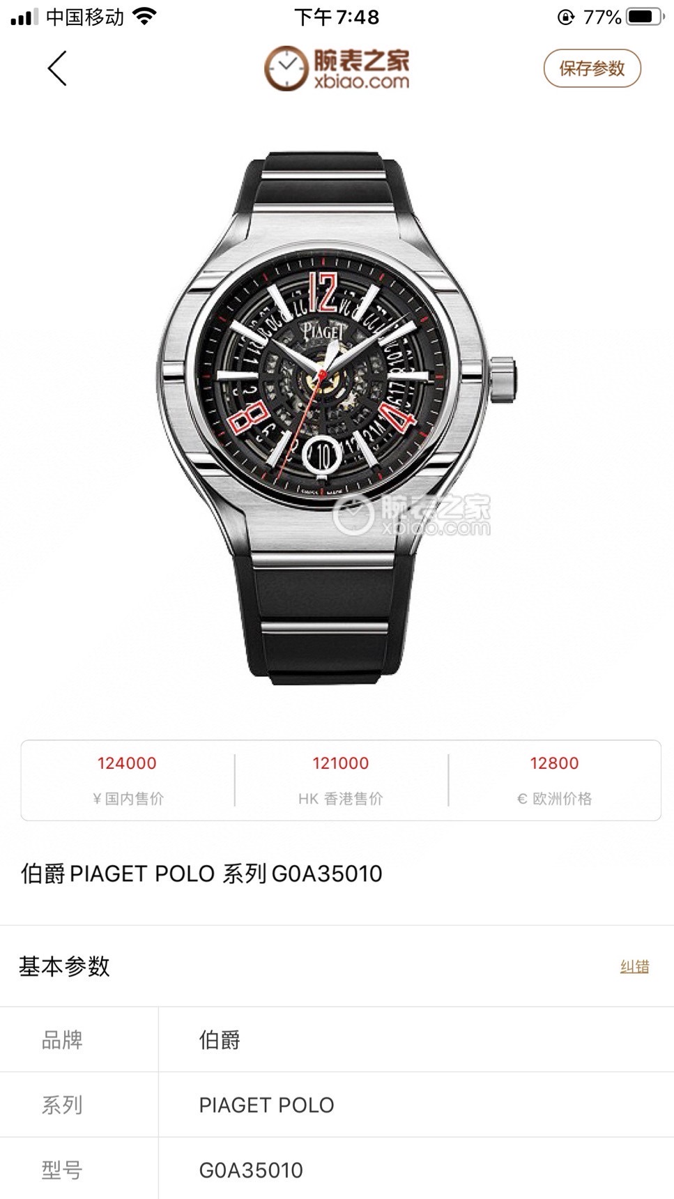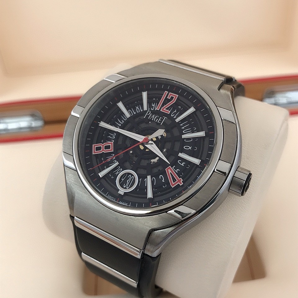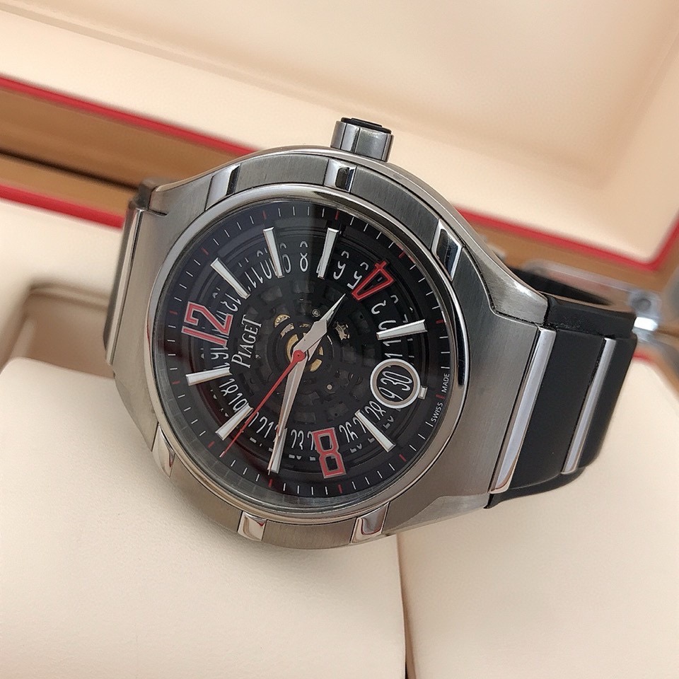 镂空款伯爵男表POLO系列G0A35010,钛金属/精钢材质,45mm表径,大日历窗显示,透底自动机械,专柜售价124000。