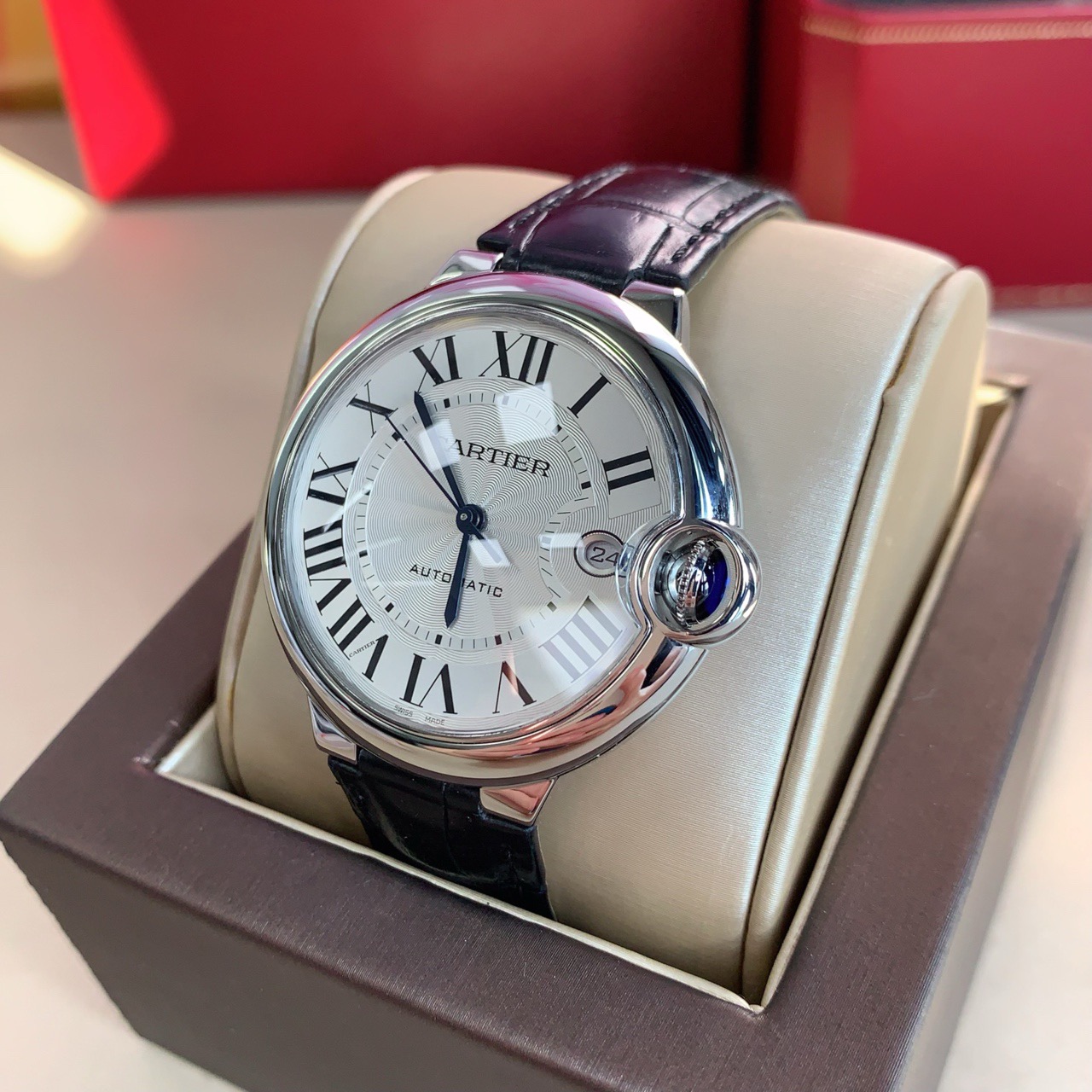 卡地亚 蓝气球WSBB0039,自动机械机芯,表径40mm,表壳厚度12.45mm,镀银扭索雕纹表盘,剑形蓝钢指针,蓝宝石玻璃镜面,镶嵌一颗凸圆形合成蓝色尖晶石,鳄鱼皮表带,已延保到2031年,专柜价52000~ 23年10月全套,现货好价!