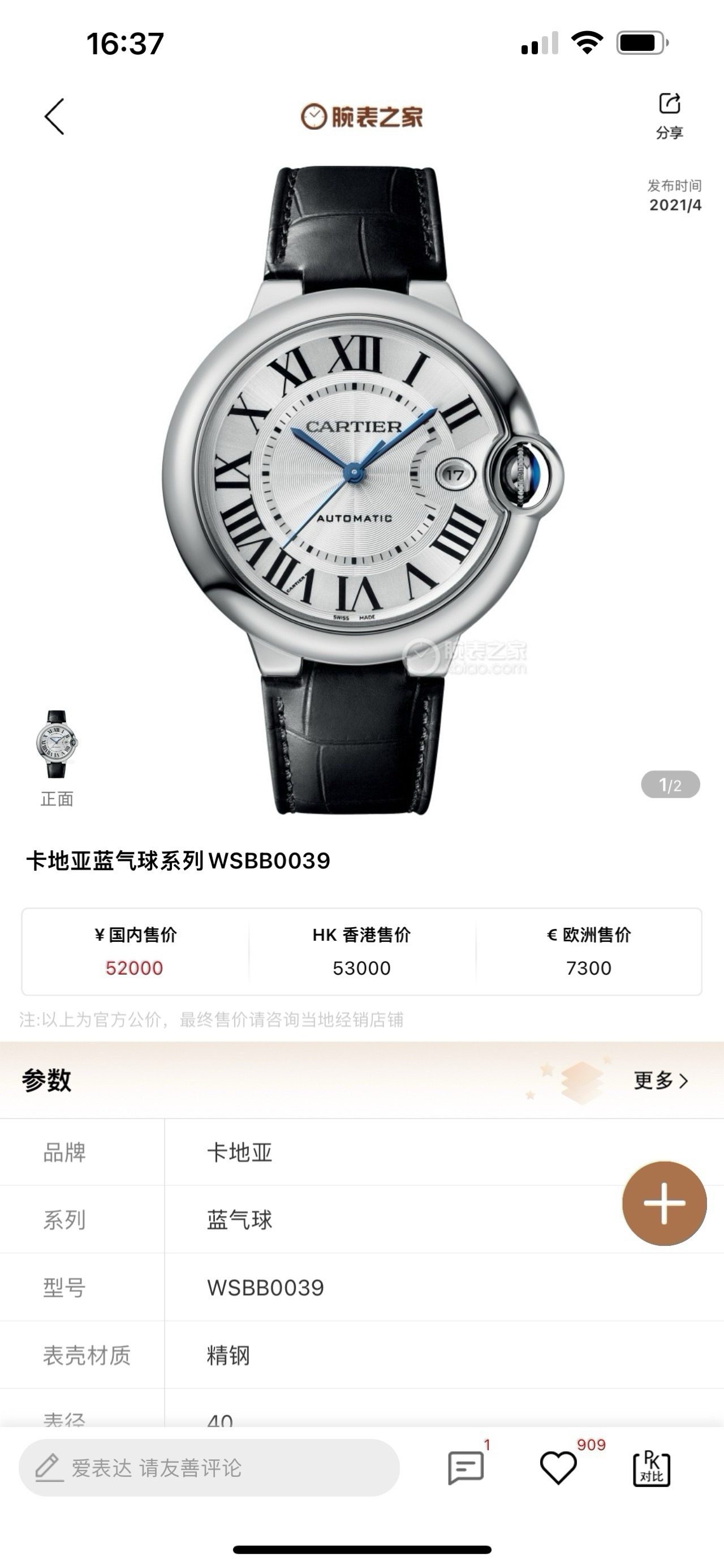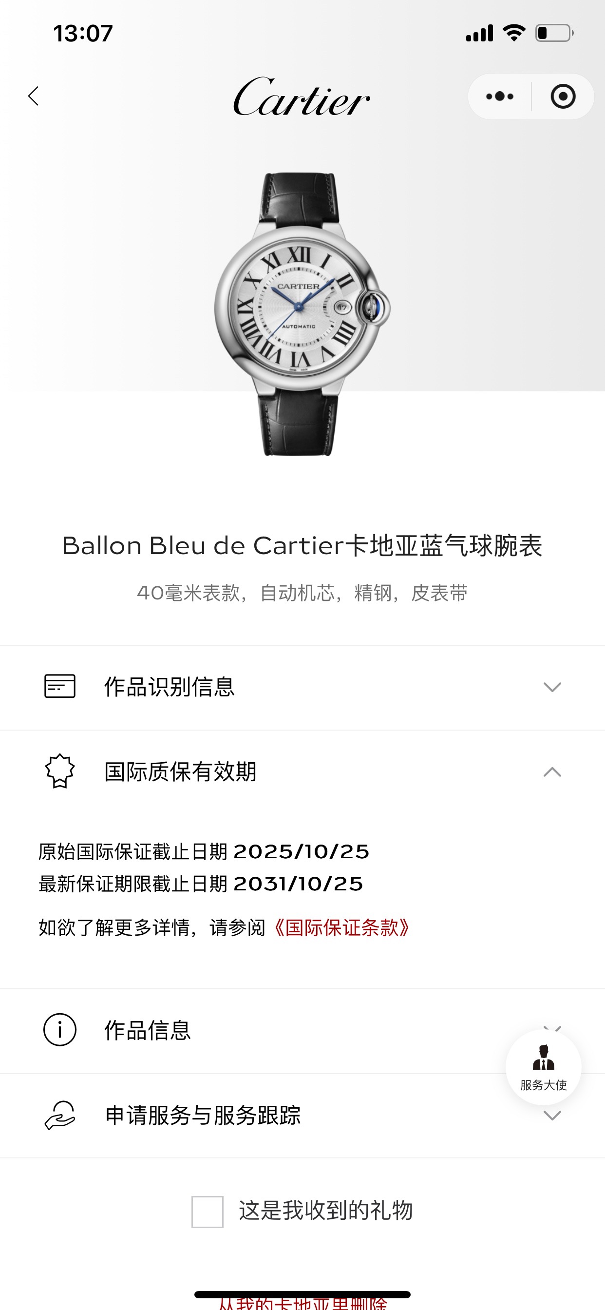 卡地亚蓝气球BALLON BLANCWSBB0039机械男性