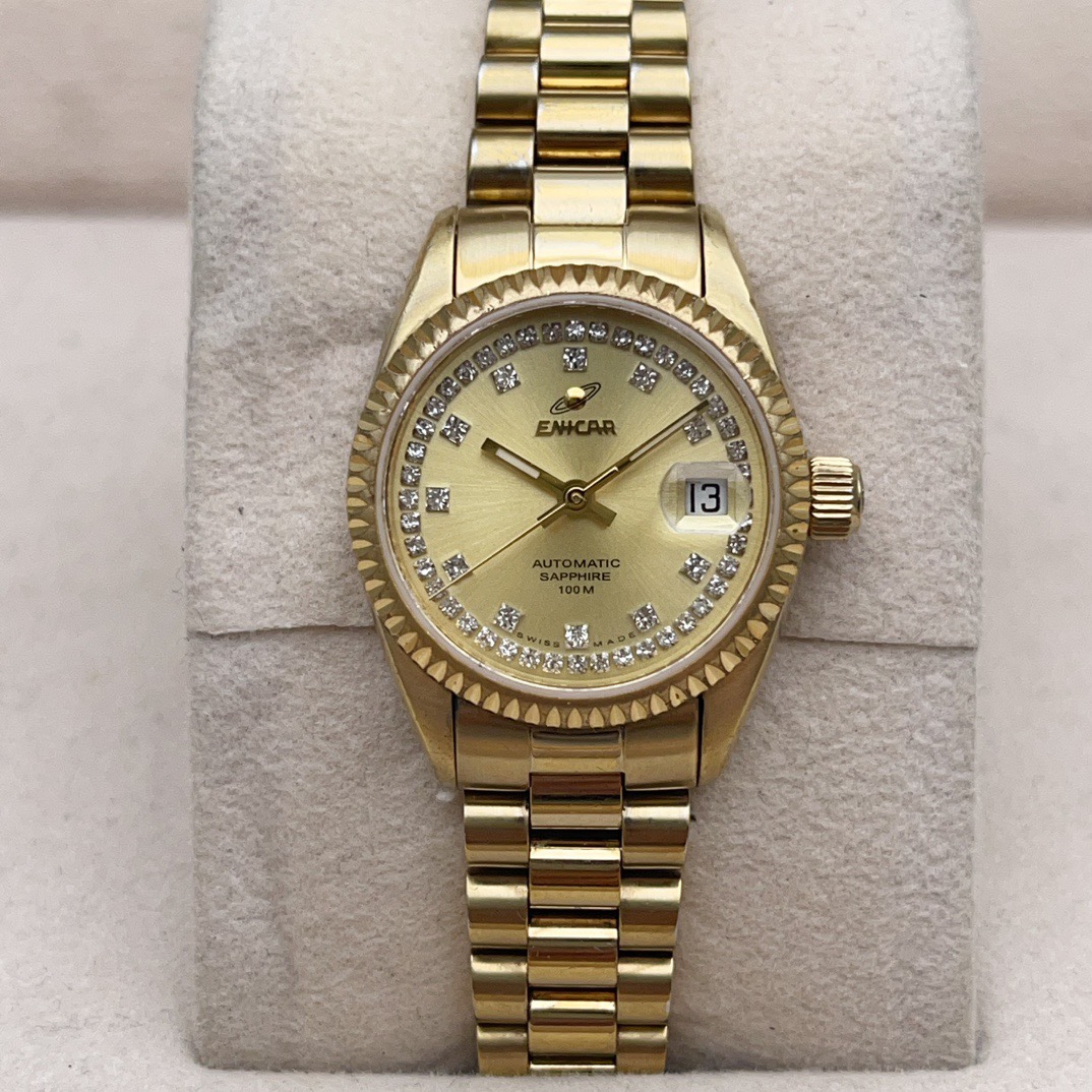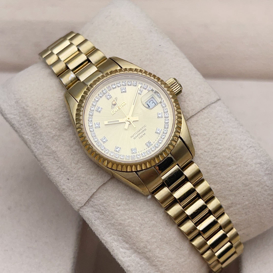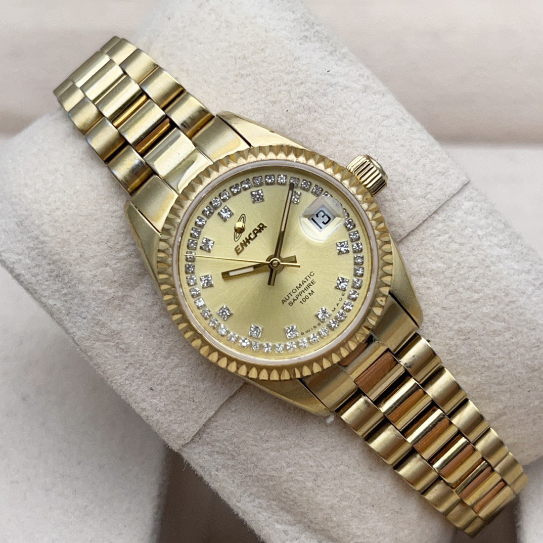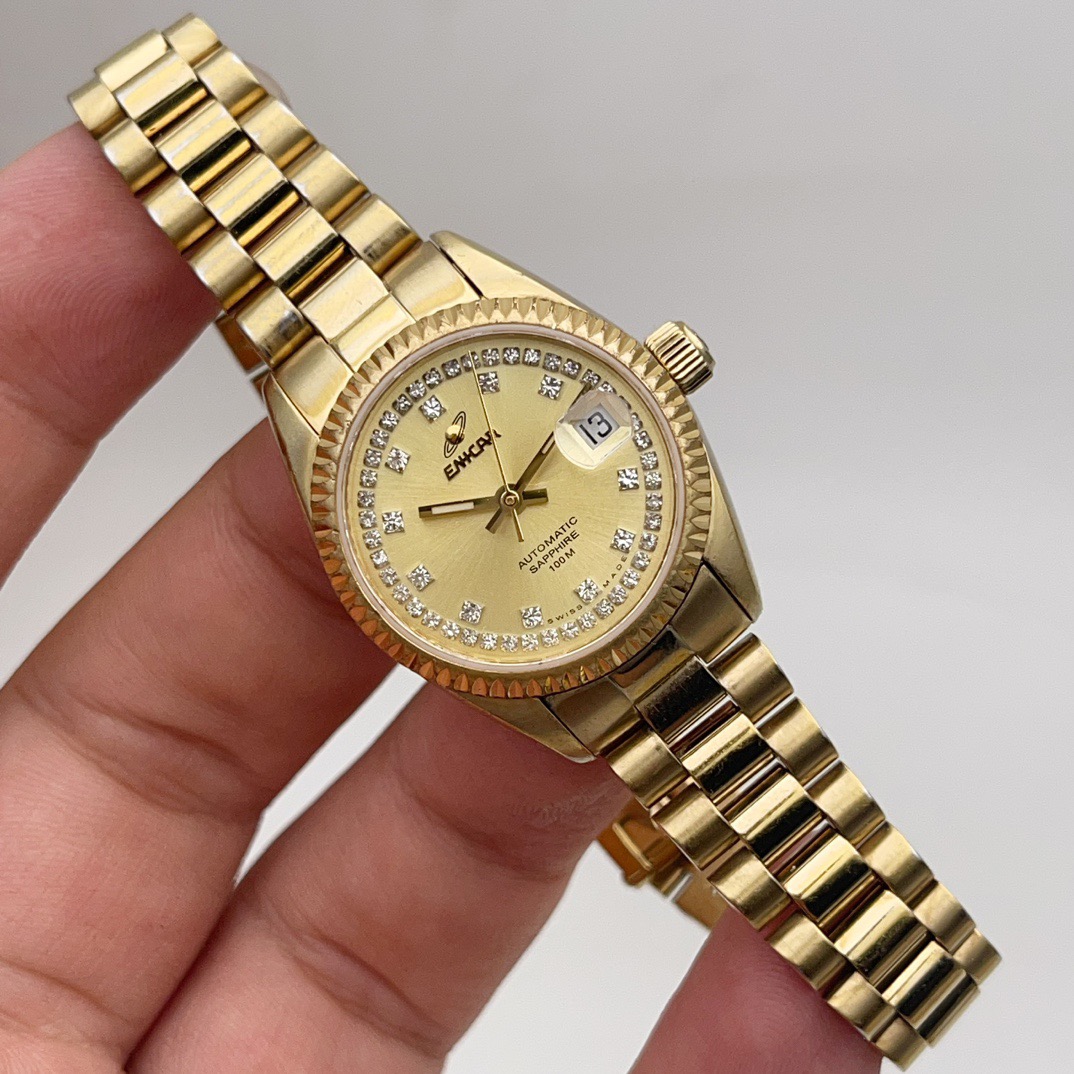 英纳格778.52.18女士自动机械腕表,表径25mm,整表采用镀金材质,黄色表盘,钻石刻度,表盘外圈镶钻,防水100米,非常百搭的一款腕表,整体商务休闲,适合任何场合佩戴,上身效果没得说气质杠杠的,特价