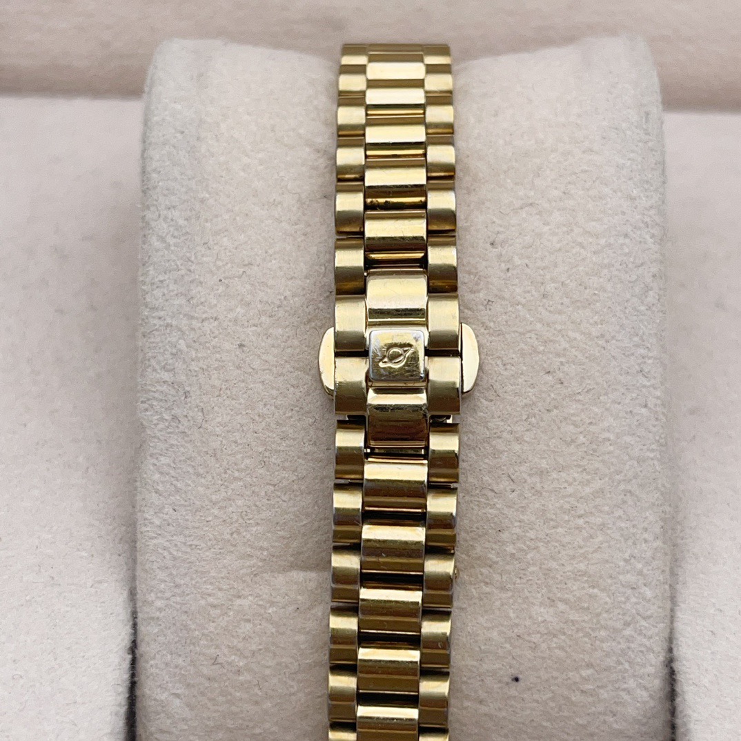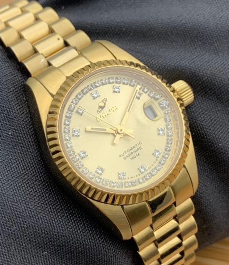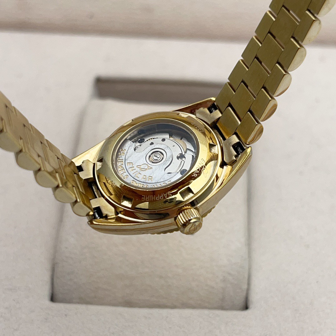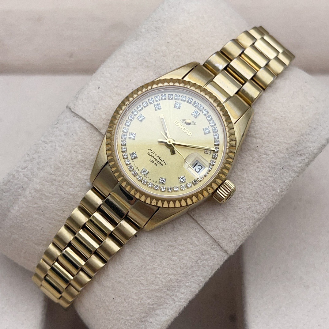 英纳格778.52.18女士自动机械腕表,表径25mm,整表采用镀金材质,黄色表盘,钻石刻度,表盘外圈镶钻,防水100米,非常百搭的一款腕表,整体商务休闲,适合任何场合佩戴,上身效果没得说气质杠杠的,特价