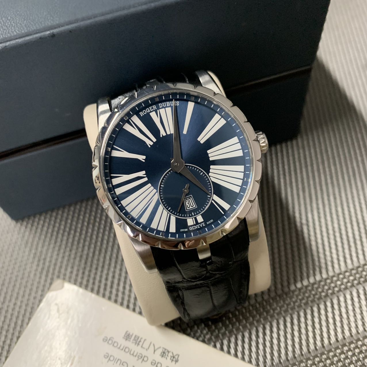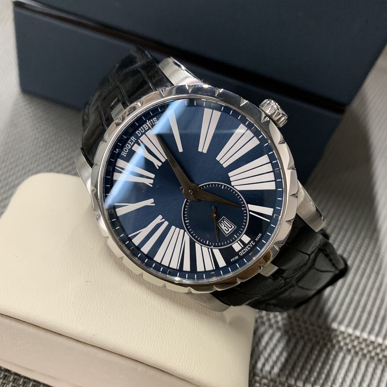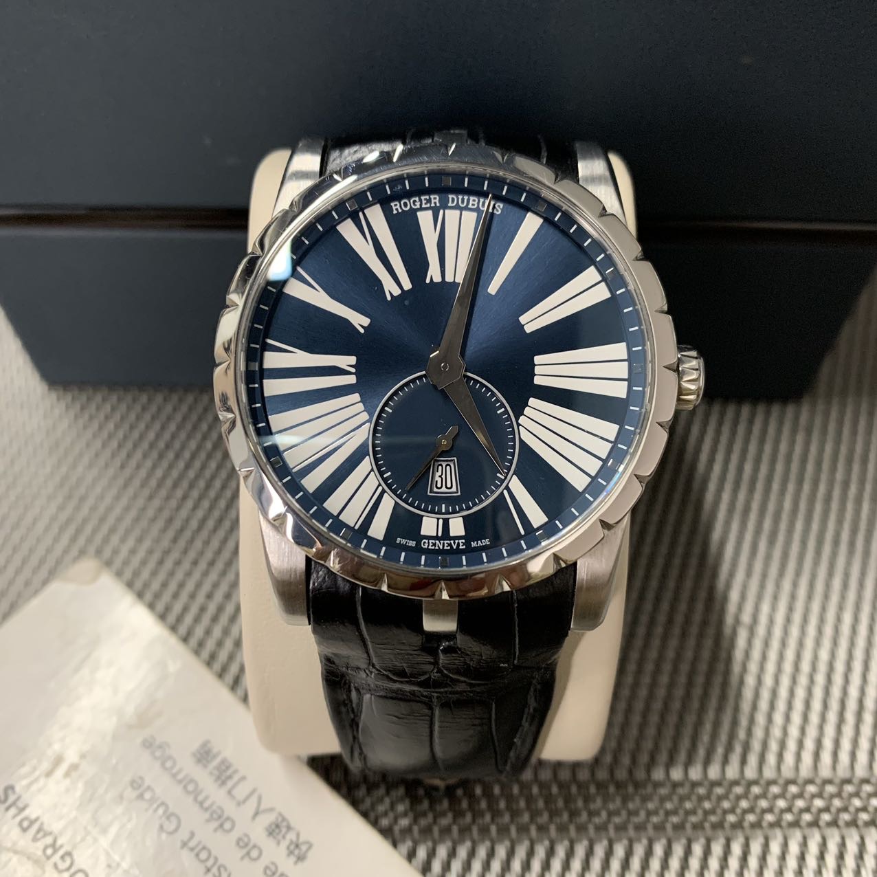 罗杰杜彼 王者系列机械男表,公价10.8万,表径42mm,单表 极品成色97新,质感放射纹蓝面,大气罗马刻度,独立秒针设计 搭载自产RD830机芯,K金陀,携刻日内瓦印记。